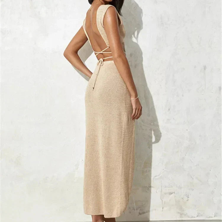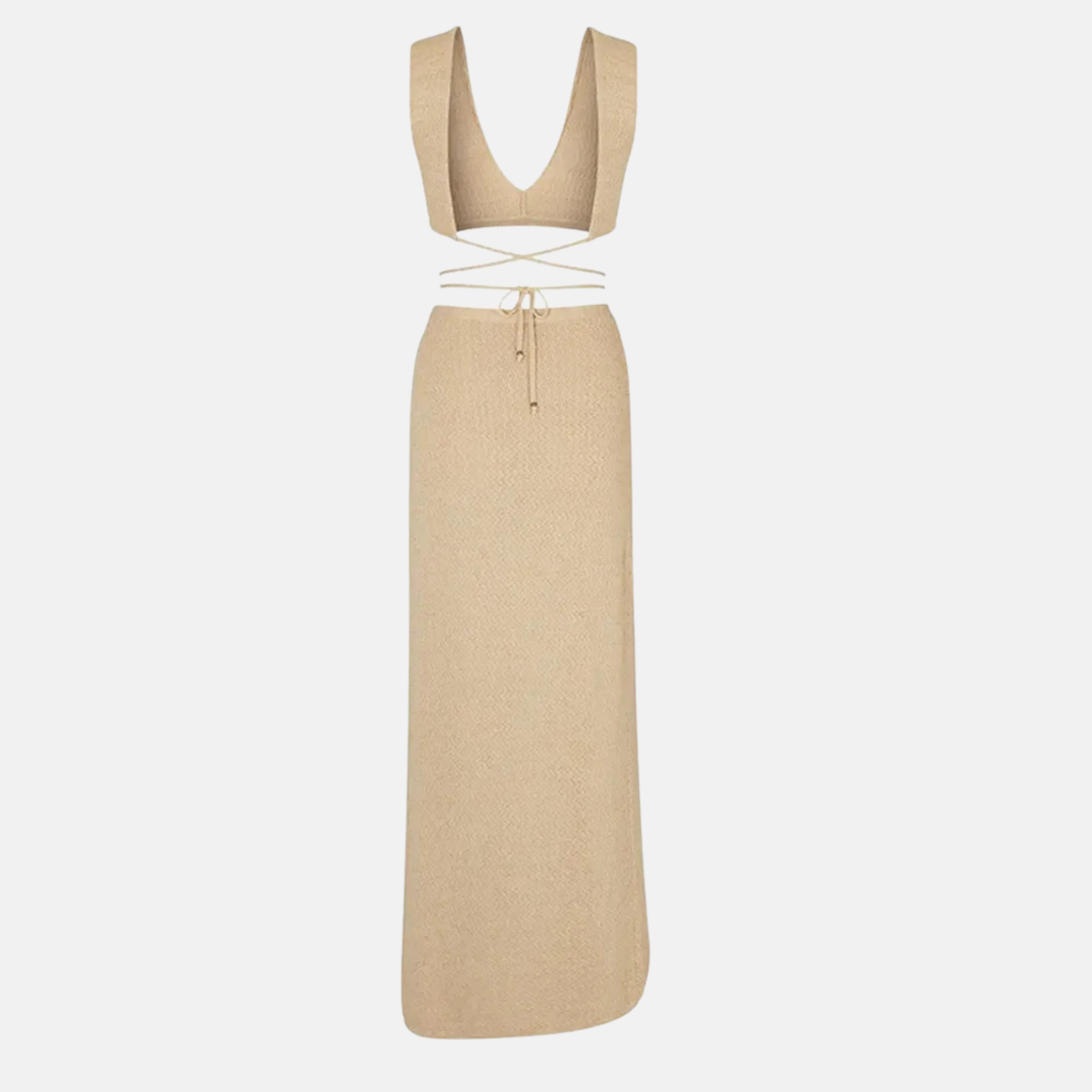 Üst kısmındaki çapraz ip detayı, feminenliği vurgularken minimal tasarımı cesur bir stile dönüştürür. Yüksek yırtmaçlı eteği ise adım attığınız her anda zarafetle akarken, özgüvenli bir duruş sergiler.