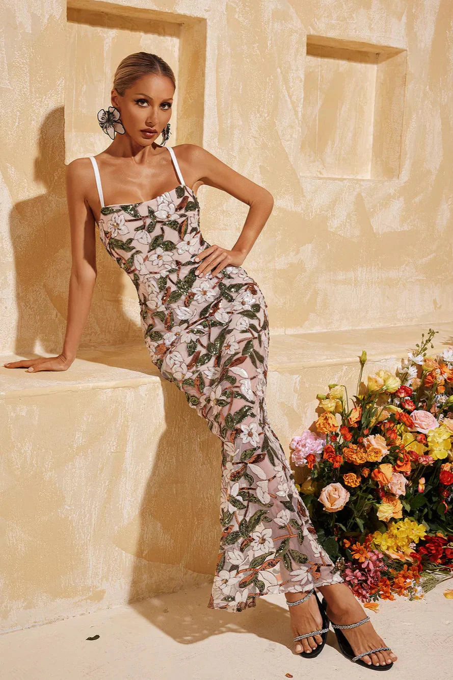 Abigail İnce Askılı Çiçek Pul İşlemeli Maxi Elbise ile stilini zirveye taşı!