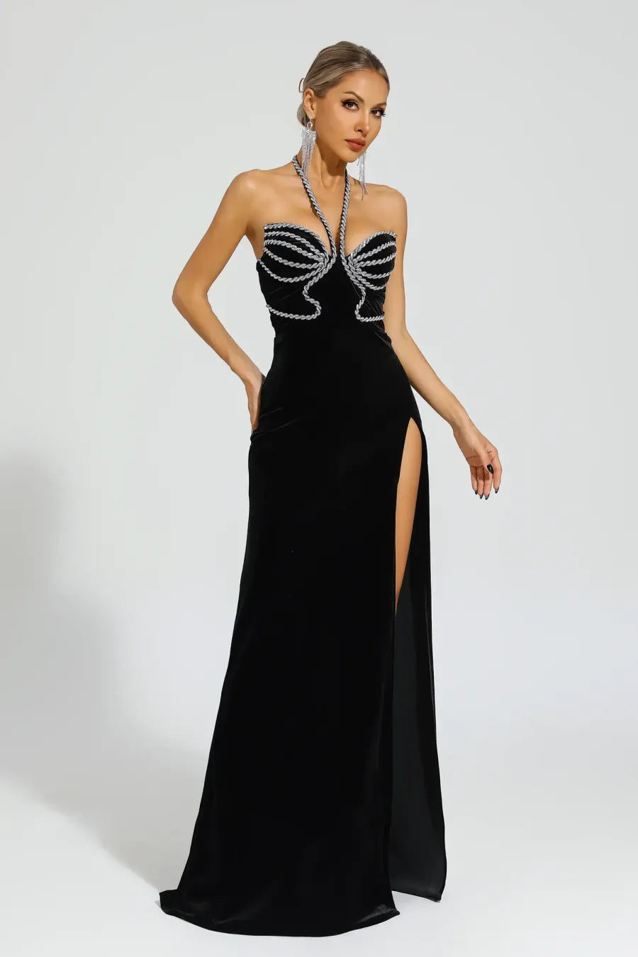 Alston Siyah Pırlanta Boyundan Bağlamalı Uzun Elbise