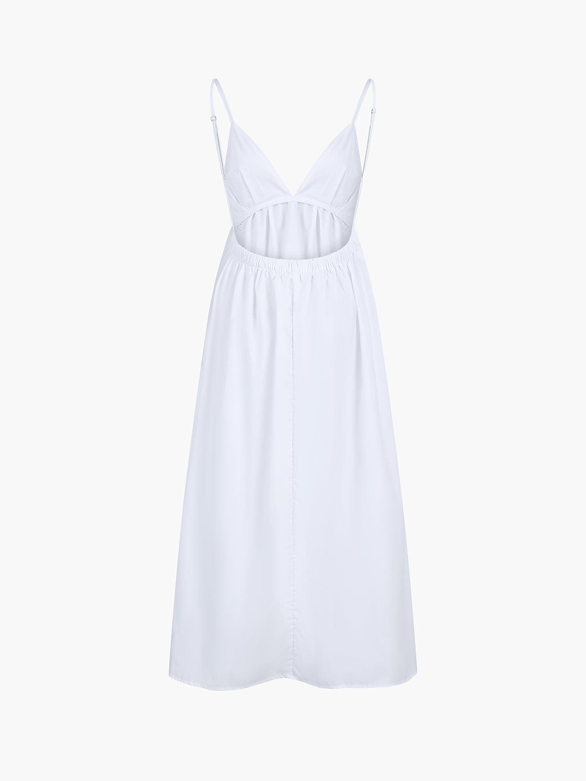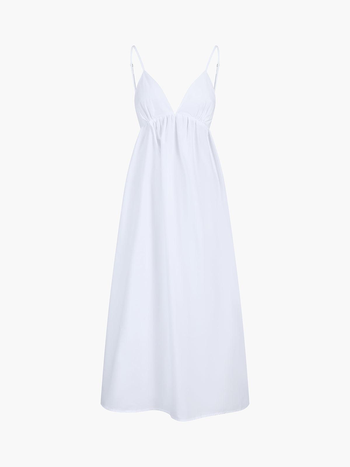 Zarif ve ferah tasarımıyla yaz günlerinin favorisi olacak bu beyaz maxi elbise, ince askıları ve derin V yaka detayıyla şıklığı ve konforu bir arada sunuyor. Şehirde veya tatilde stil sahibi görünümünüzü tamamlayın!