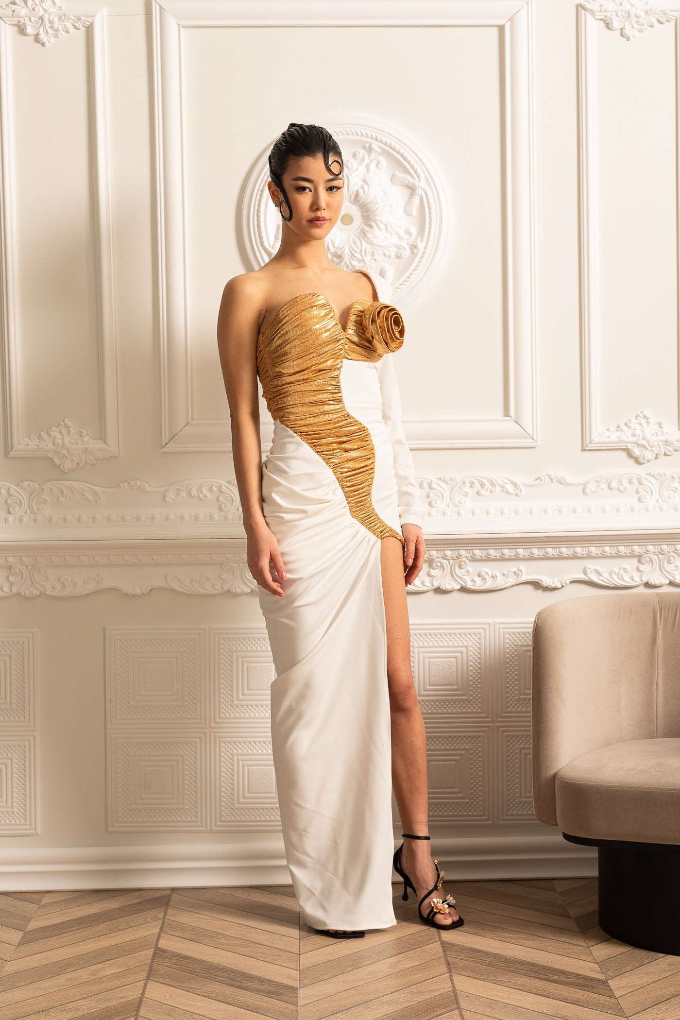 Büzgülü Altın Detaylı Beyaz Asimetrik Abiye Elbise