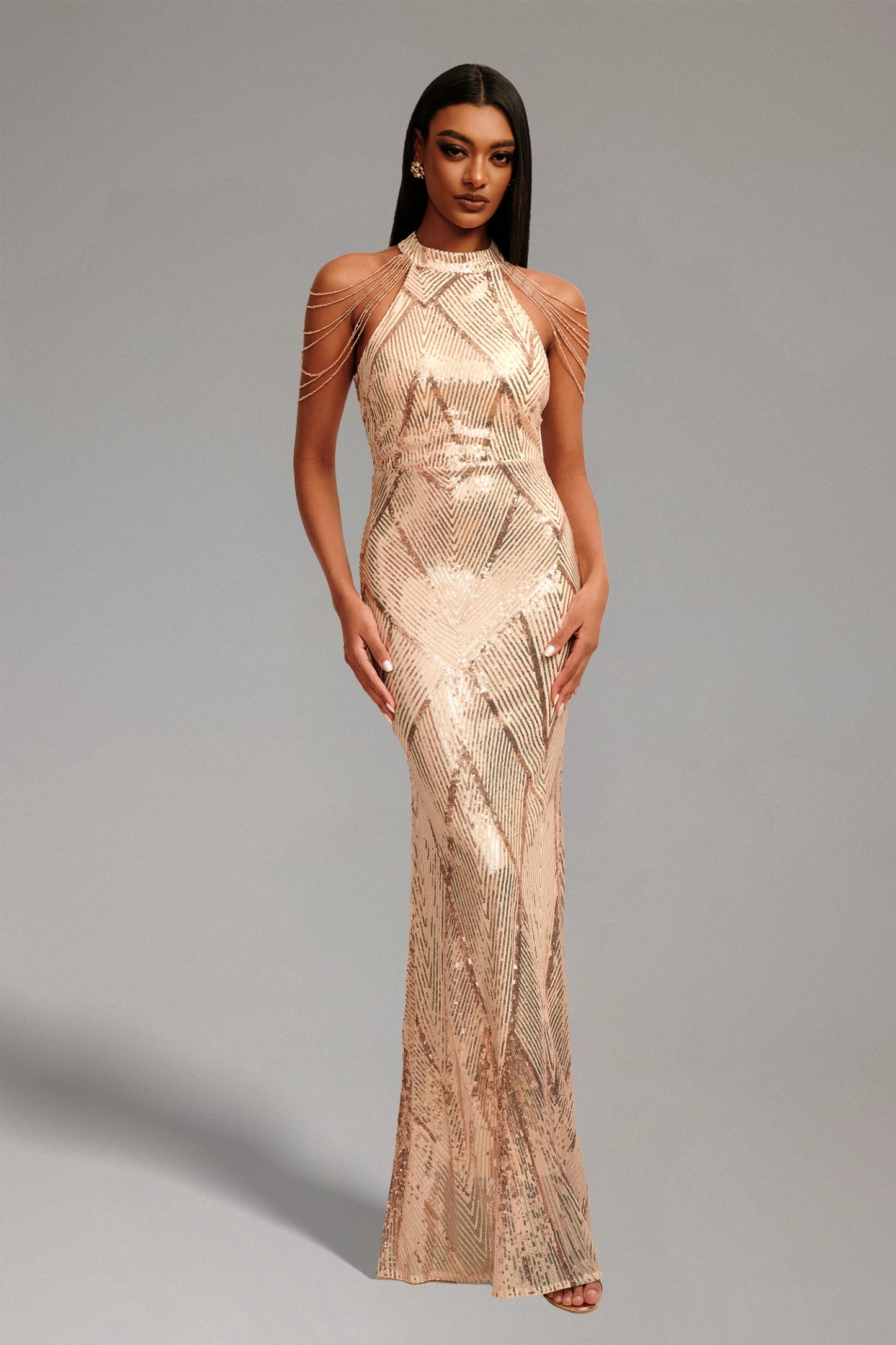 Her detayı ile göz kamaştırıcı olan bu payetli maxi elbise, gösterişli davetlerde tüm gözleri üzerinize çekecek! Yüksek kalite gümüş payetlerle süslü, boydan boya uzanan bu elbisenin halter yaka üst kısmı ve vücudu saran etek kısmı sizi adeta bir yıldız gibi parlatır. Omuzlarındaki gümüş zincir detaylar ise şıklığınıza şıklık katar.