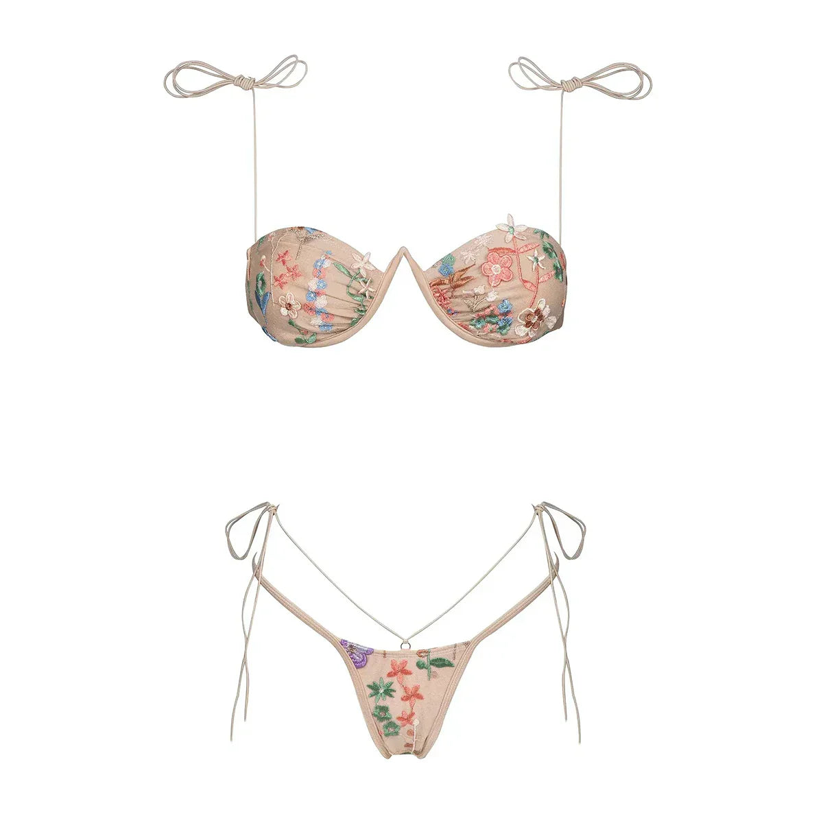 Bu zarif ve feminen bikini takımı, romantik çiçek desenleri ve sofistike kesimiyle sezonun favori parçası olmaya aday. Balenli üst kısmı göğüsleri toparlayarak şekillendirirken, ince askıları ve vücudu saran bağlama detaylarıyla şıklığı ön plana çıkarıyor. Minimal alt parçası ise zarif formu ve yüksek kesimi sayesinde vücut proporsiyonunu mükemmel biçimde dengeliyor.