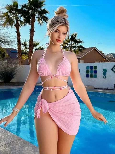 Blossom Bikini Takımı, cesur ip detayları ve feminen formu ile plaj stilinizi zirveye taşıyor. Üçgen kesimli bikini üstü ve belden bağlamalı alt parçası vücudu sararken, takımın parçası olan mini pareo romantik ve havalı bir tamamlayıcı olarak öne çıkıyor.