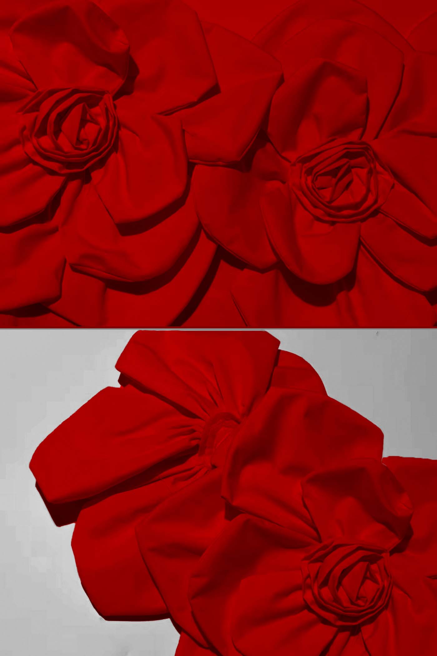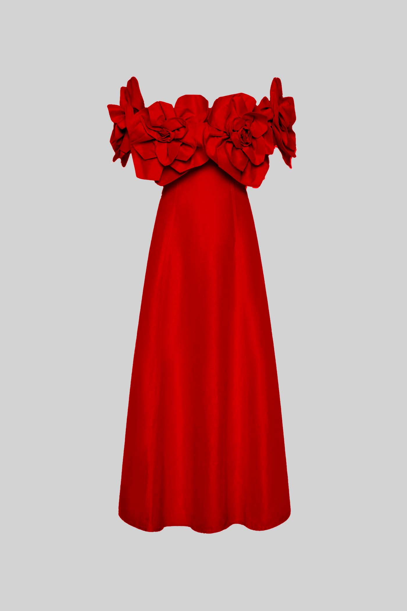 Kırmızı Omuzdan Düşük Midi Elbise, Büyük Kumaş Çiçek Detayları ile