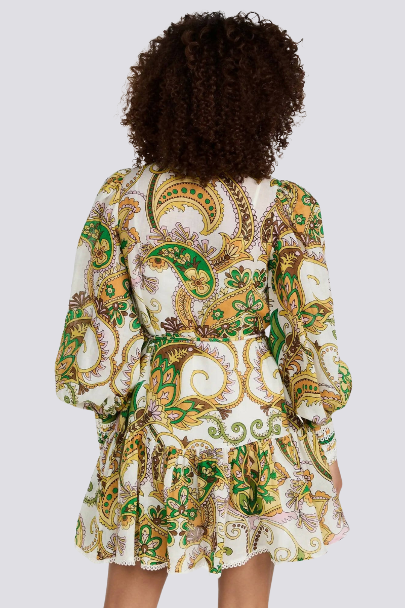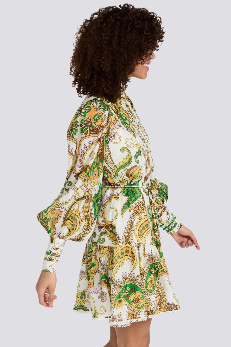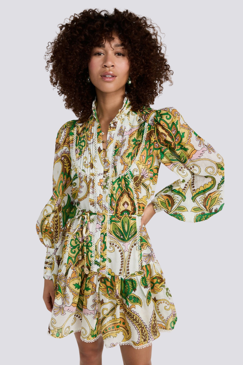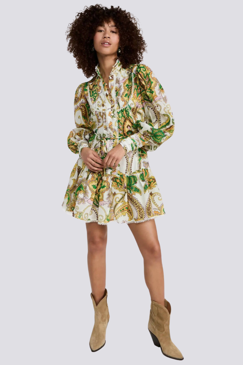 Bu benzersiz baskılı yüksek yakalı gömlek elbise, rahat kesimi şık ayrıntılarla birleştiriyor. Tek sıra düğmeler sofistike bir dokunuş katarken, kravatlı bel siluetinizi güzelleştirerek hoş bir görünüm sağlar.