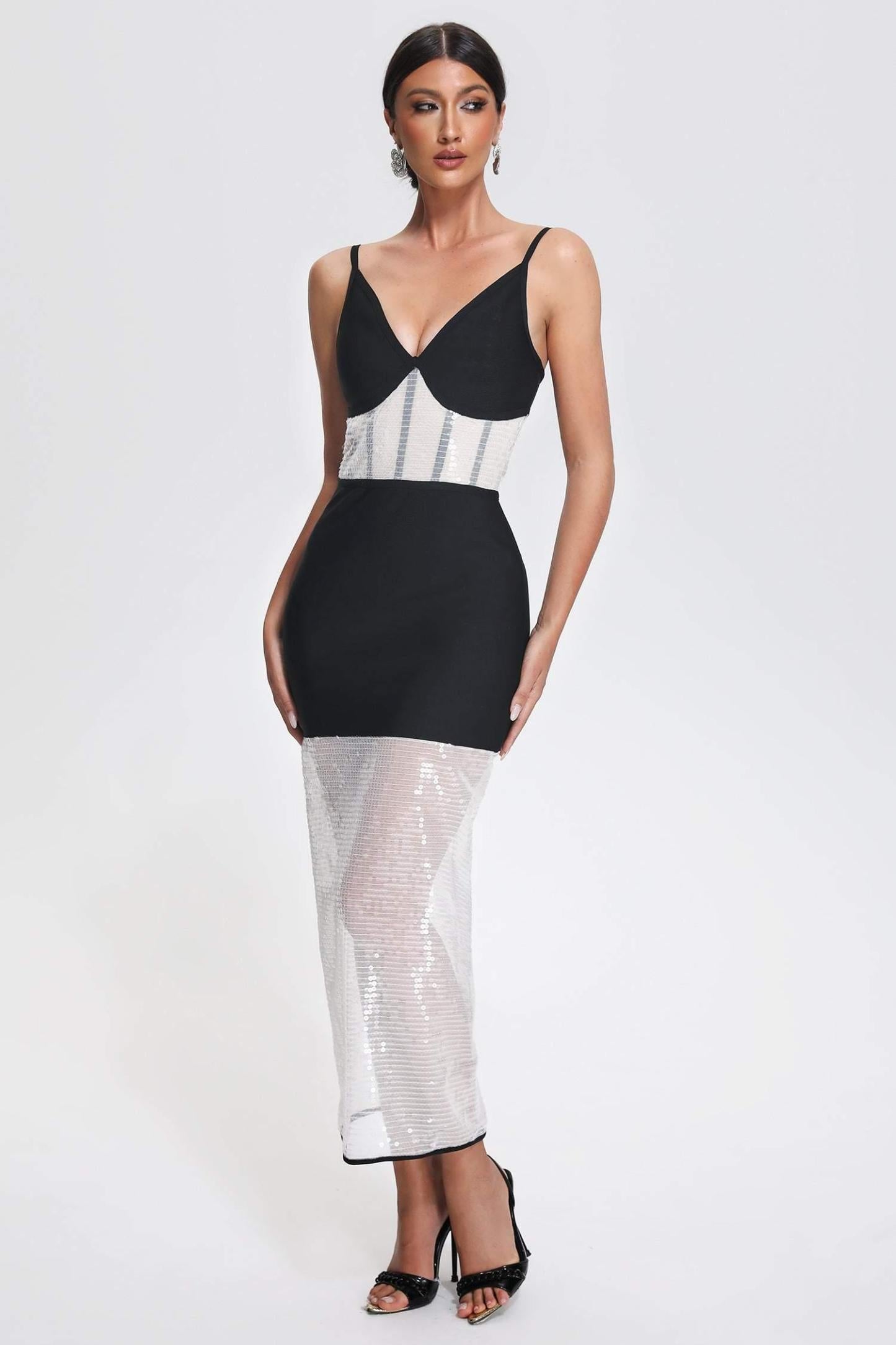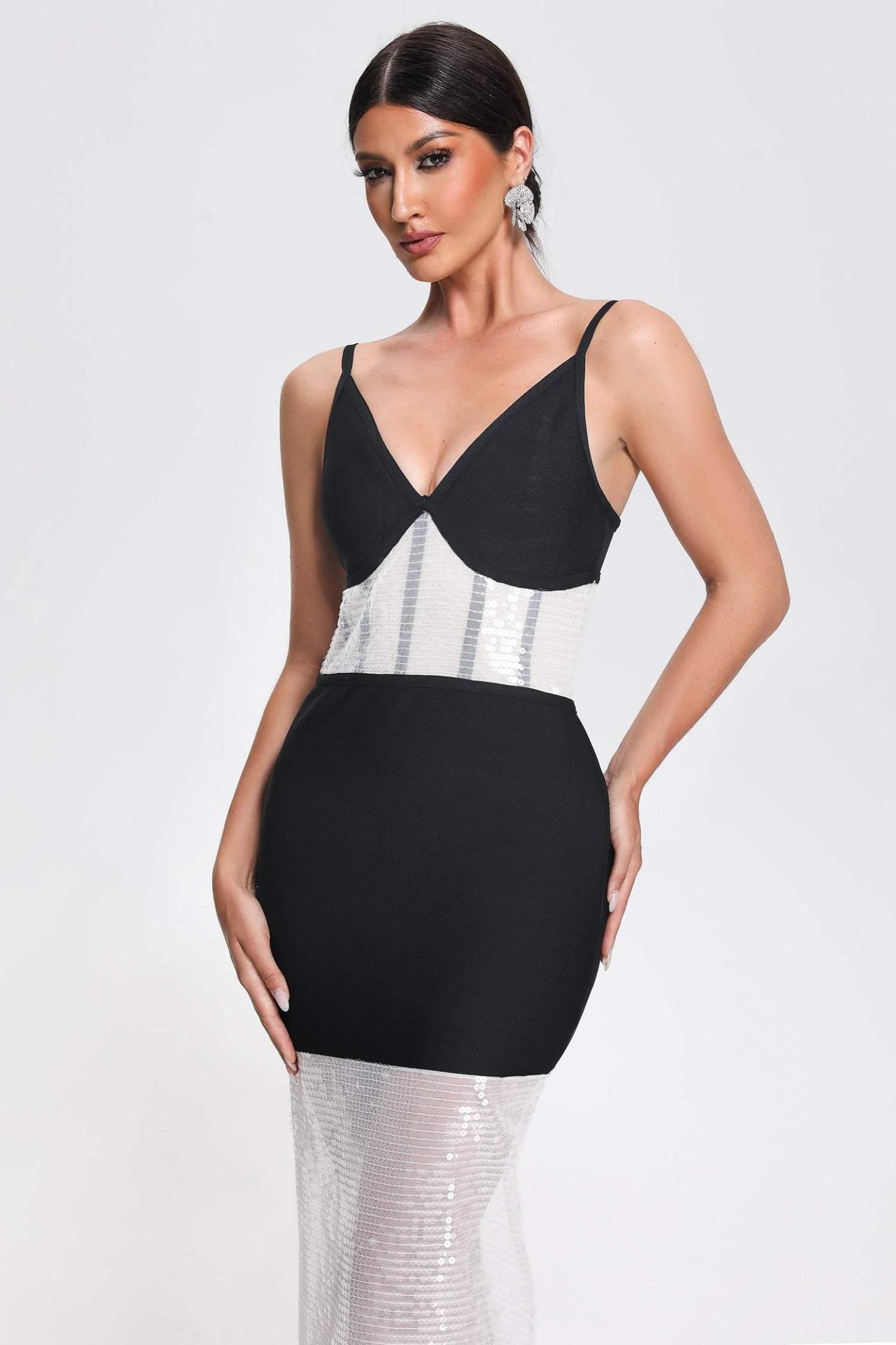 Moda dünyasına özgün bir dokunuş sunan Devonne Payetli Midi Bandaj Elbise, zarafetin ve sofistike bir görünümün simgesidir. Kusursuz bir uyum ve siluet çizgisi sunan bu elbise, özellikle özel günlerinizde sizi ön plana çıkaracak.