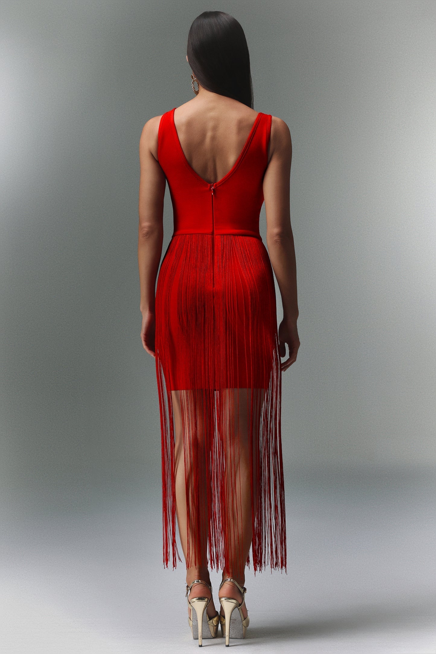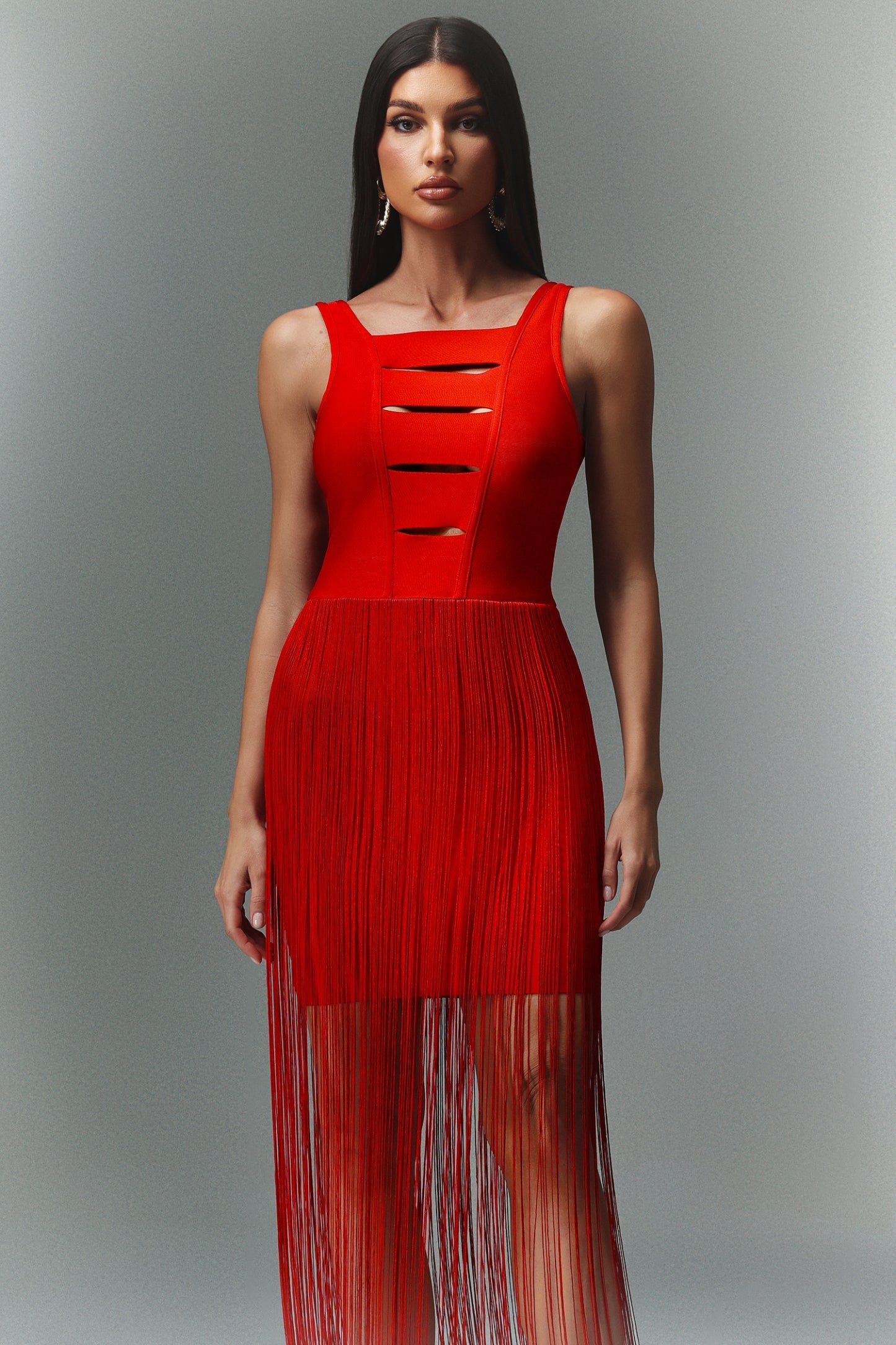 Özel üretim Boyun Detaylı Püsküllü Bandaj Midi Elbise, vücut hatlarınıza mükemmel uyum sağlayarak zarafeti ve şıklığı ön plana çıkarır. Göğüs, bel ve kalça bölgelerindeki esnek yapı ile her bedene uygun konfor sunar. Gece davetlerinden kutlamalara, özel günlerinizde fark yaratacak bu elbise, minimalist tasarımı ile dikkat çeker.