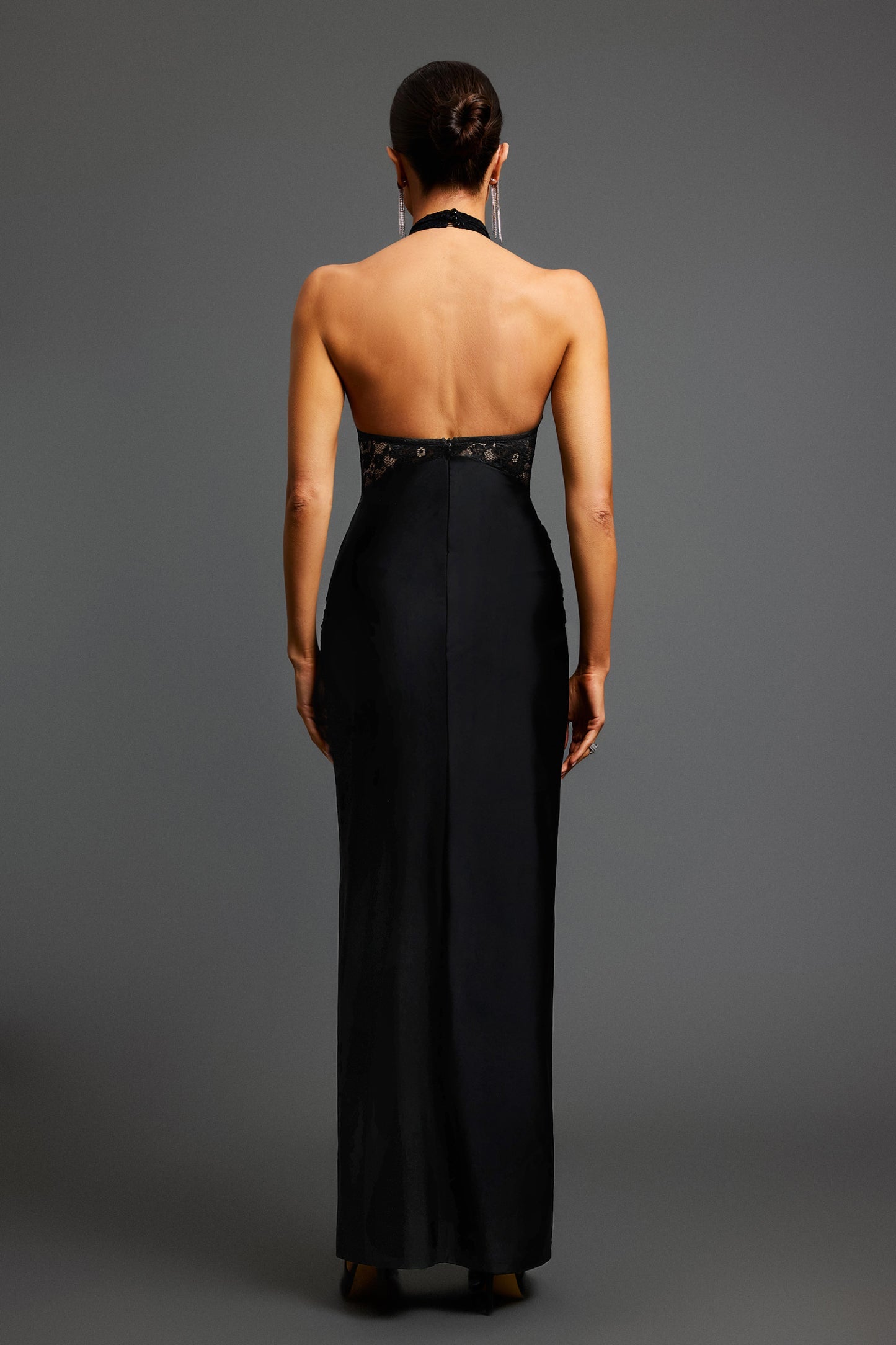 Üst bölümündeki özel boyalı dantel detaylarıyla göz kamaştırıcı bir tasarım sunan bu halter yaka maksi elbise, zarif gece davetleri ya da özel günler için biçilmiş kaftan.
