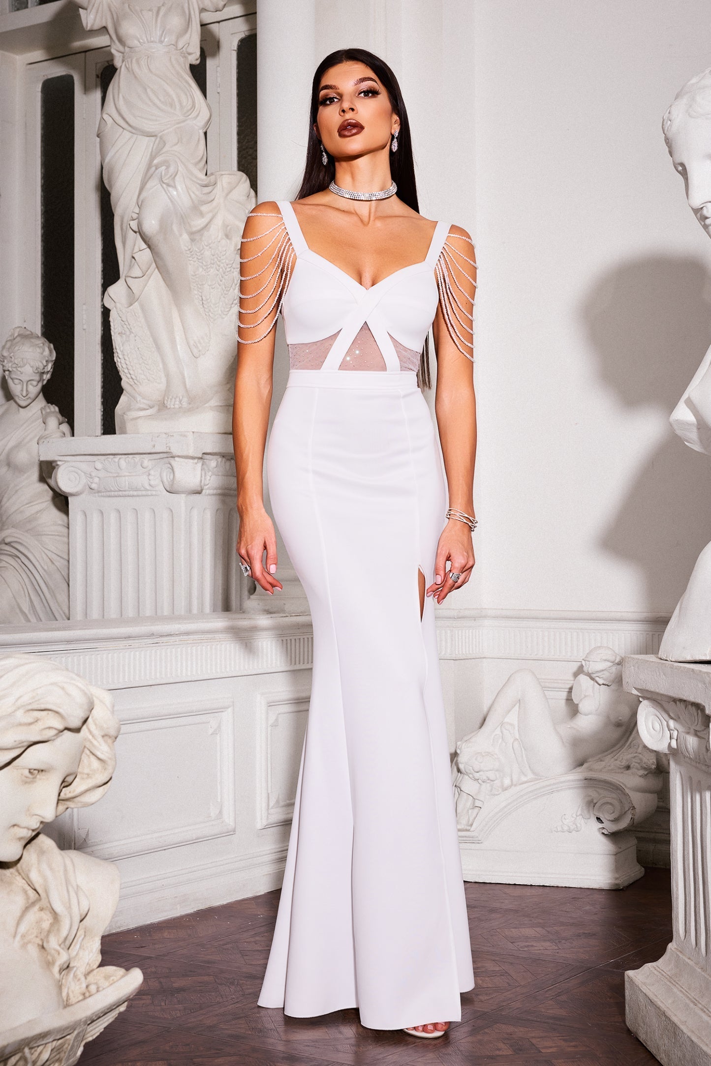 Göz alıcı Taş Detaylı Cut-Out Beyaz Maxi Elbise ile tüm gözler üzerinizde! Zarif beyaz rengi ile dikkat çekici kesimleri birleştiren bu elbise, doğum günü kutlamalarından özel parti davetlerine kadar her türlü etkinlik için mükemmel bir seçim. Detaylarda yer alan ince taş işlemeleri, elbisenin gösterişli yapısını ortaya çıkarır. Işıltılı bir kolye ve küpe ile tamamlayacağınız kombinle, akşamın en gözde ismi siz olacaksınız.
