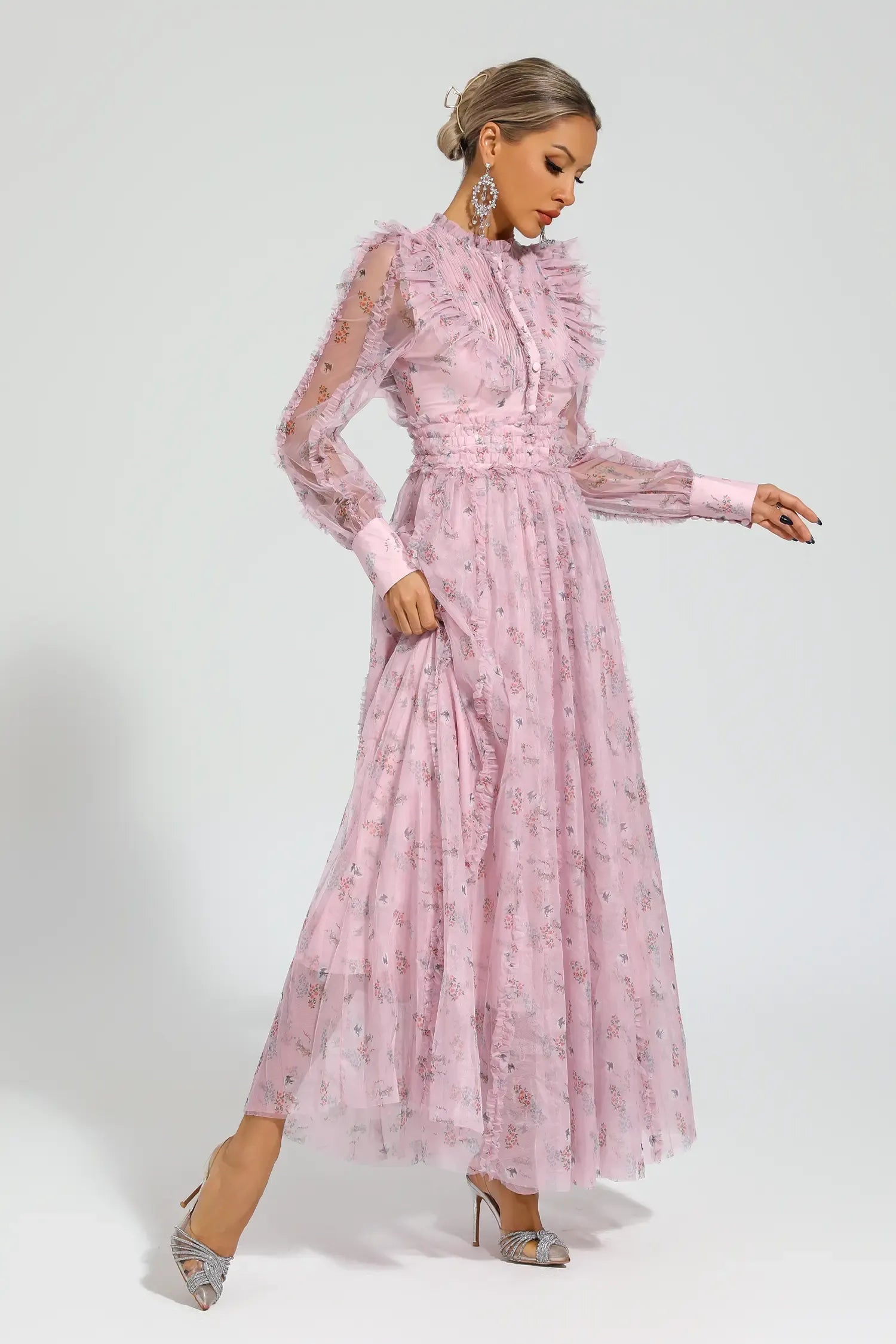Elara Pembe Çiçekli Uzun Kol Uzun Elbise