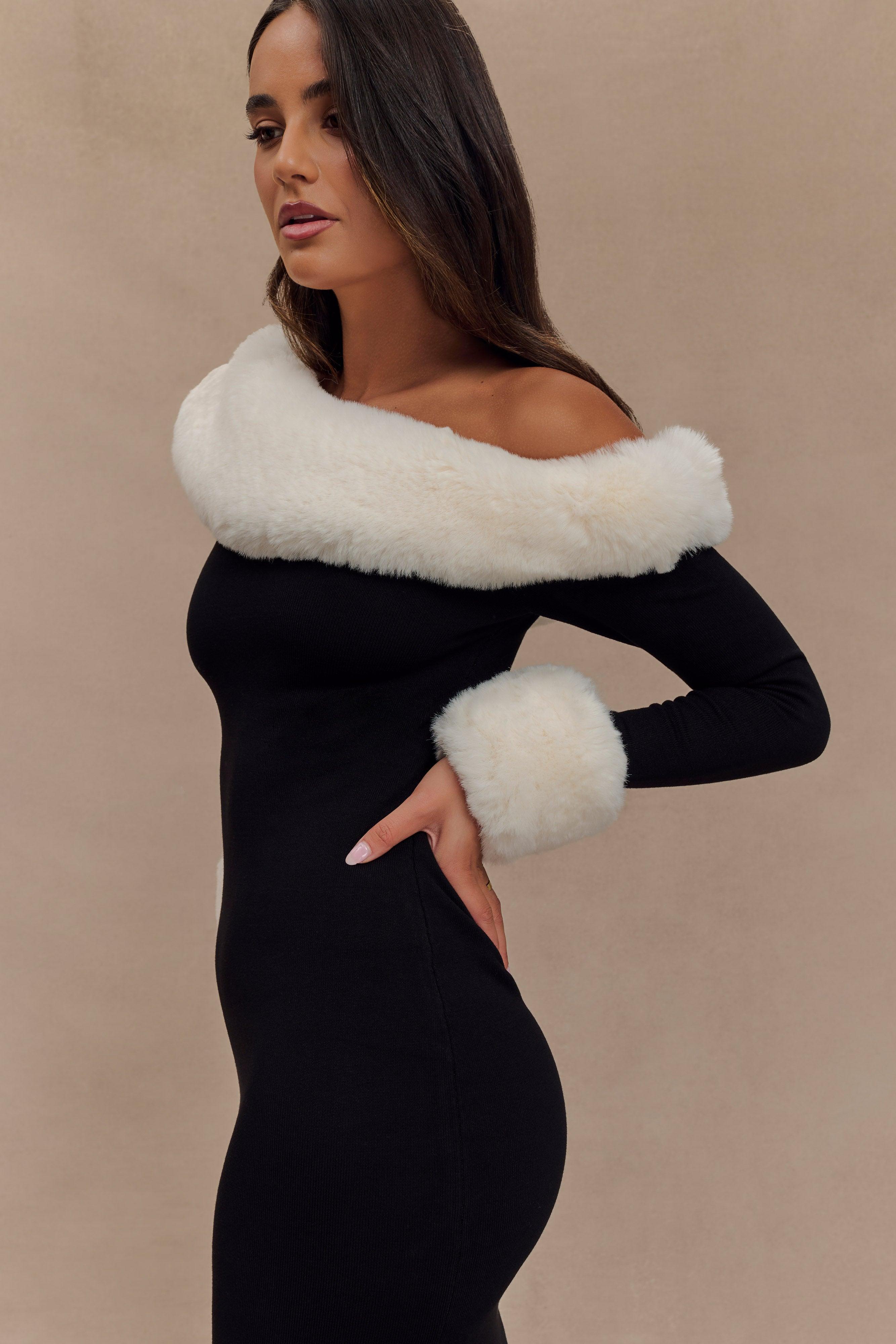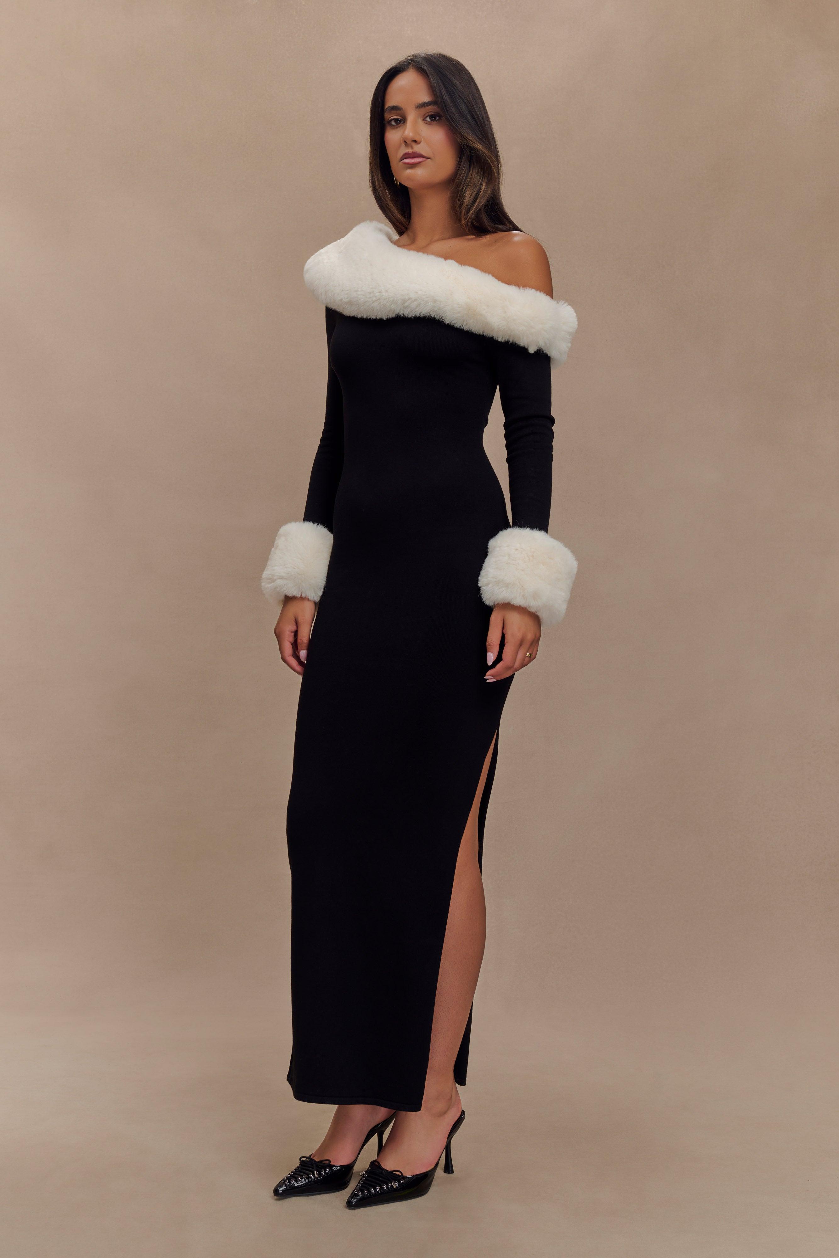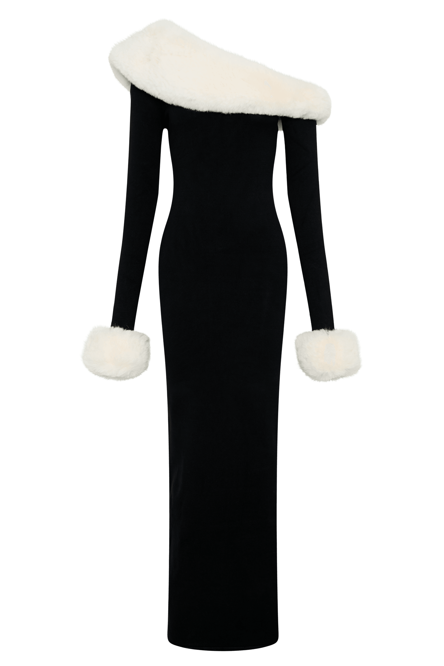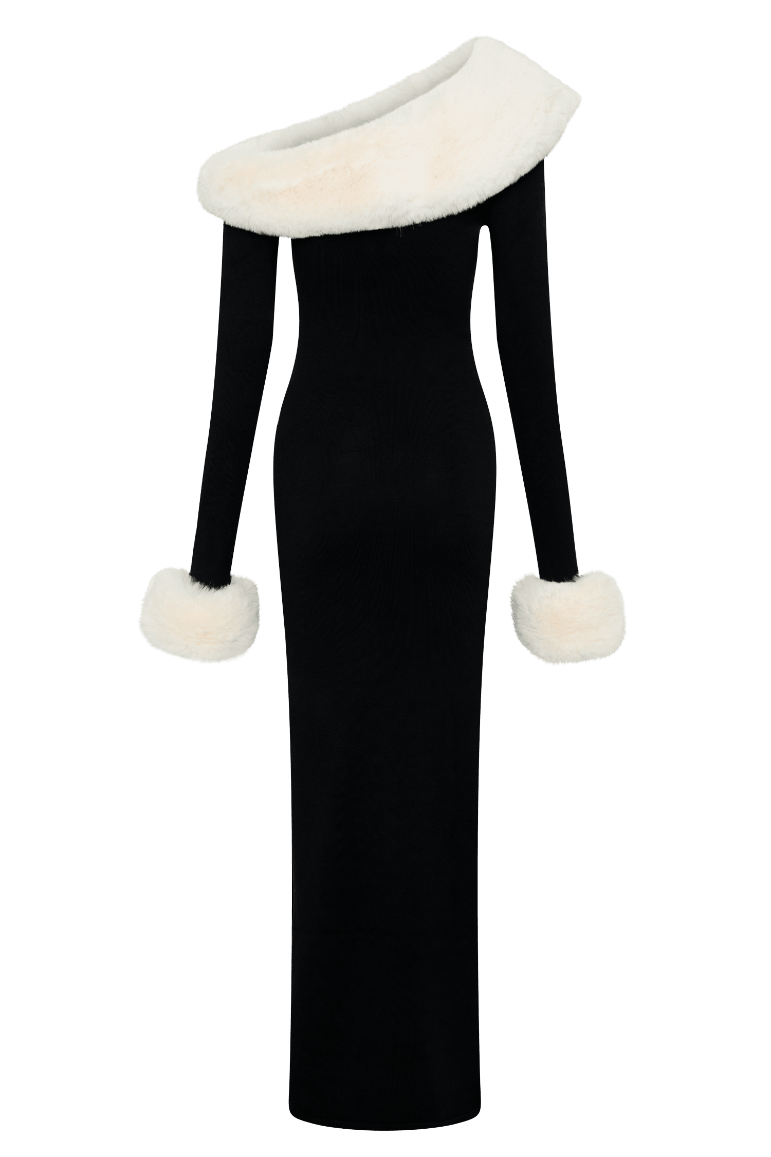 Şıklığın ve zarafetin buluştuğu bu siyah elbise, kürk detaylarıyla göz kamaştırıyor. Özel davetler ve kış akşamlarında stilinizi tamamlayacak kusursuz bir tasarım
