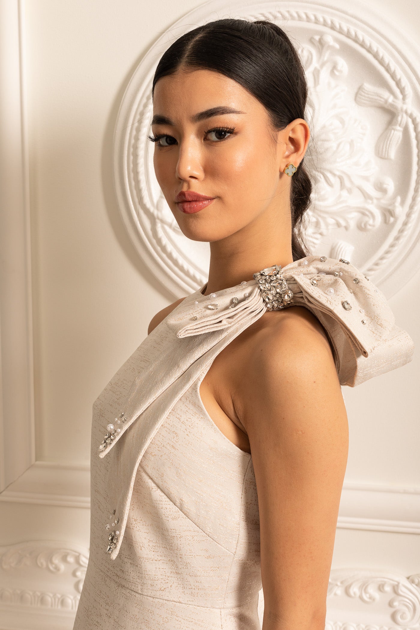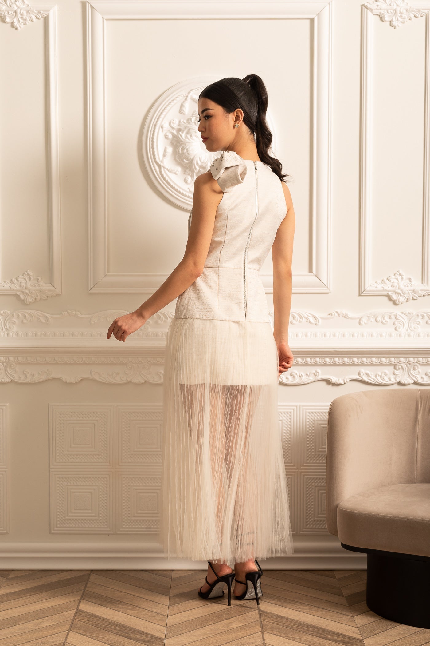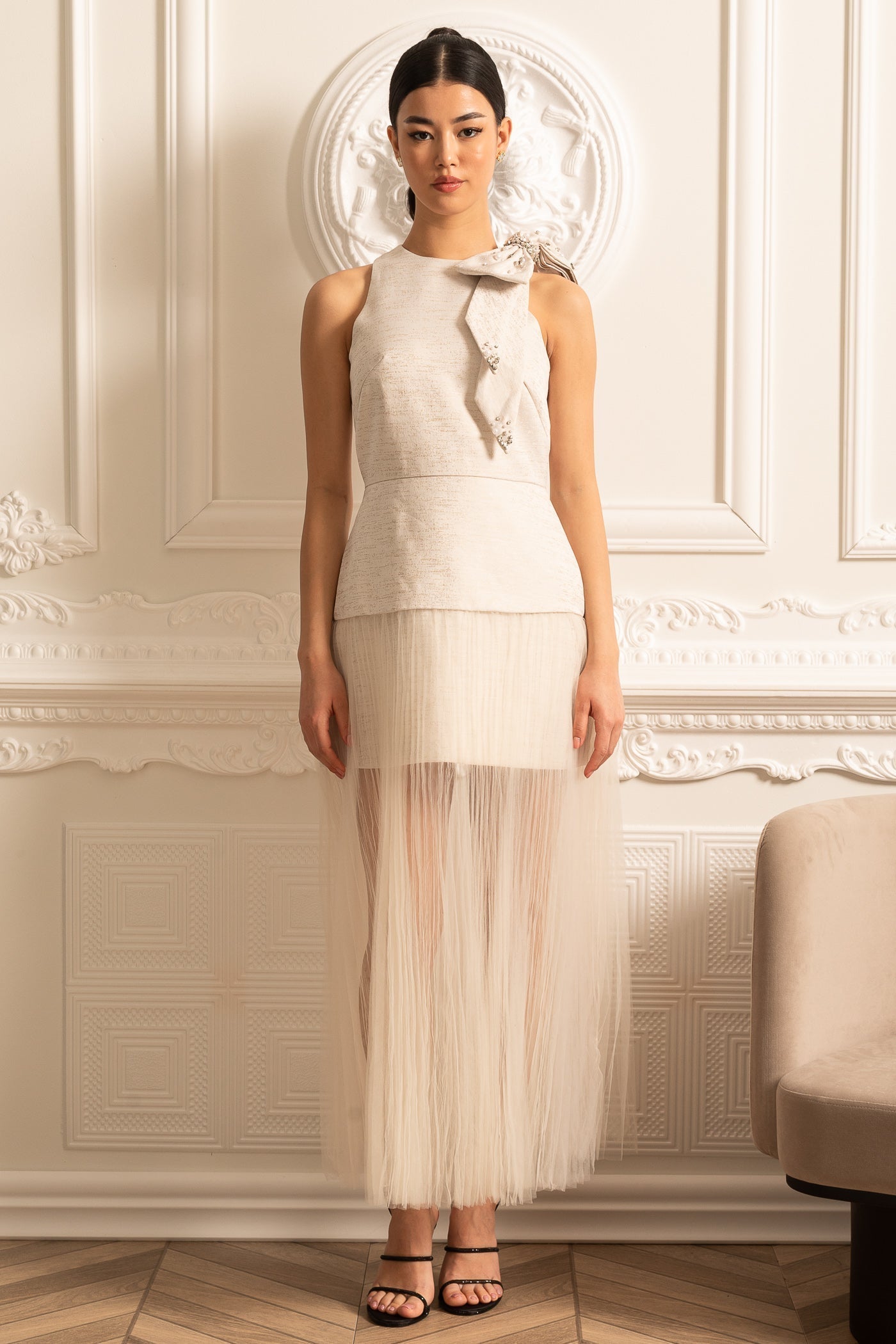 Pileli Tül Etekli, Omuz Fiyonklu ve Işıltılı Süslemeli İvory (Kırık Beyaz) Zarif Elbise