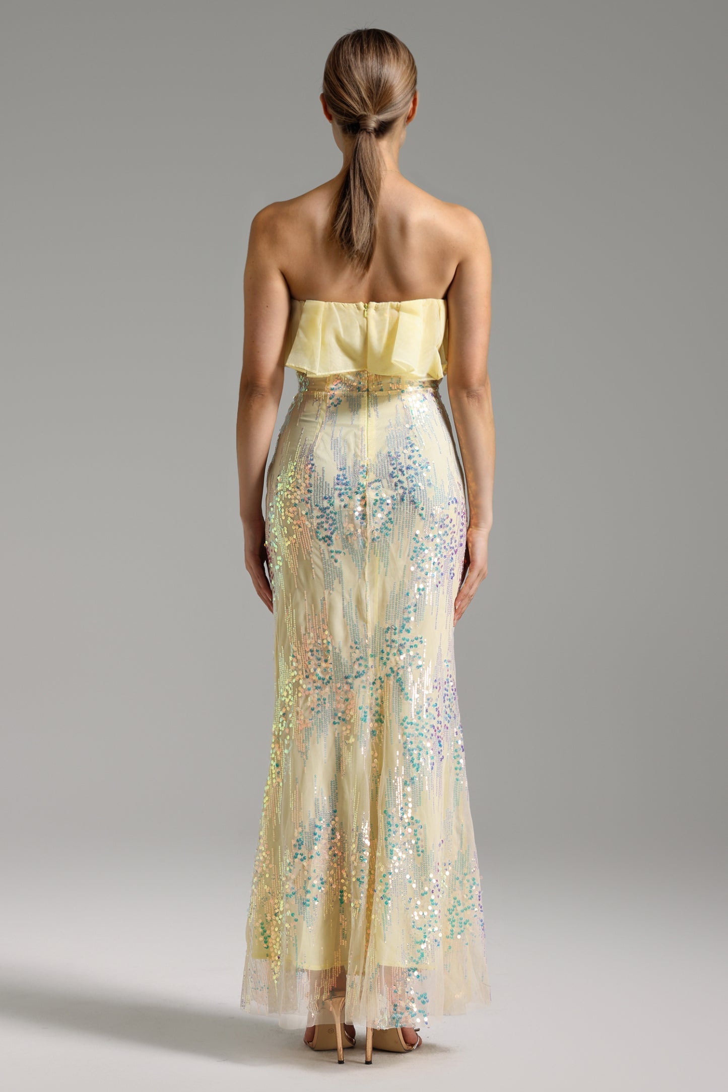 Kendi beden ölçülerinize göre tasarlanan bu maksi boy elbise, gece davetlerinden plaj partilerine kadar her türlü özel etkinlikte ihtiyacınız olan çarpıcı görünümü sağlar. Parlak payet detayları ile yalın ama etkileyici bir stil sunar.