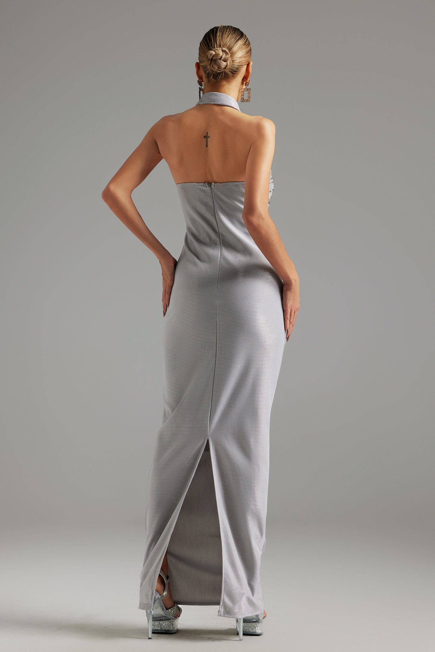 Şıklığıyla göz kamaştıran bu Gümüş Rengi Taş Detaylı Halter Yaka Maxi Elbise, özel davetlerinizde tüm gözleri üzerinize çekecek. Zarif halter yakası, üzerindeki parıldayan taş detaylarla birlikte sofistike bir silüet sunar. Esnek kumaş yapısı sayesinde rahat bir kullanım sağlarken, uzun ve akıcı formu ile feminen bir duruş sergiler. Gümüş tonundaki bu elbise, minimal ve estetik detaylarıyla modern bir görünüme sahiptir.