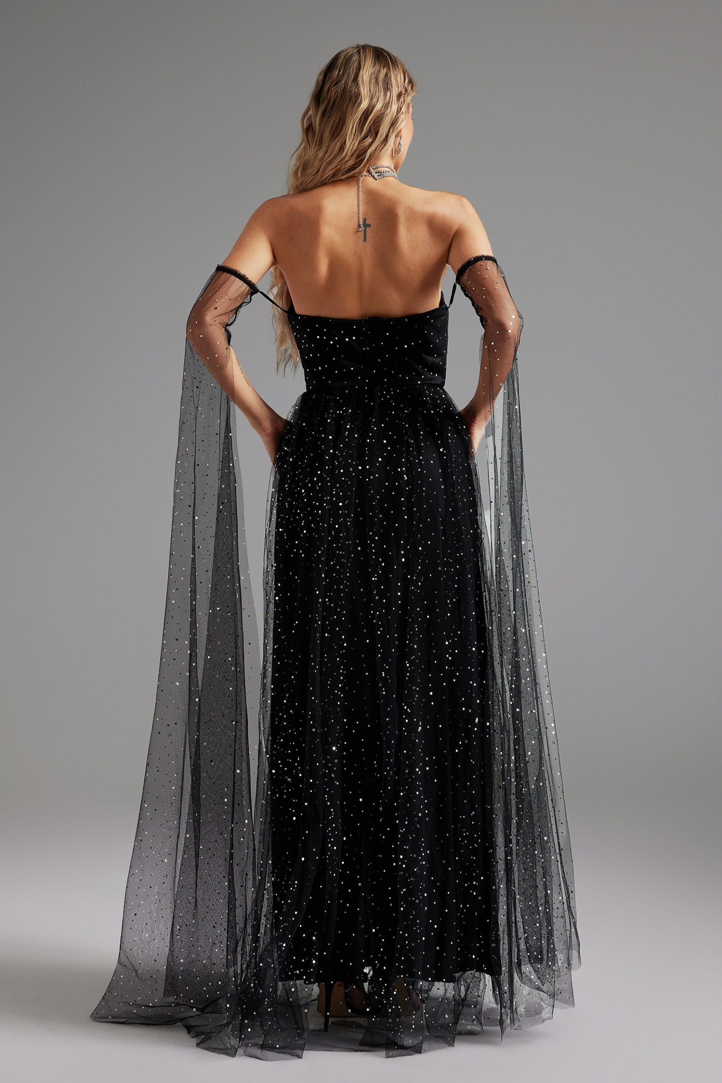 Ente Payetli File Maksi Elbise ile gece davetlerinin yıldızı siz olun! Derin V yakası ve yan yırtmacı ile cesur bir görünüme sahip olan bu siyah payetli file elbise, zarafet ve çekiciliği bir arada sunuyor. İnce payet detaylarıyla süslenmiş şeffaf file kumaşı, göz alıcı bir ışıltı katıyor.