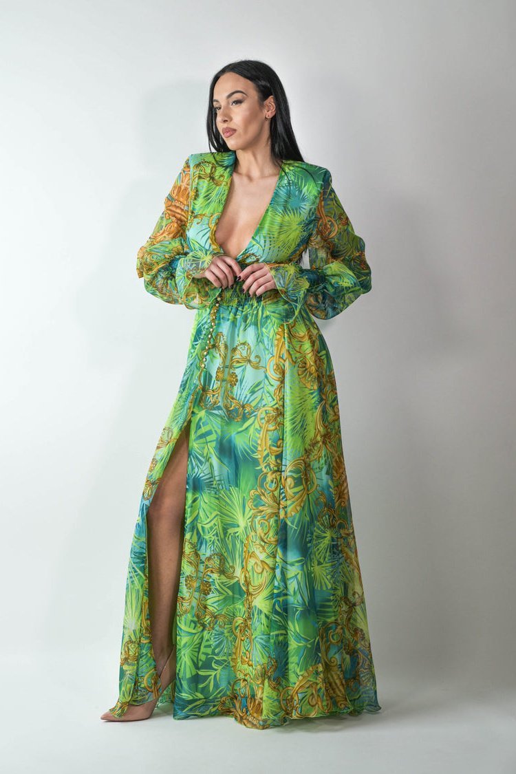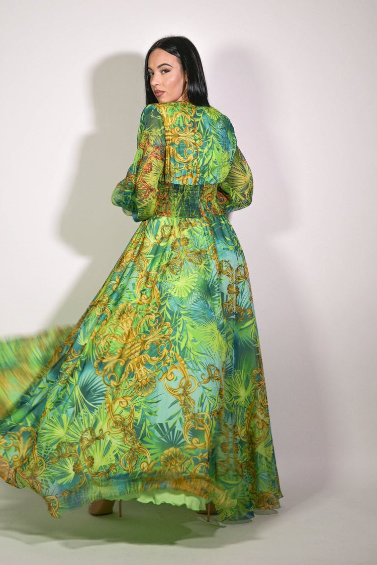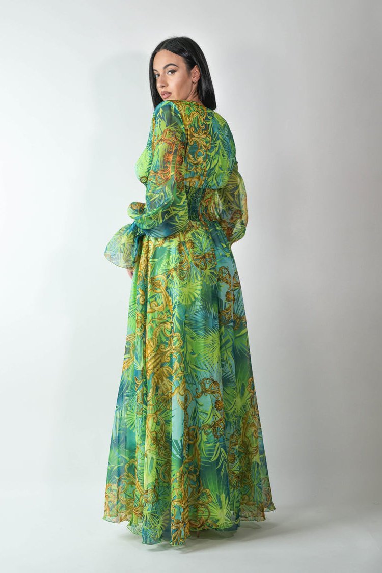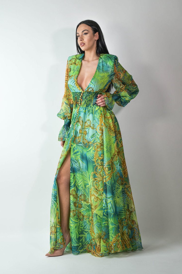Derin V yakalı, uzun kollu ve manşetleri elastik uzun elbisemizle zahmetsiz şıklığı yaşayın. Ön yırtmaç dramatik bir dokunuş katarken elastik bel, silüetinizi vurgulayan hoş bir uyum sağlar. Hafif esnek şifondan üretilen bu elbise, güzel bir örtüye sahiptir ve rahat hareket imkanı sunar.