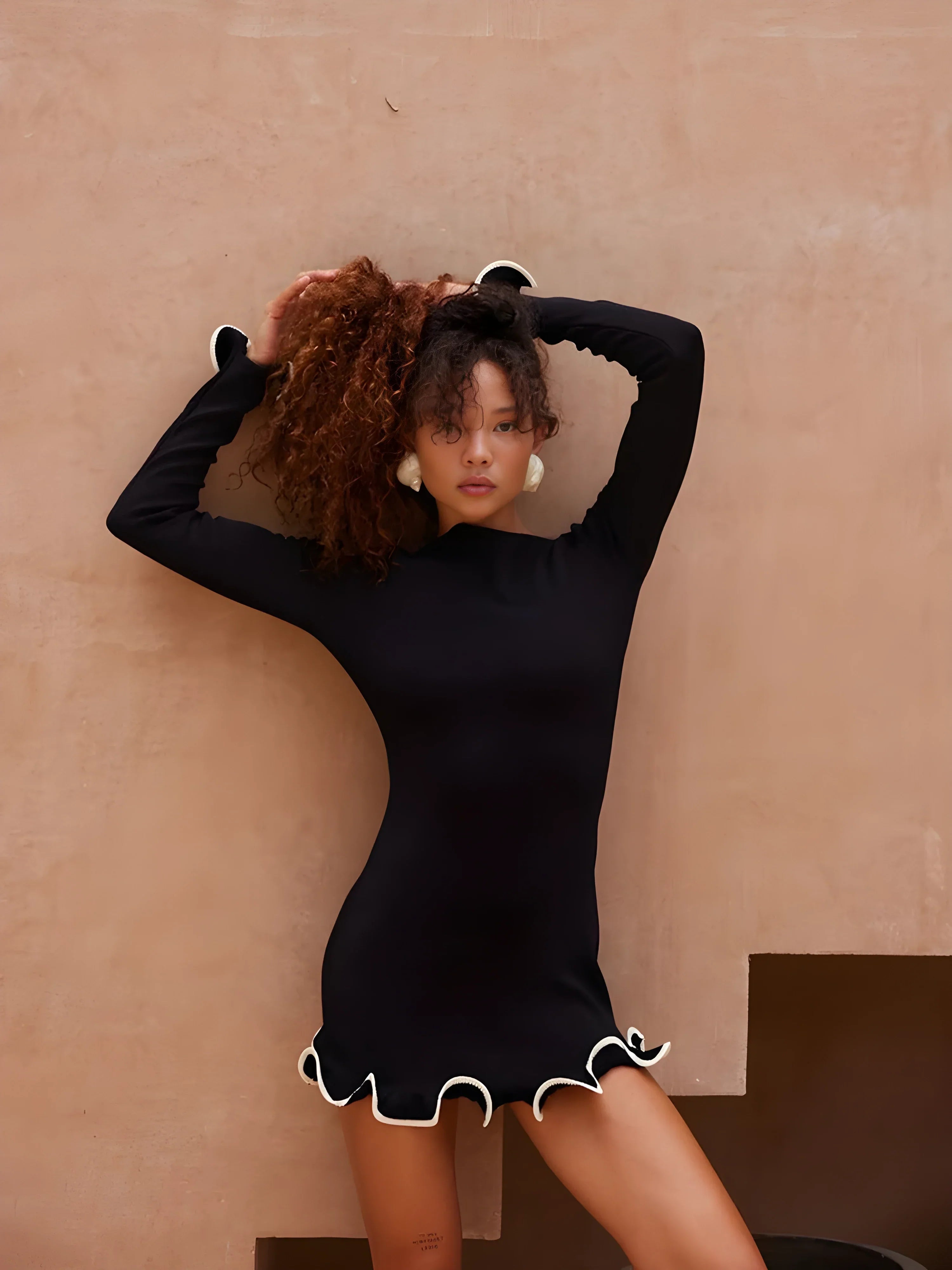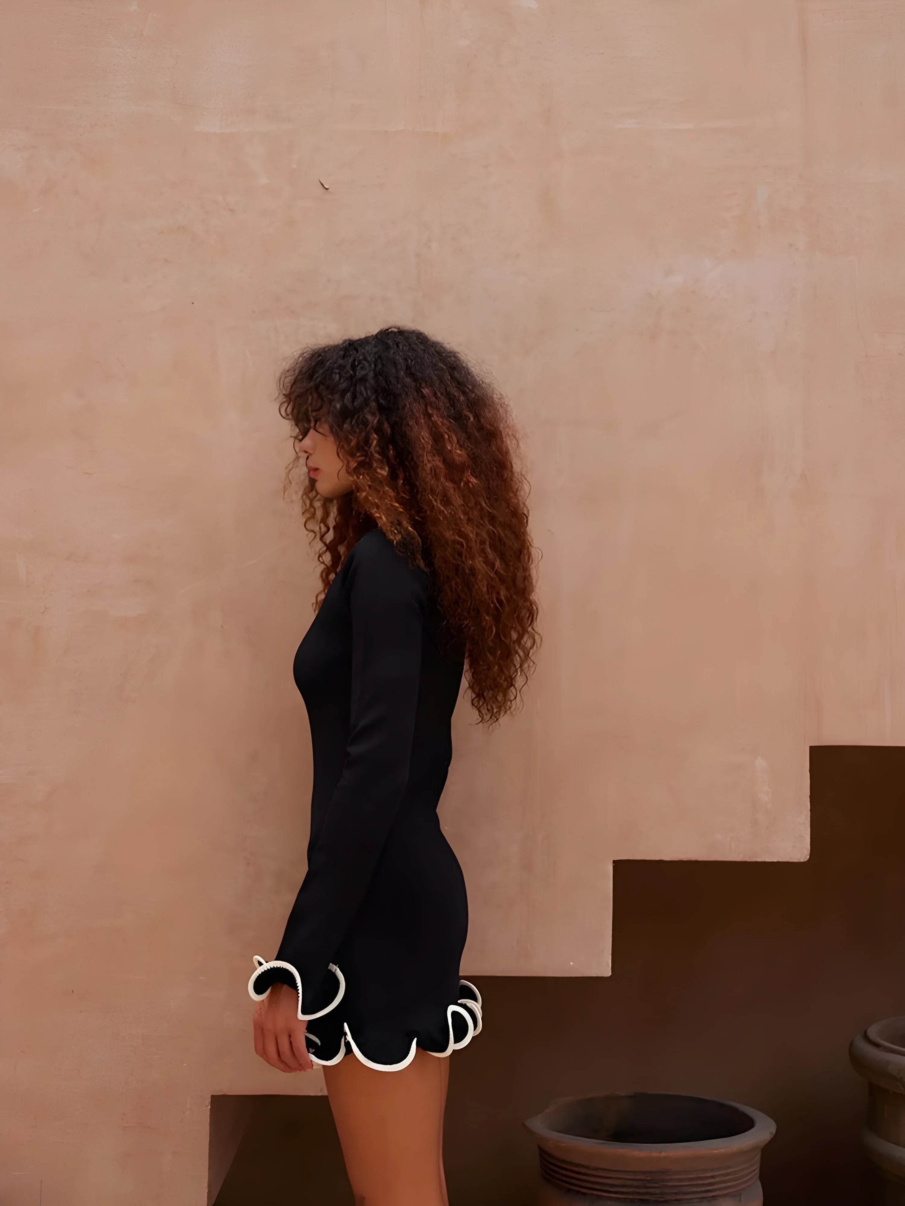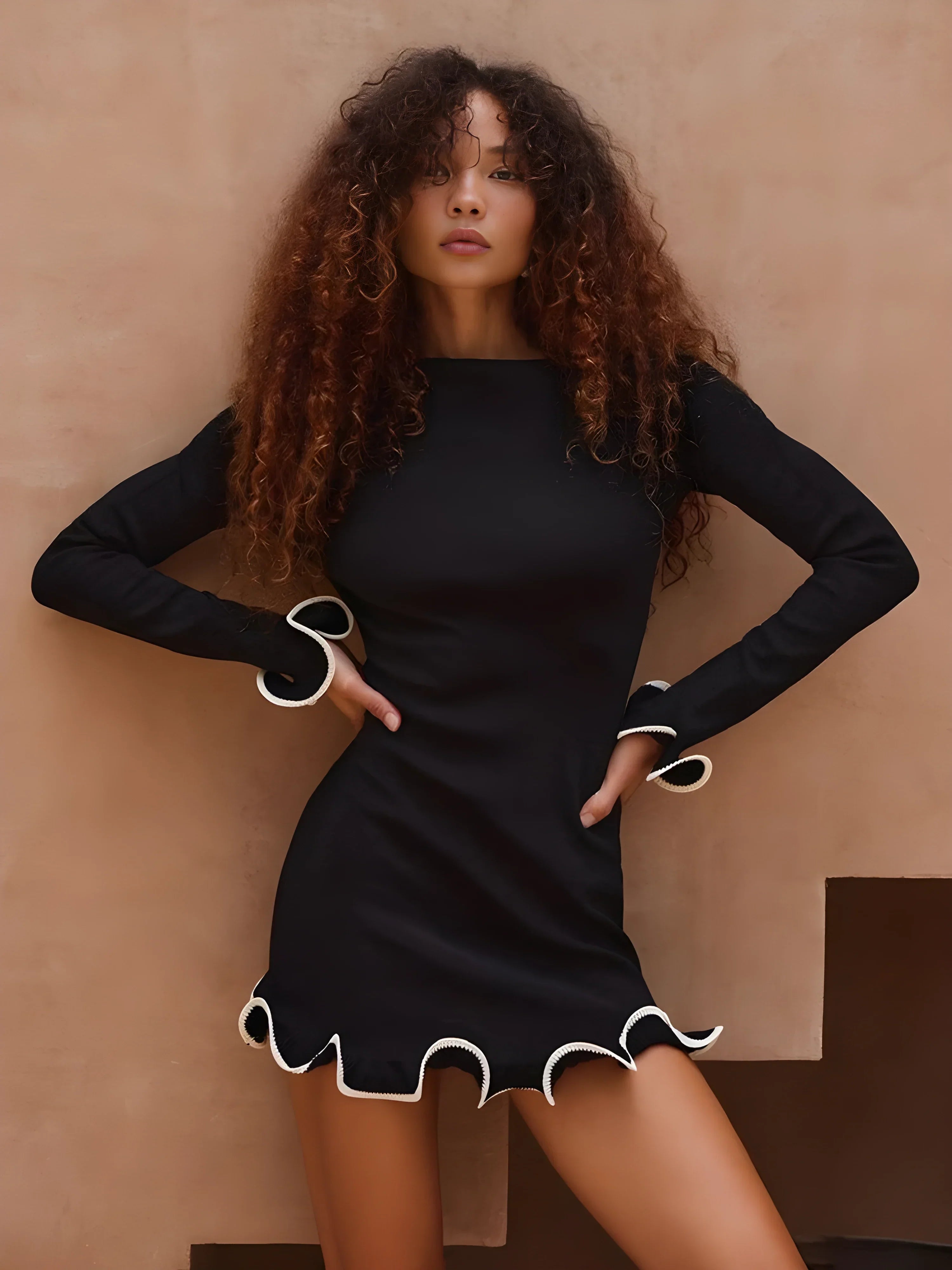 Vücuda oturan mini formda, uzun kollu triko elbise. Etek ucu ve manşetlerde dalgalı kontrast biyeli detaylar ile hareket kazanır. Minimal formu, dokulu kumaşla tamamlanır.