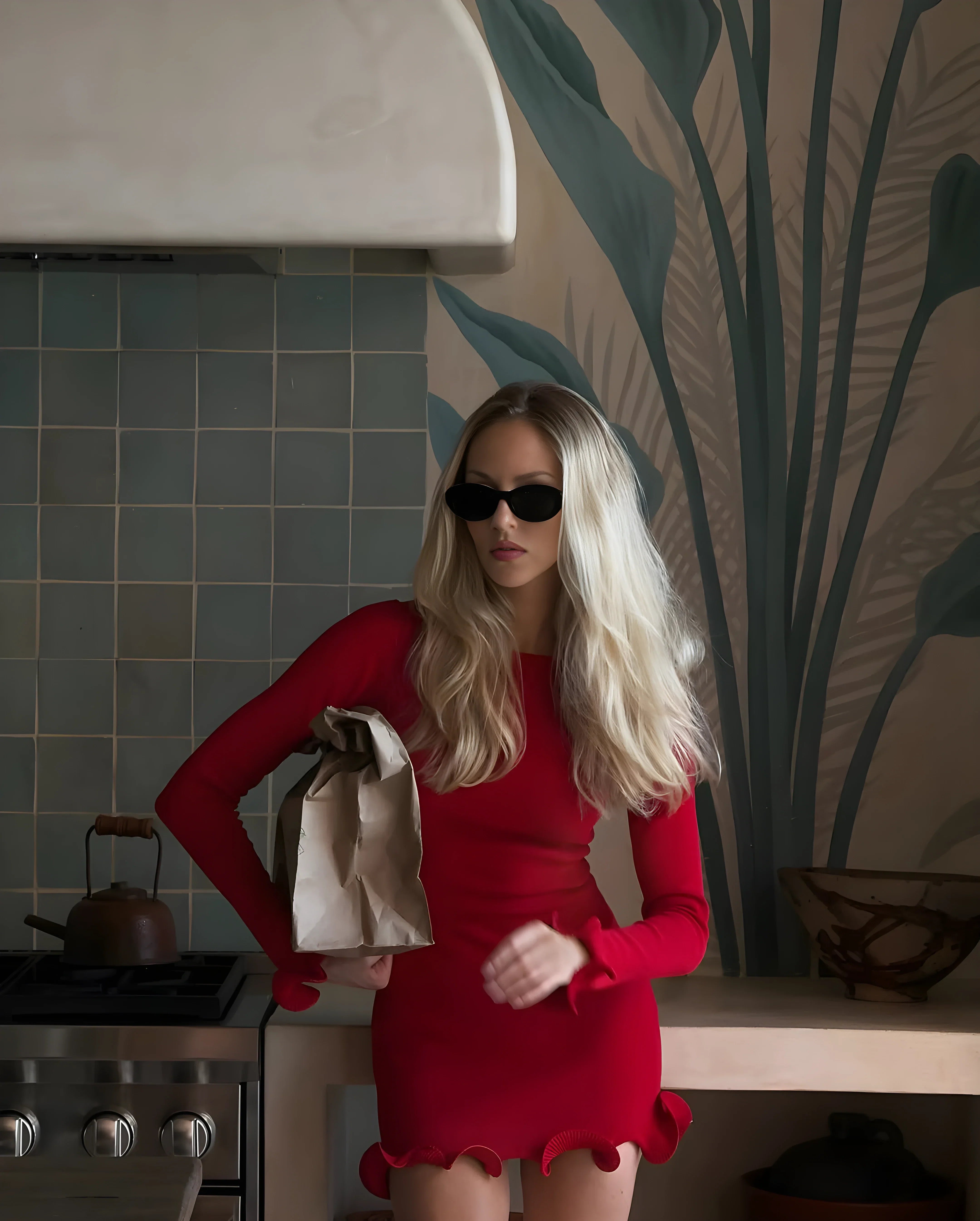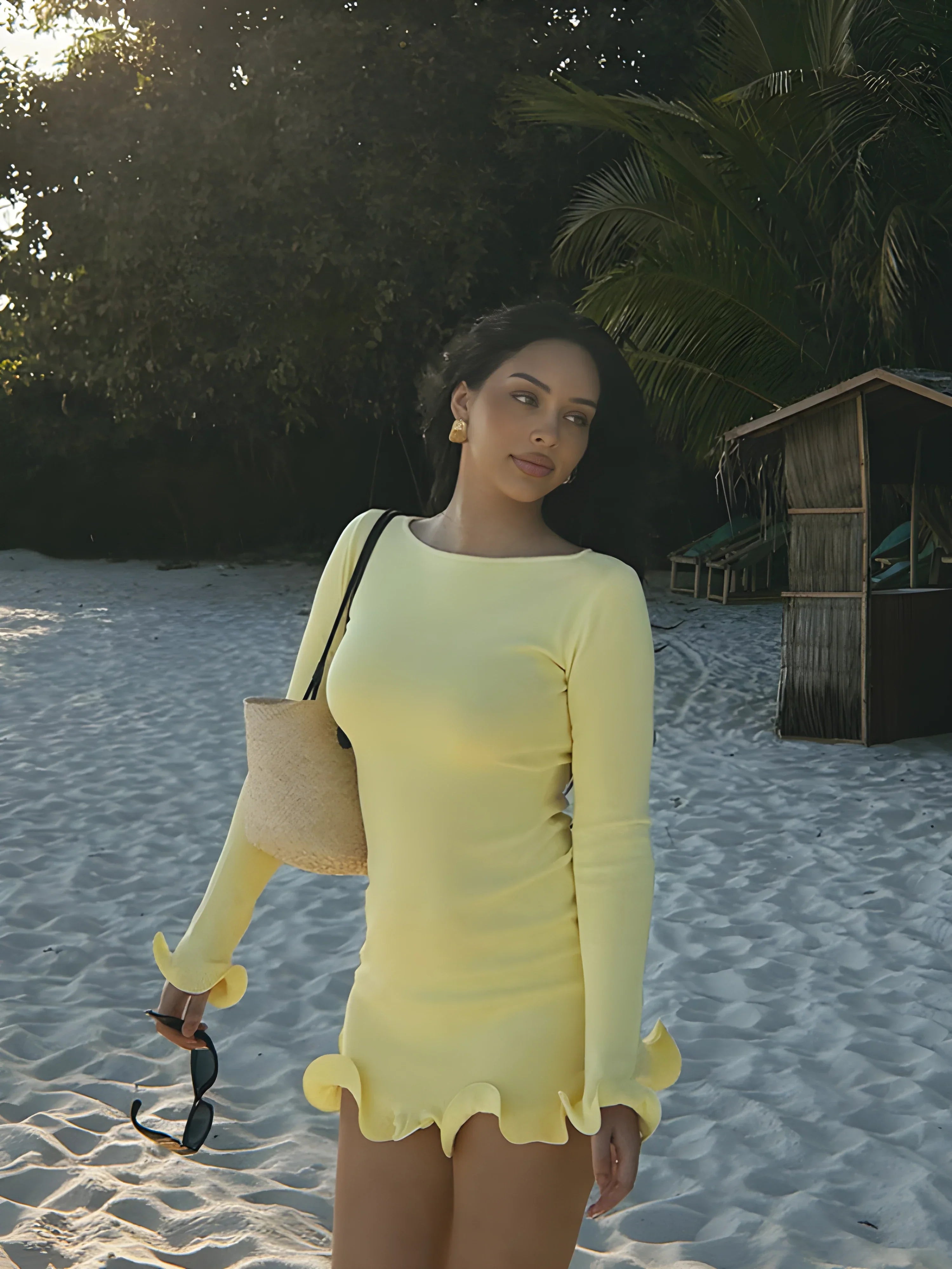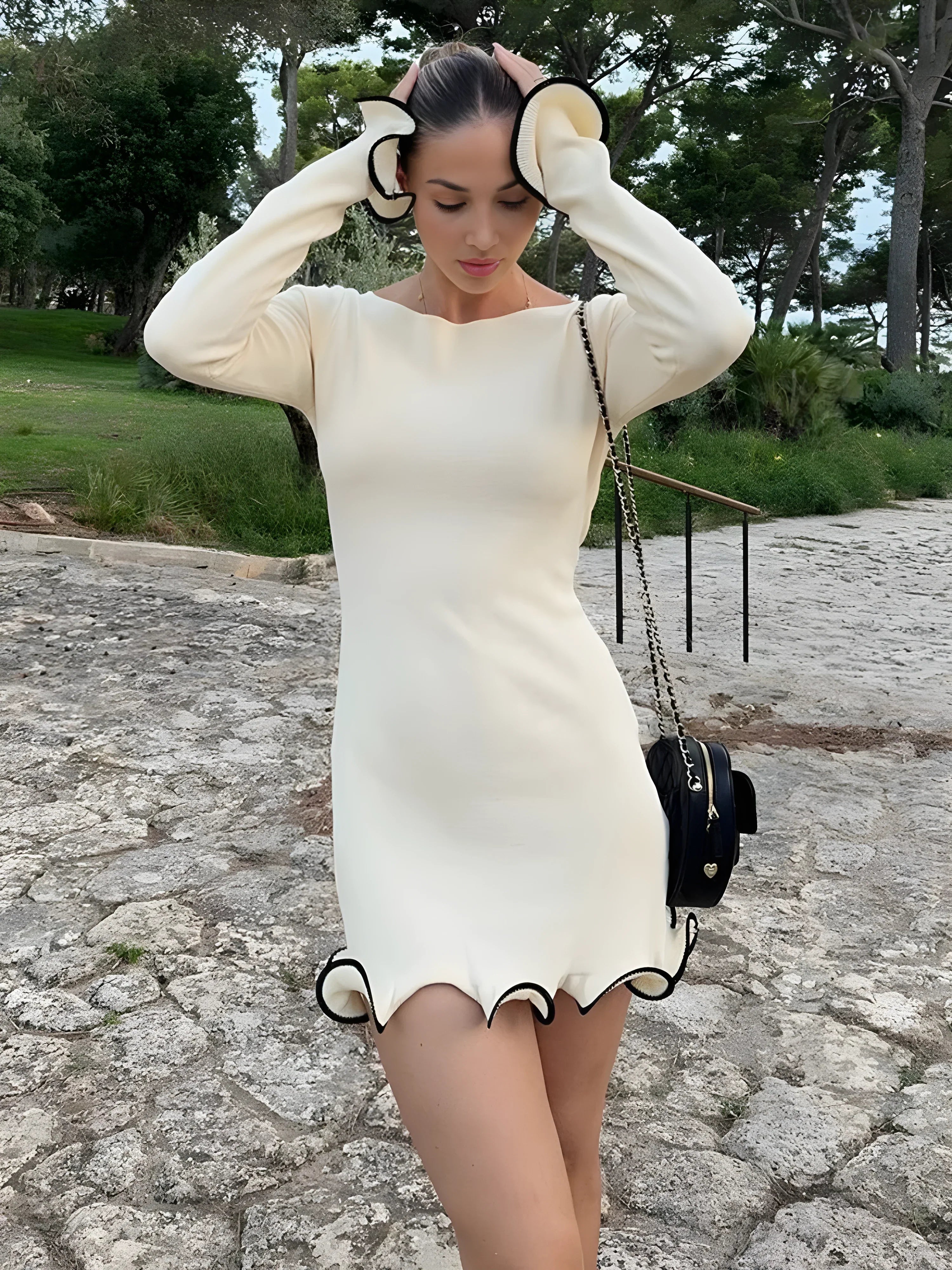 Vücuda oturan mini formda, uzun kollu triko elbise. Etek ucu ve manşetlerde dalgalı kontrast biyeli detaylar ile hareket kazanır. Minimal formu, dokulu kumaşla tamamlanır.