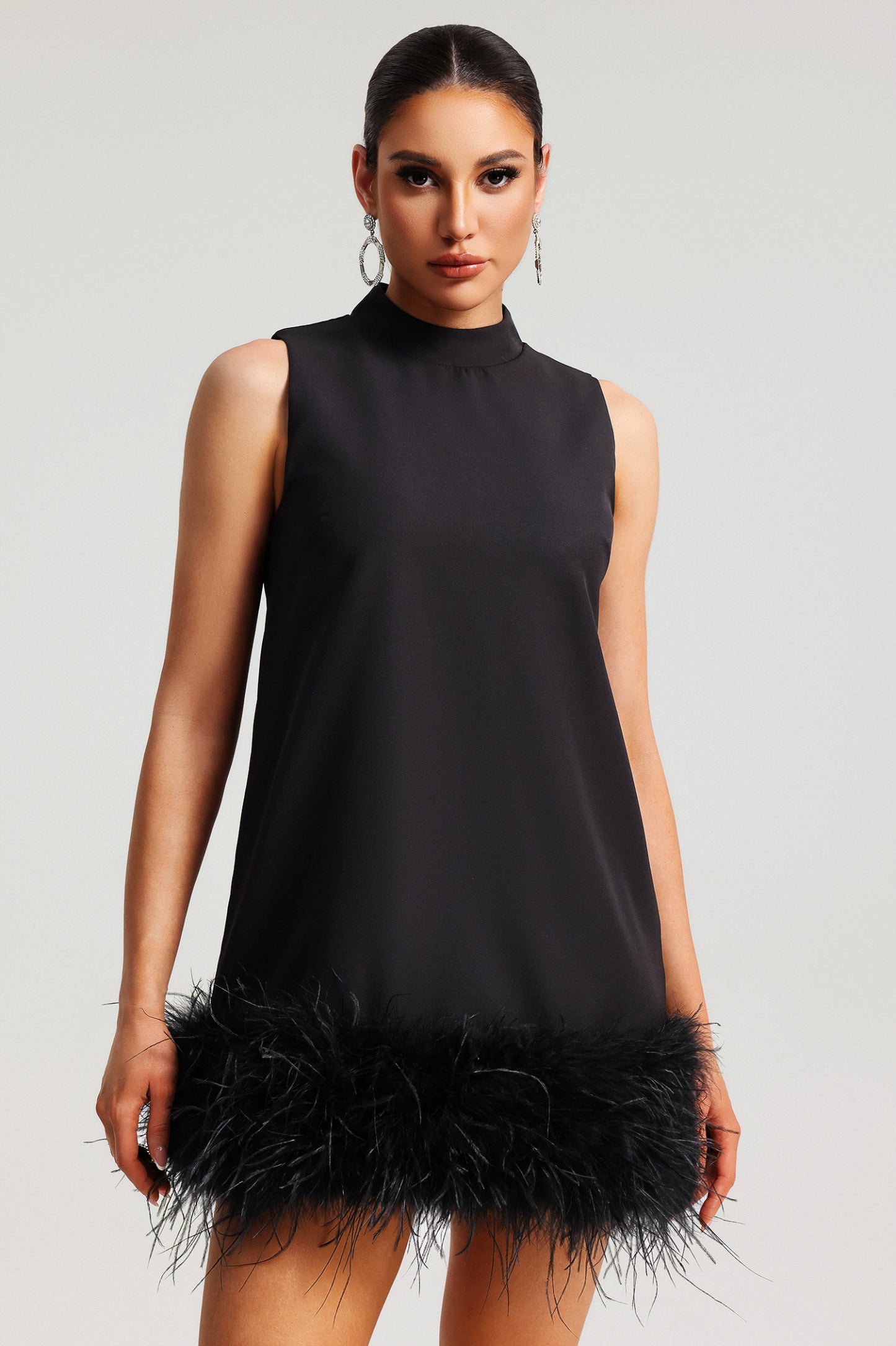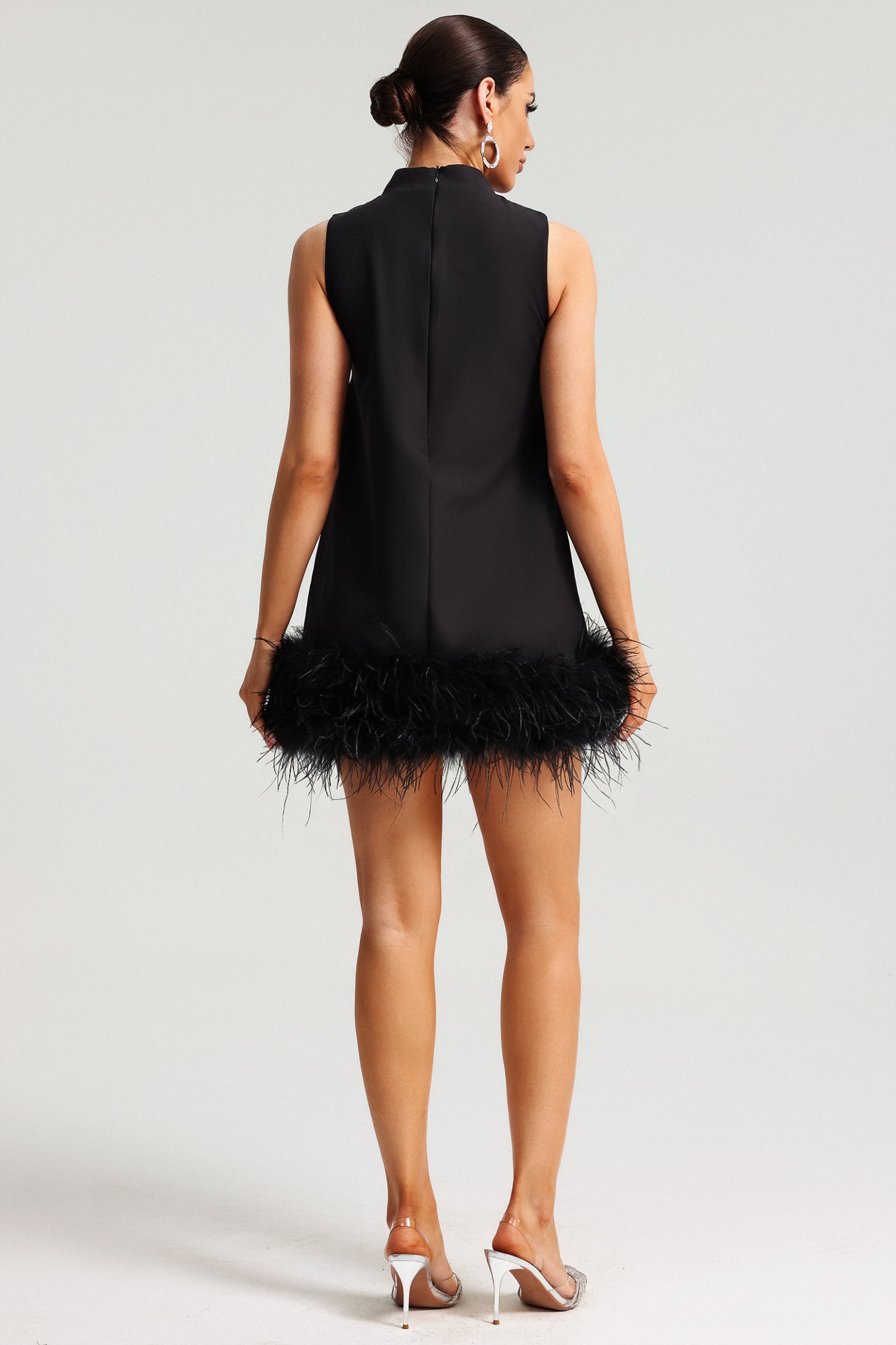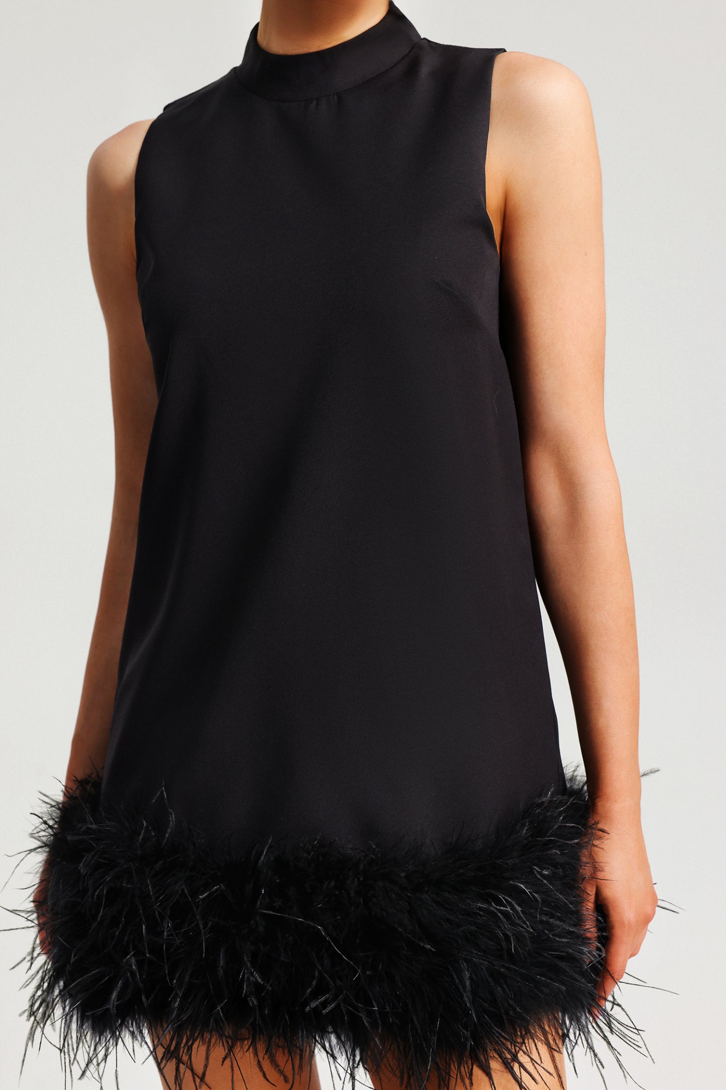 Tasarımda kullanılan tüy detaylar ile olağanüstü bir şıklık sunan bu mini elbise, davetler ve özel geceler için ideal bir seçimdir. Hem zarif hem de konforlu bir görünüm sunar.