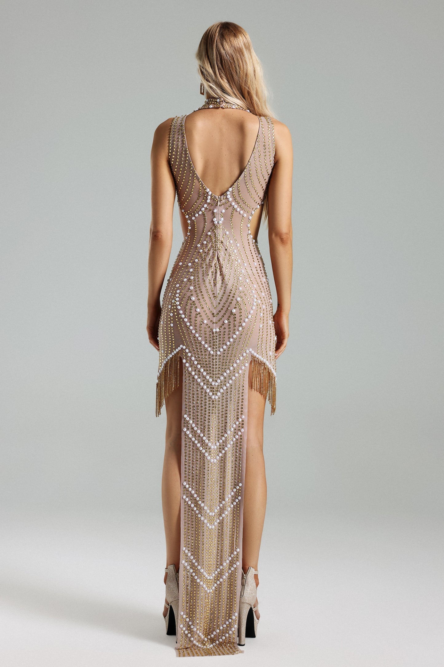 Kesilmiş yeşil inci ve taş detaylarının büyüleyici uyumu ile özel günlerinizin vazgeçilmezi olacak bu elbise, ışıltınızı bir adım öne çıkarır. Modelimiz S beden giymekte olup, zarif figürünü tam anlamıyla sergilemektedir.