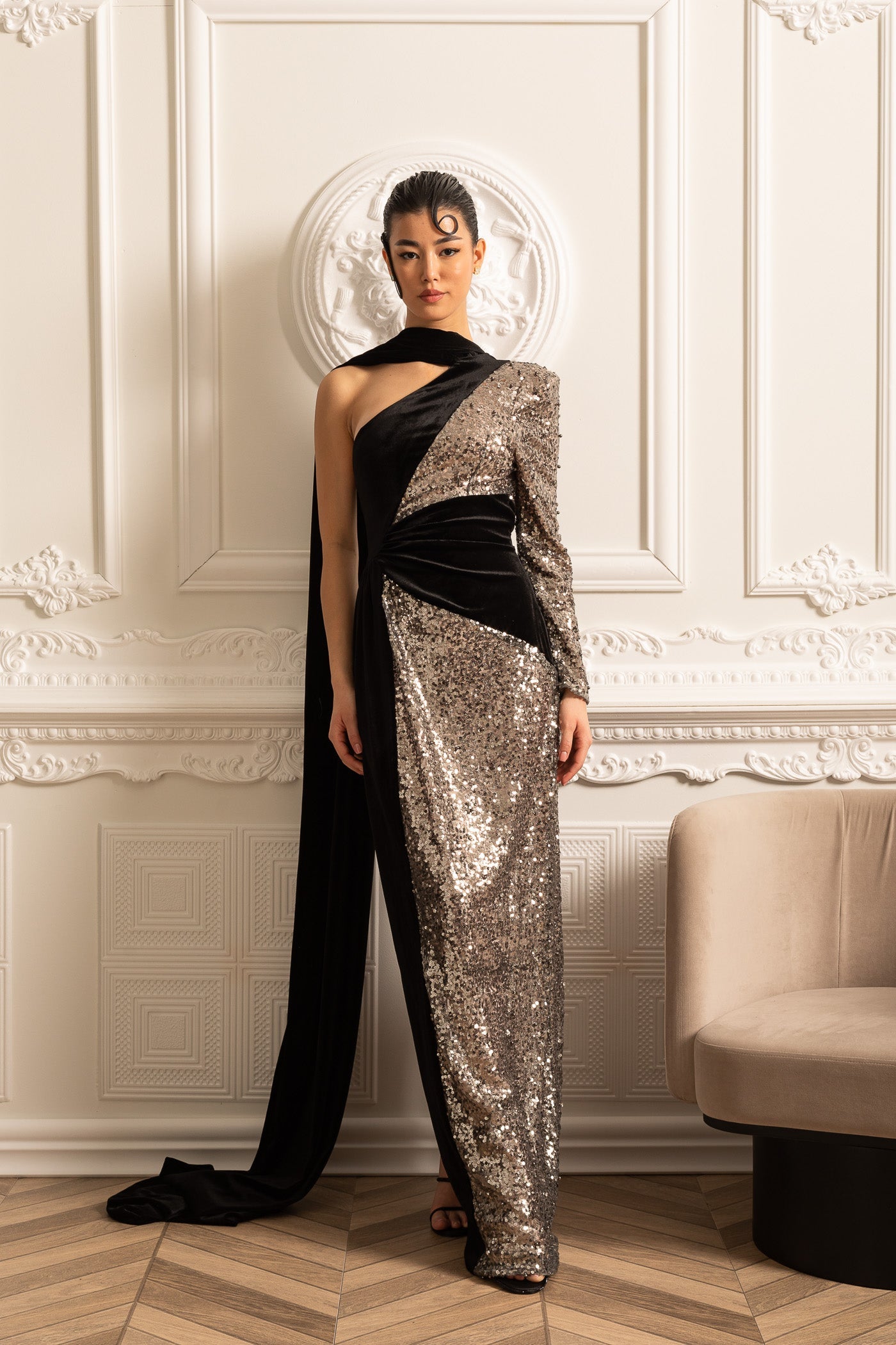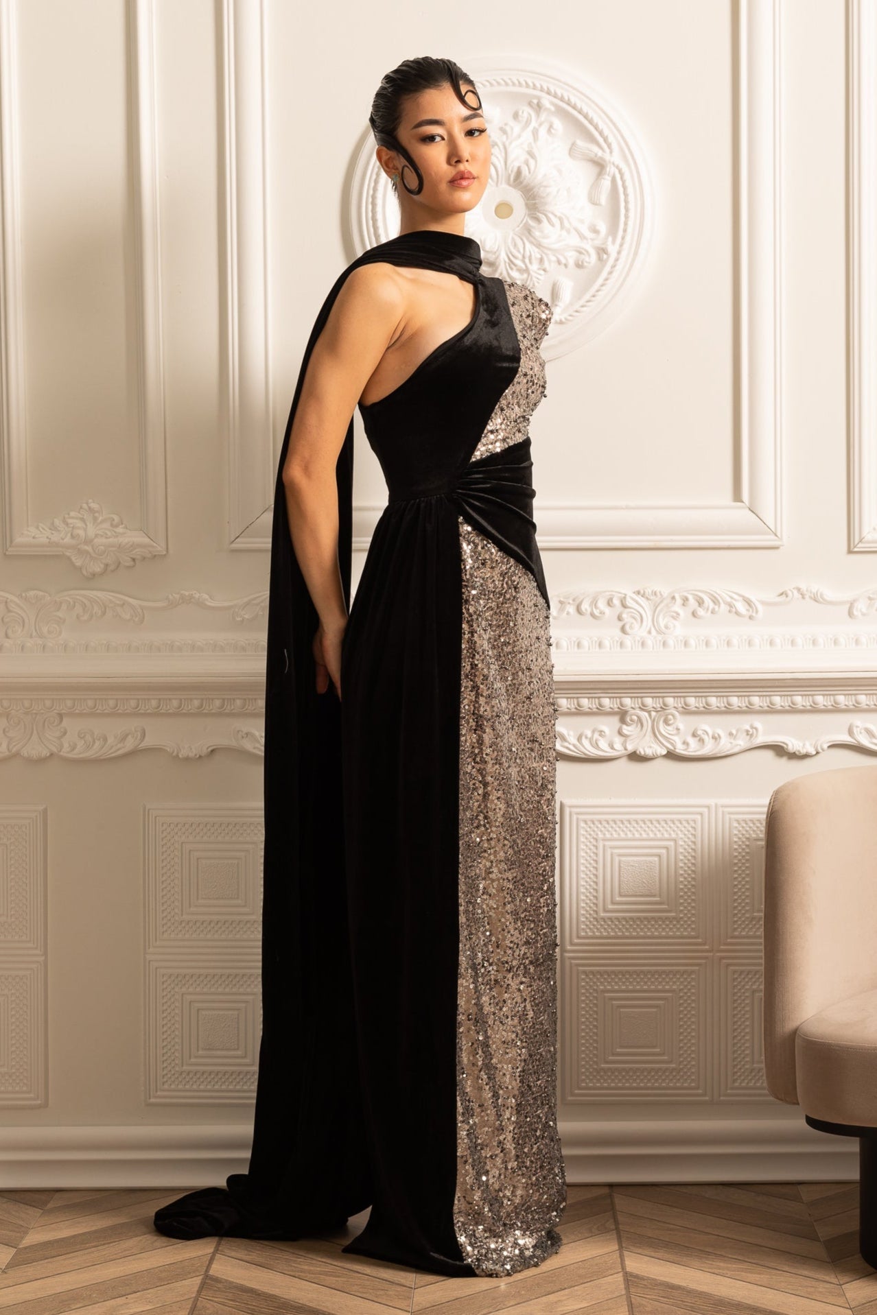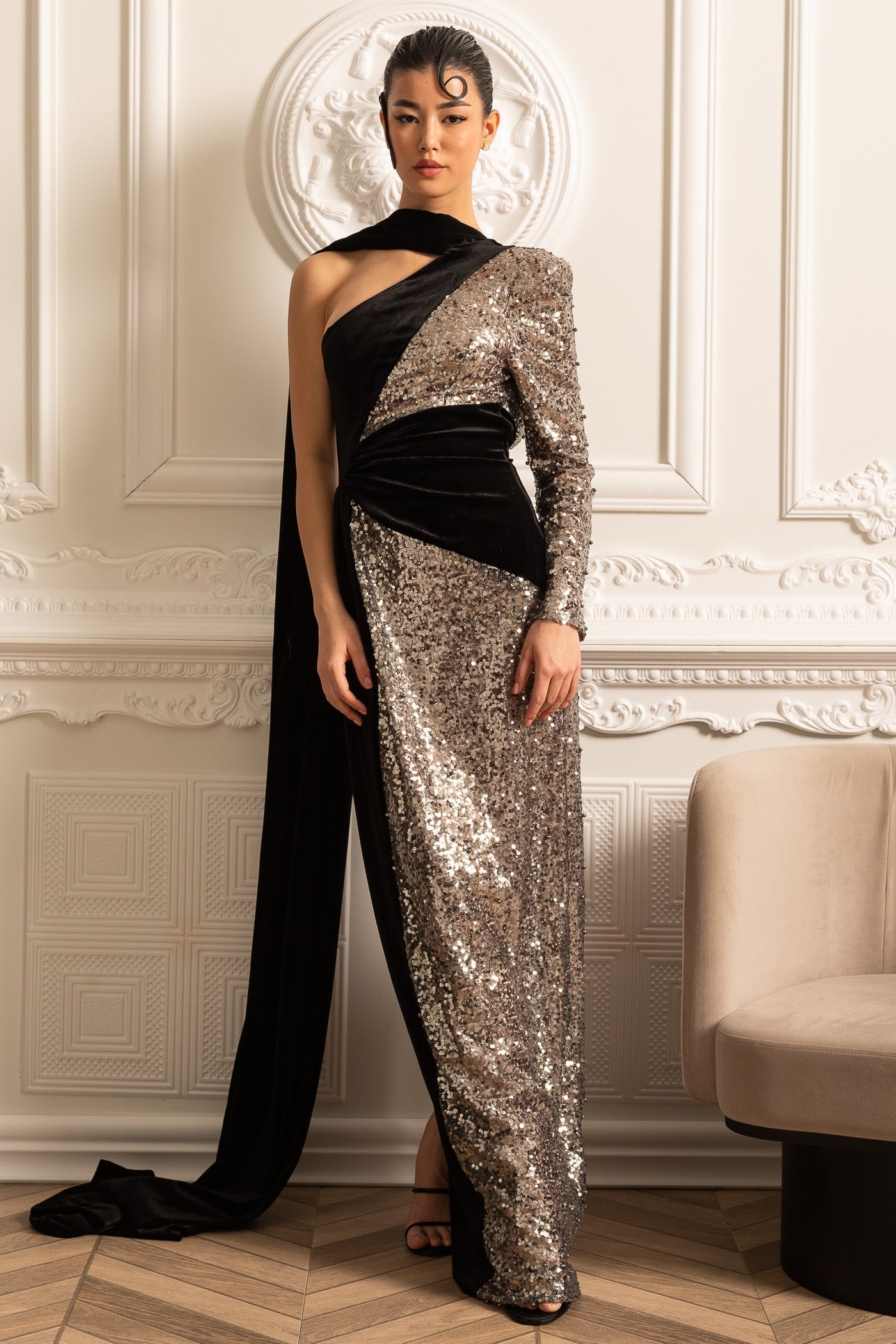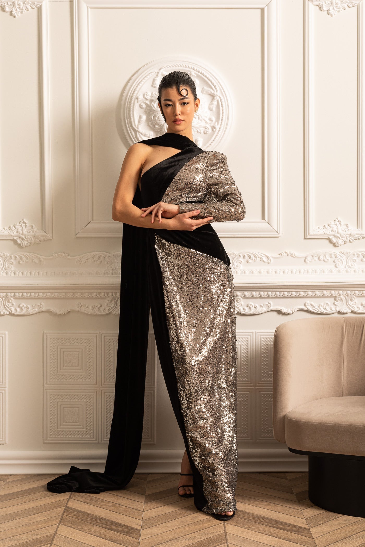 Tüy Detaylı, Işıltılı ve Yüksek Yırtmaçlı Siyah Elbise