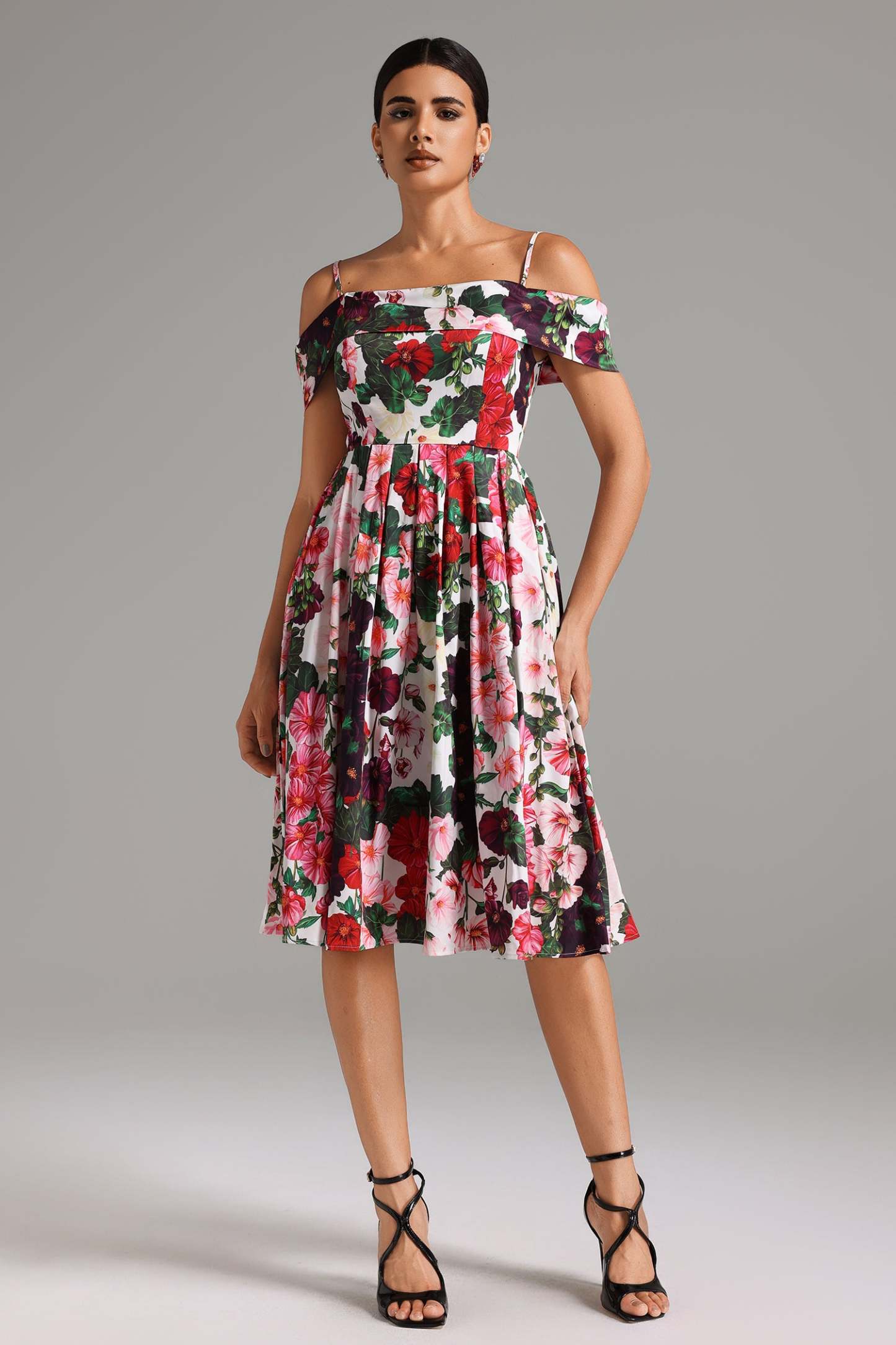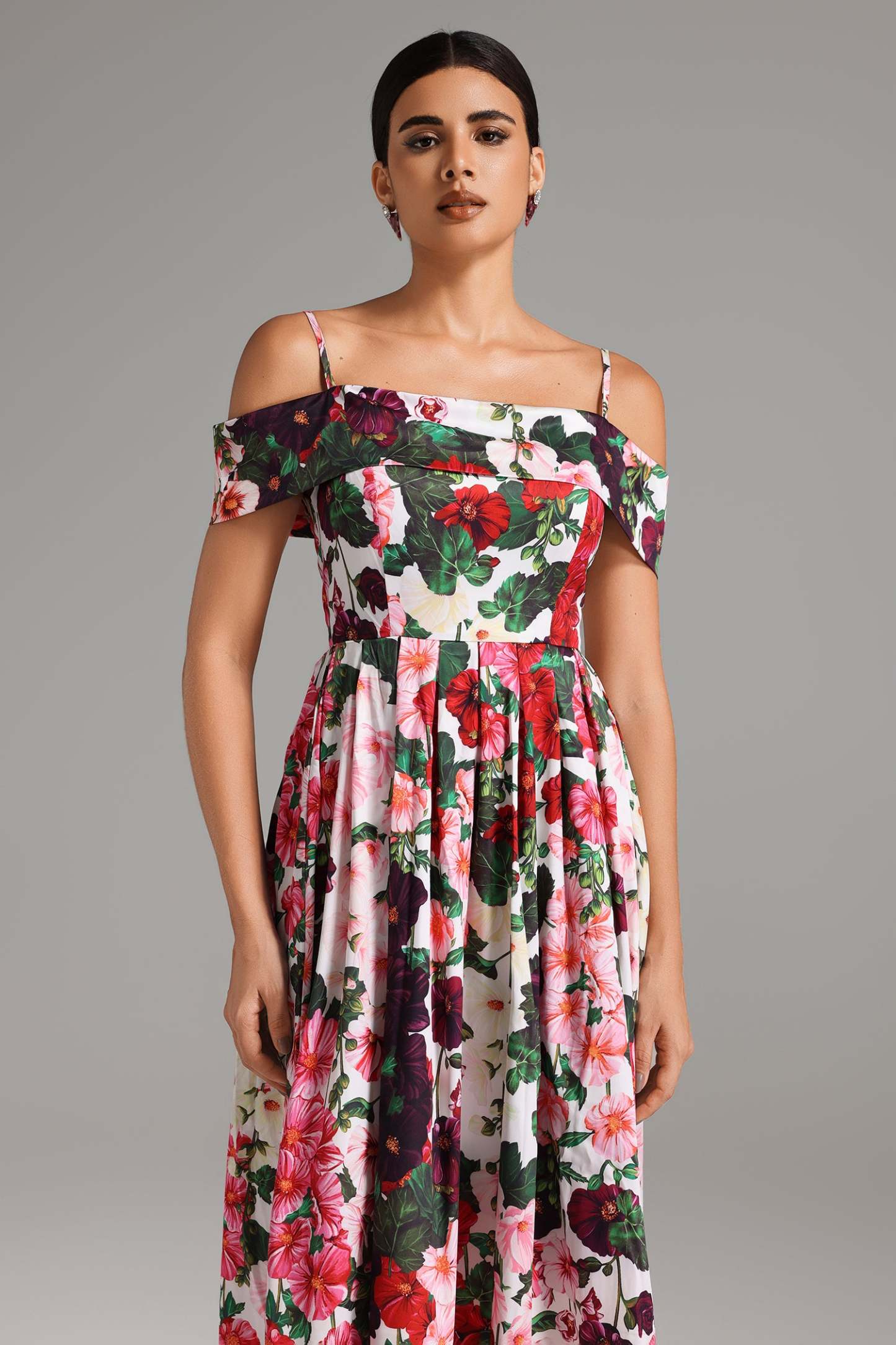 Taşıdığı zarif çiçek desenleri ile bu midi elbise, hem gece şıklığına hem de gündüz aktivitelerine uyum sağlayacak şekilde tasarlanmıştır.