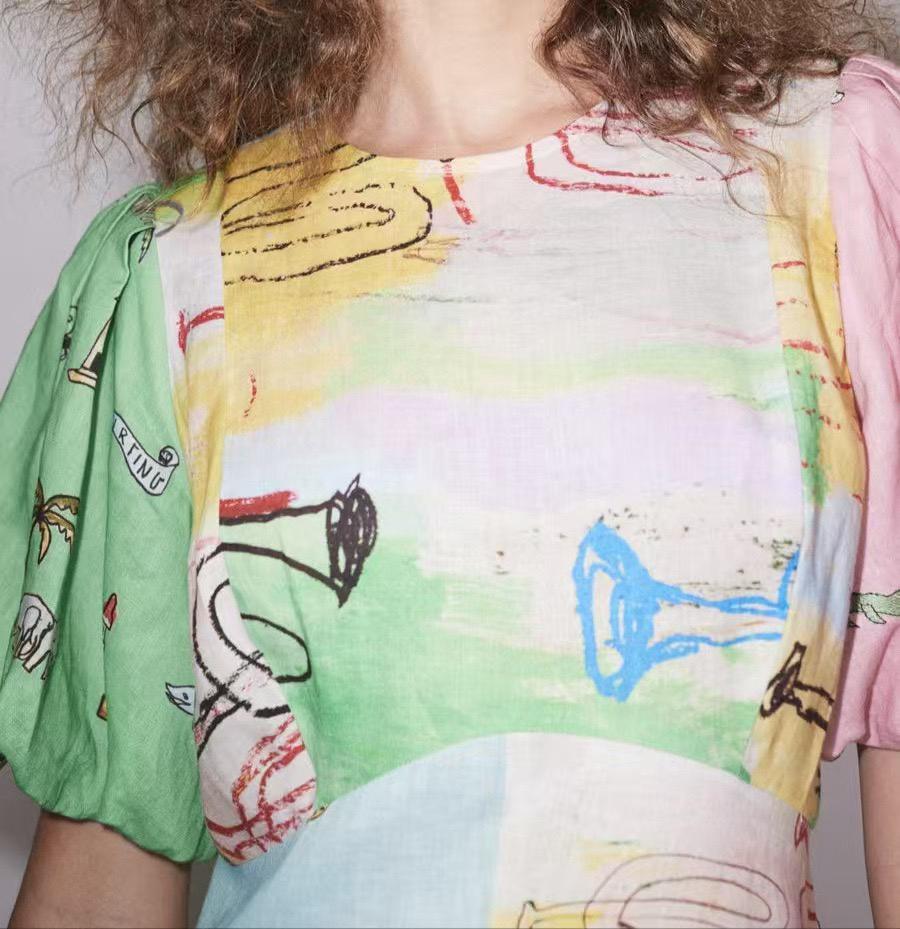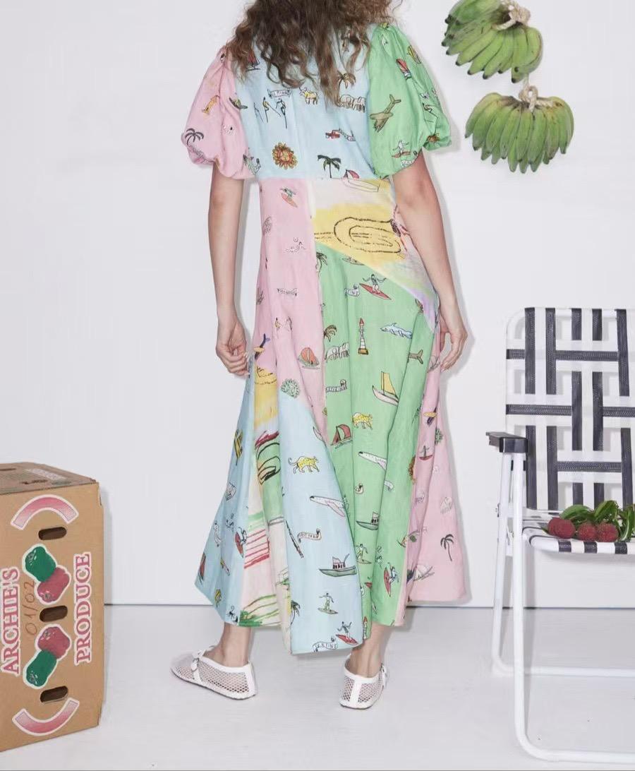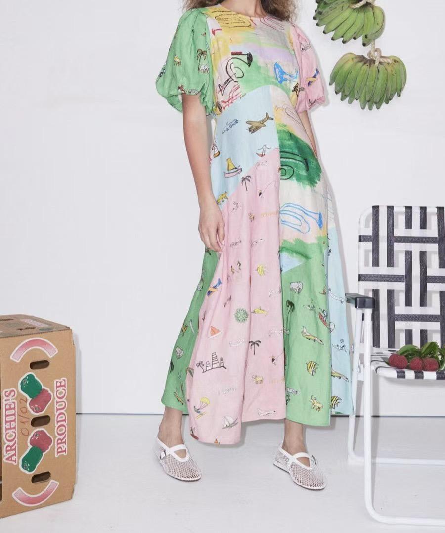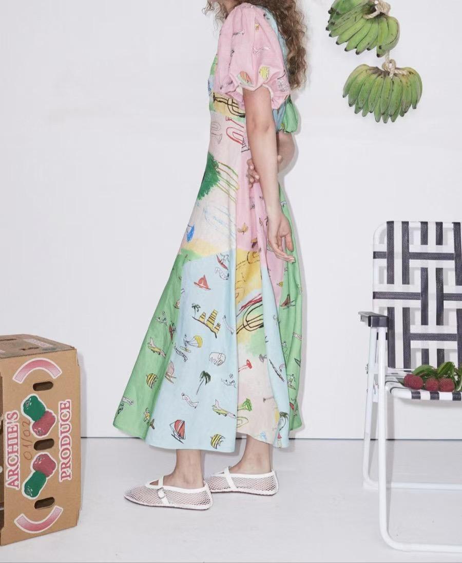 Her adımda bir tatil hikâyesi… “Holiday Sketch” elbise, rengarenk blok tasarımı ve tropik illüstrasyonlarıyla yazın enerjisini üzerinizde taşır. Palmiye ağaçları, deniz figürleri ve seyahat esintili detaylarla bezenmiş bu parça, özgün stil arayanlar için tasarlandı. Balon kolları ve zarif kesimiyle hem şık hem de rahat bir görünüm sunar.