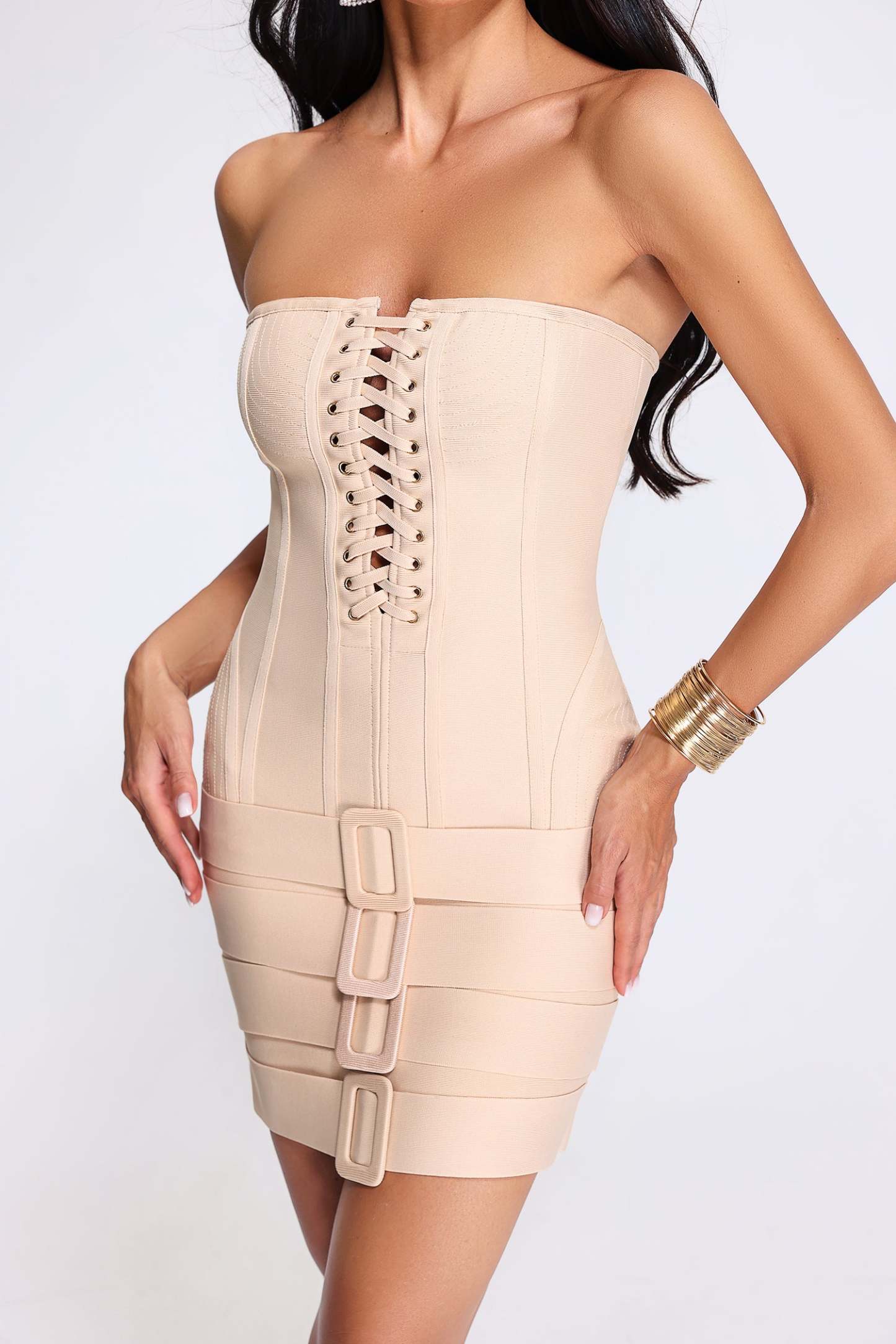 Keşfetmeye hazır mısınız? Bu beyaz bağcıklı mini bandaj elbise, özel günlerinizde göz kamaştırıcı bir görünüm sunar. %97 polyester ve %3 spandeks karışımı kumaşı sayesinde hem rahat hem de esnek bir yapıya sahiptir. Elbisenin cesur mini boyu, zarif teninizi sergilerken, ince ayarlanmış bağcıklar siluetinizi mükemmel şekilde vurgular.