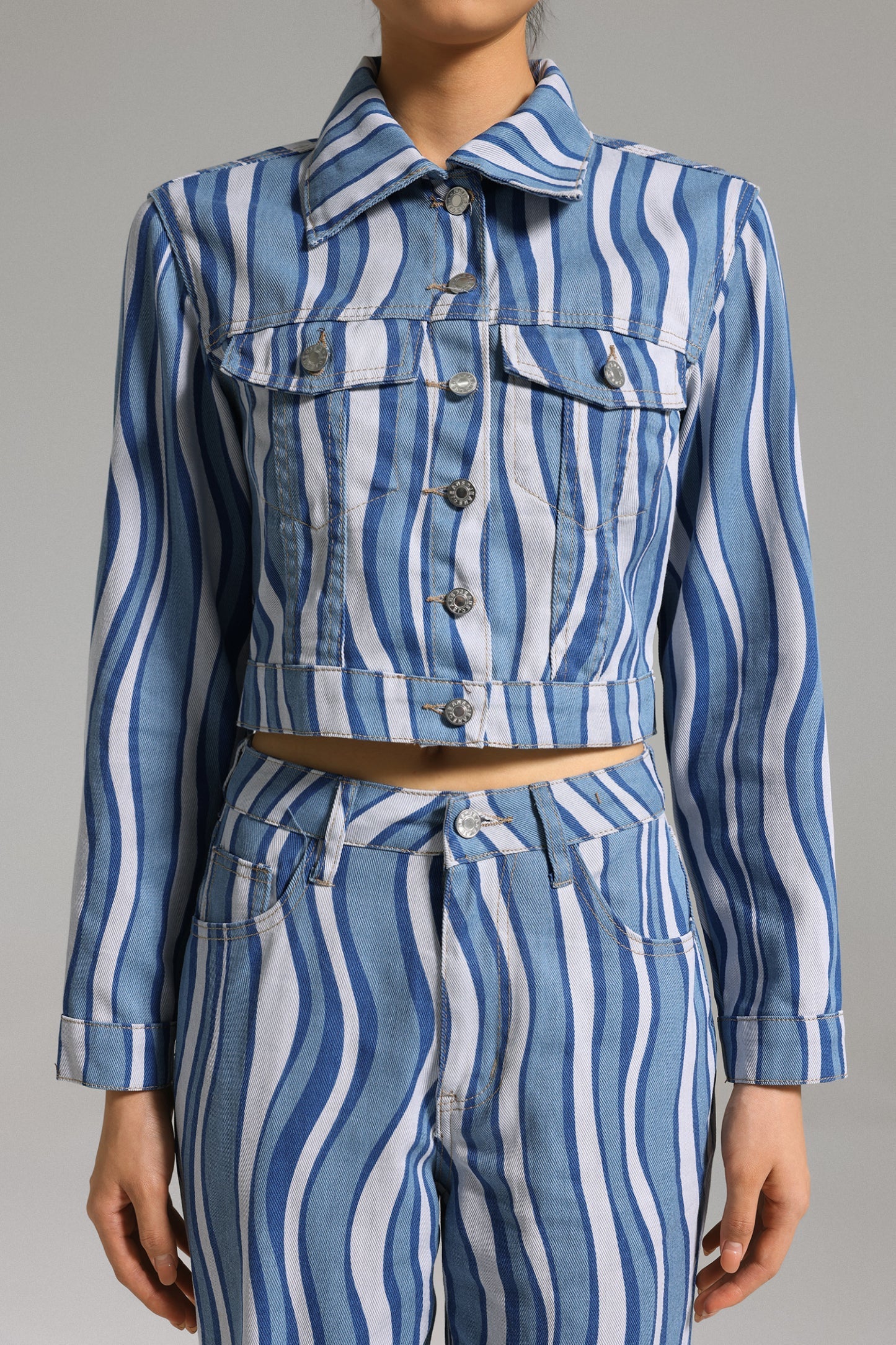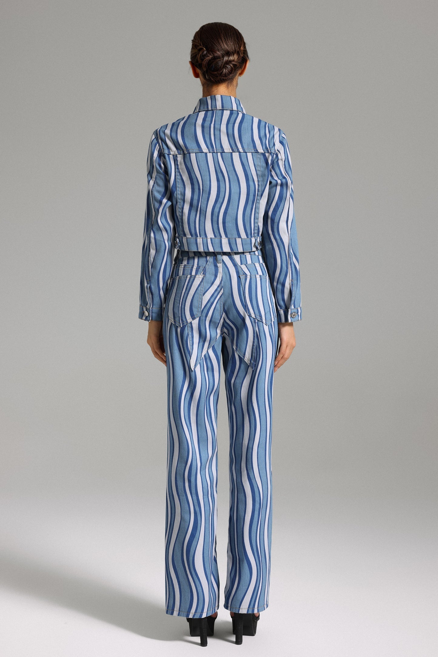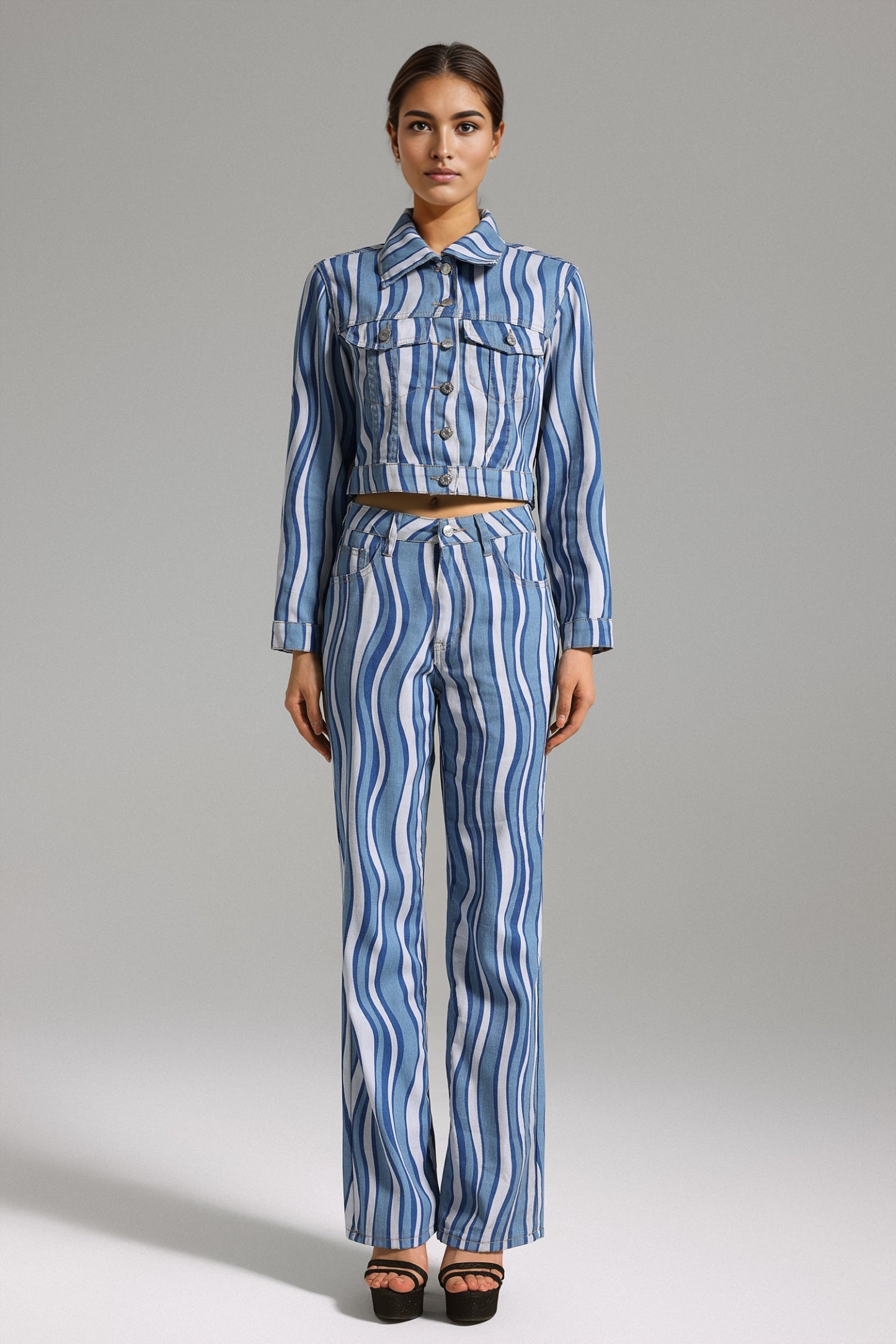Bu takım, düz ayakkabılardan topuklulara, çantadan takılara kadar her aksesuarla kolayca kombinlenebilir. Tek parça halinde şıklığınızı tamamlayacak Ilsa Dalgalı Çizgili Denim Takım, gardırobunuzun vazgeçilmezlerinden biri olmaya aday.