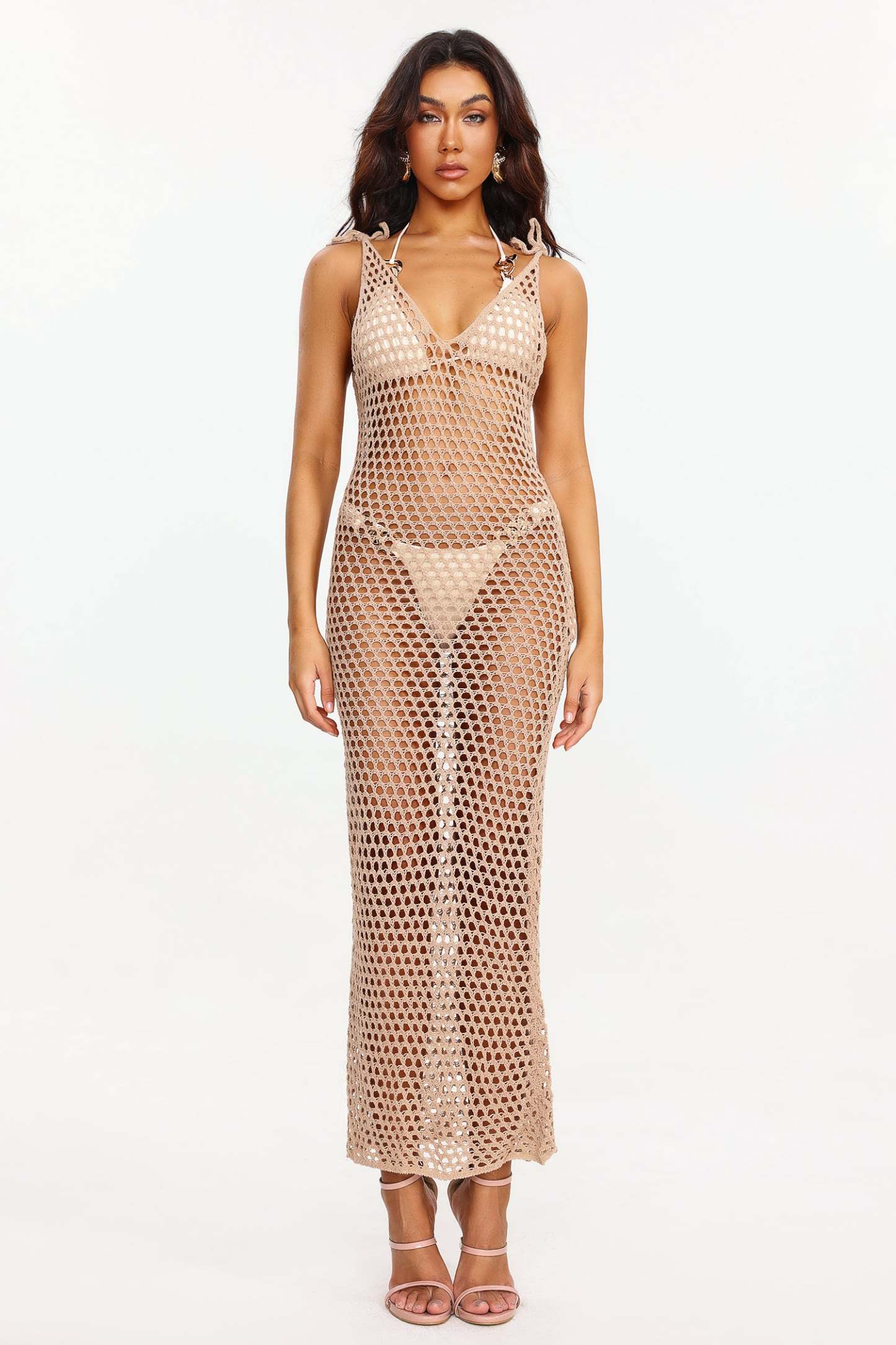 Yaz aylarında plaj partilerinden, gece davetlerine kadar her türlü etkinlik için ideal olan bu askılı örgü elbise, bağcıklı tasarımı ile feminen bir etki yaratır. Bikini içermeyen bu ürün, tek başına zarif bir görünüm sunar.