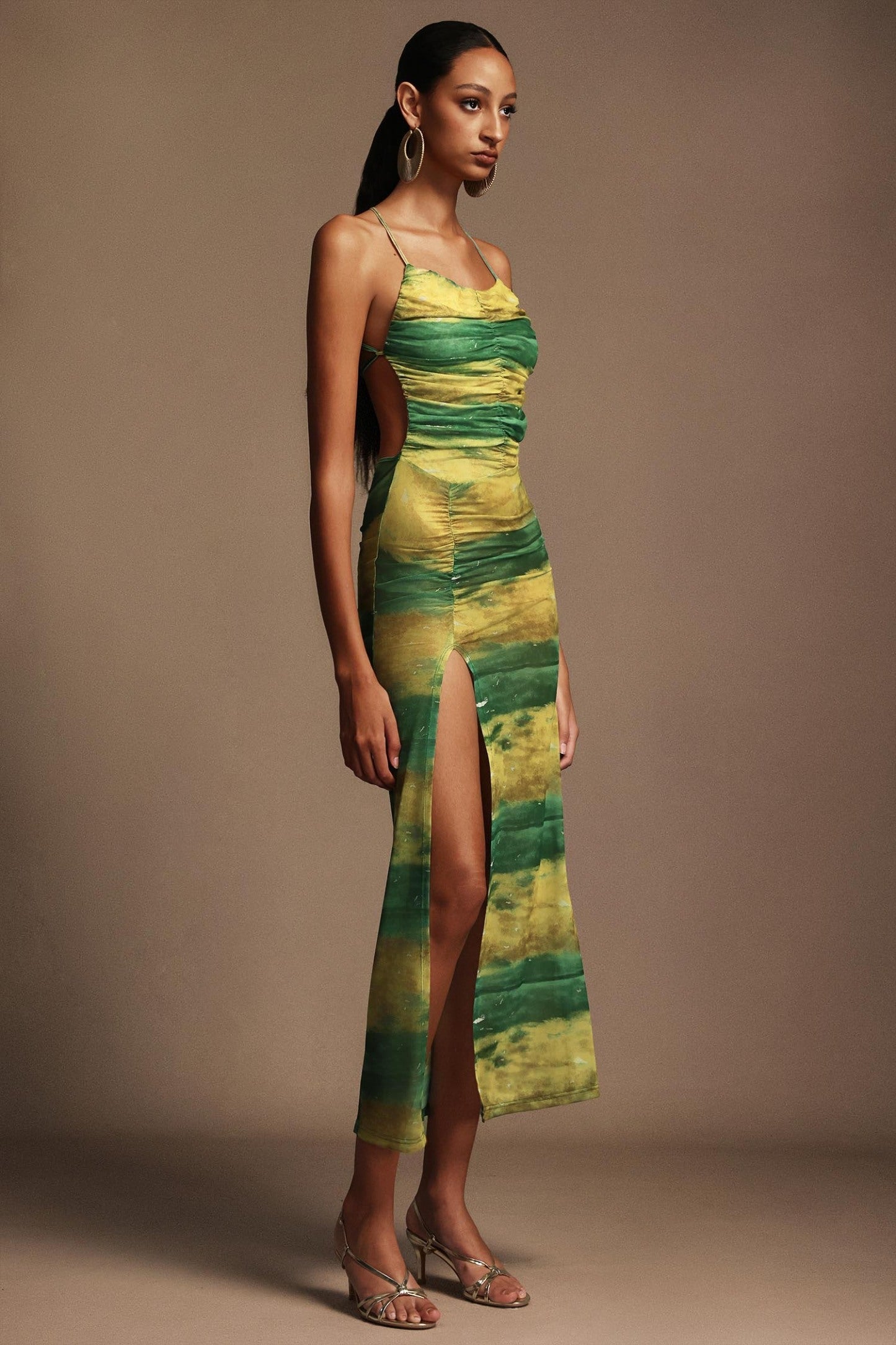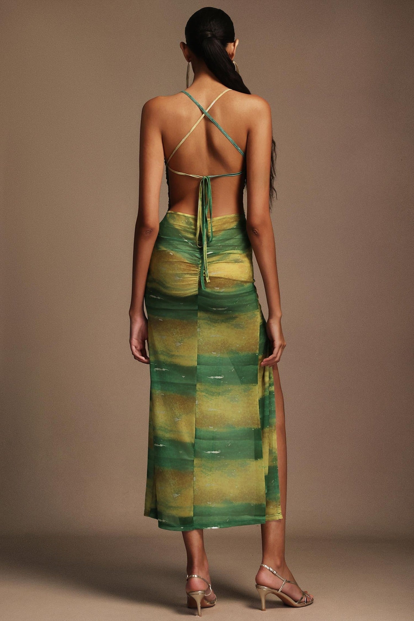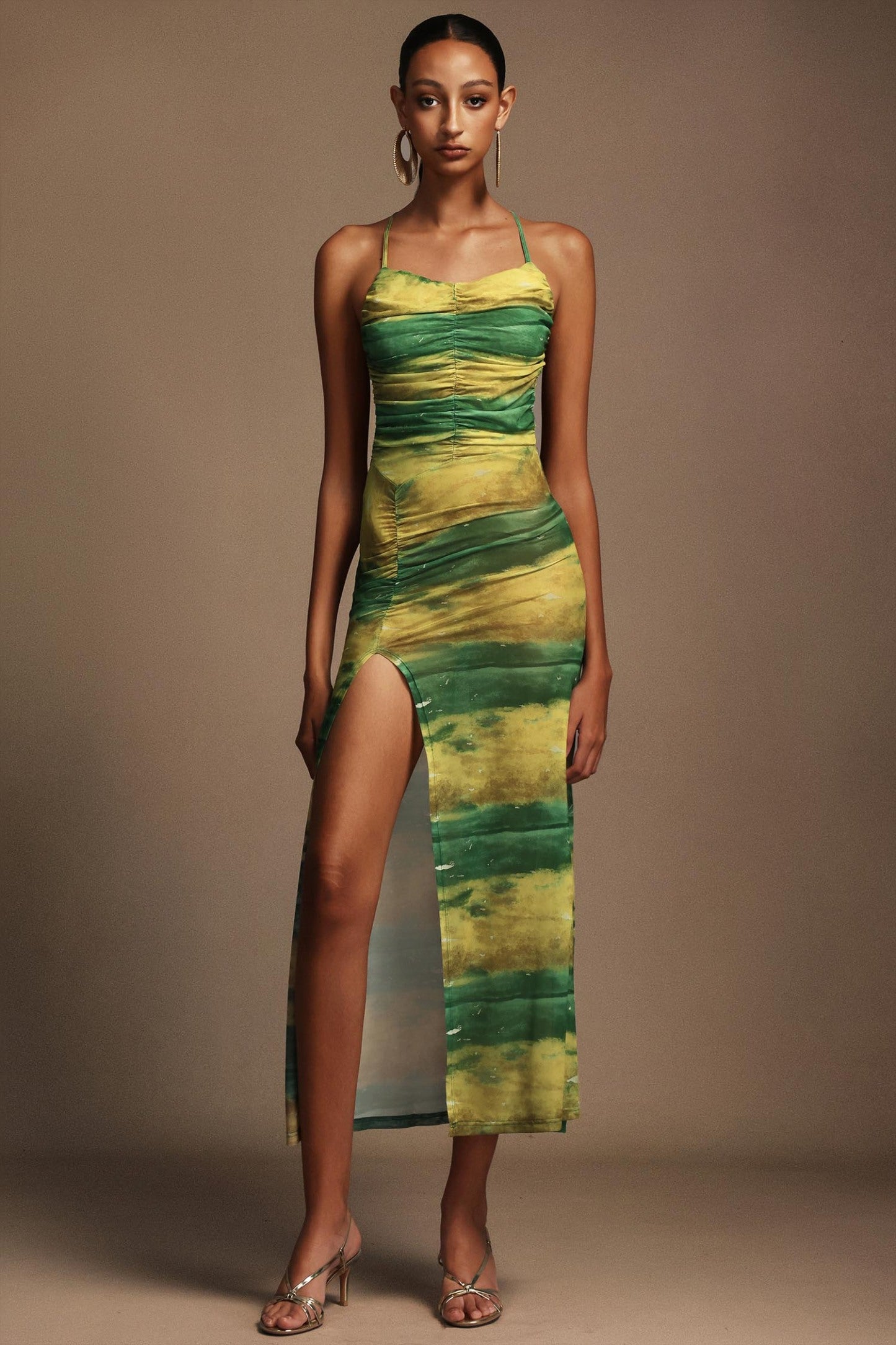 Modern tasarımı ve dikkat çekici stili ile ön plana çıkan "Irana Baskılı Yırtmaçlı Açık Sırtlı Midi Elbise", şıklığı ve rahatlığı bir arada sunuyor. Bu özel üretim elbise, vücudu saran kesimi ve elastik kumaşı ile mükemmel bir uyum sağlarken, açık sırt detayı ile feminen bir hava katıyor.