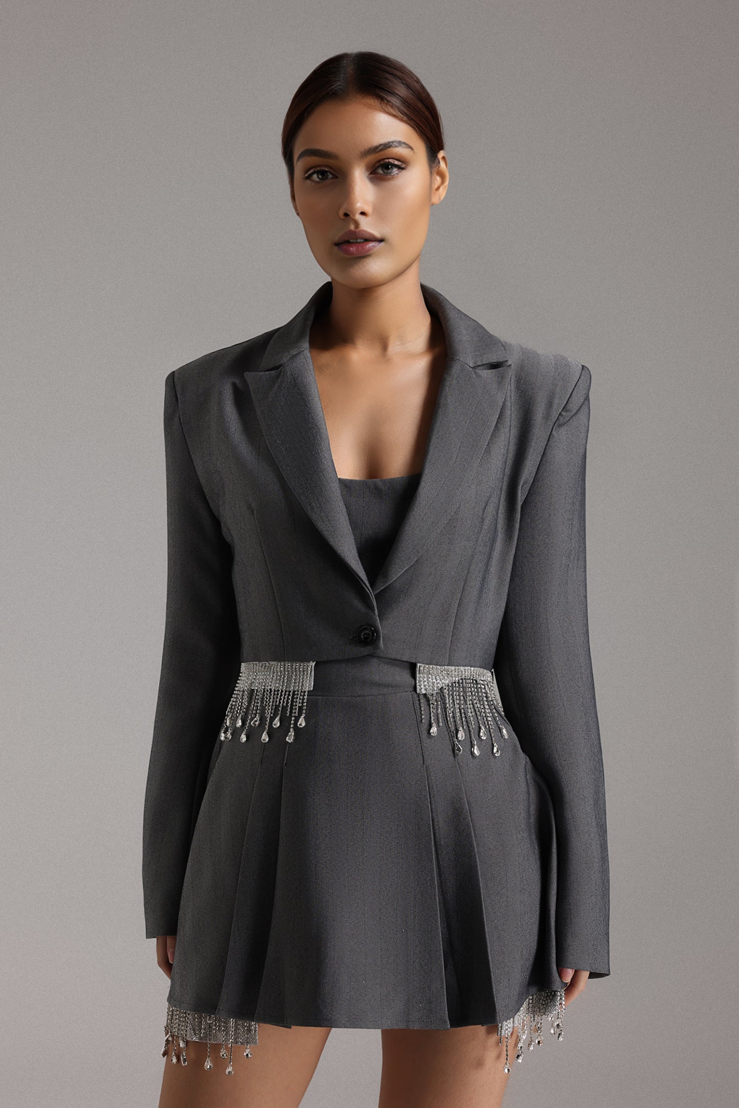 Jacova markasının özel tasarımı olan bu gri taş detaylı püskül blazer takım, göz alıcı detaylarıyla dikkat çeker. Ürün, sadece kaliteli malzemeler kullanılarak üretilmiş olup, özgün kesimi ile öne çıkar. Modelin giydiği S bedendir ve bu parça, vücut ölçülerine uygun olarak tasarlanmıştır.