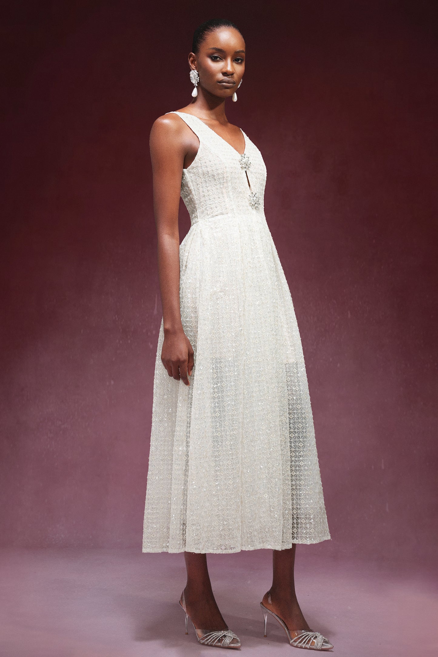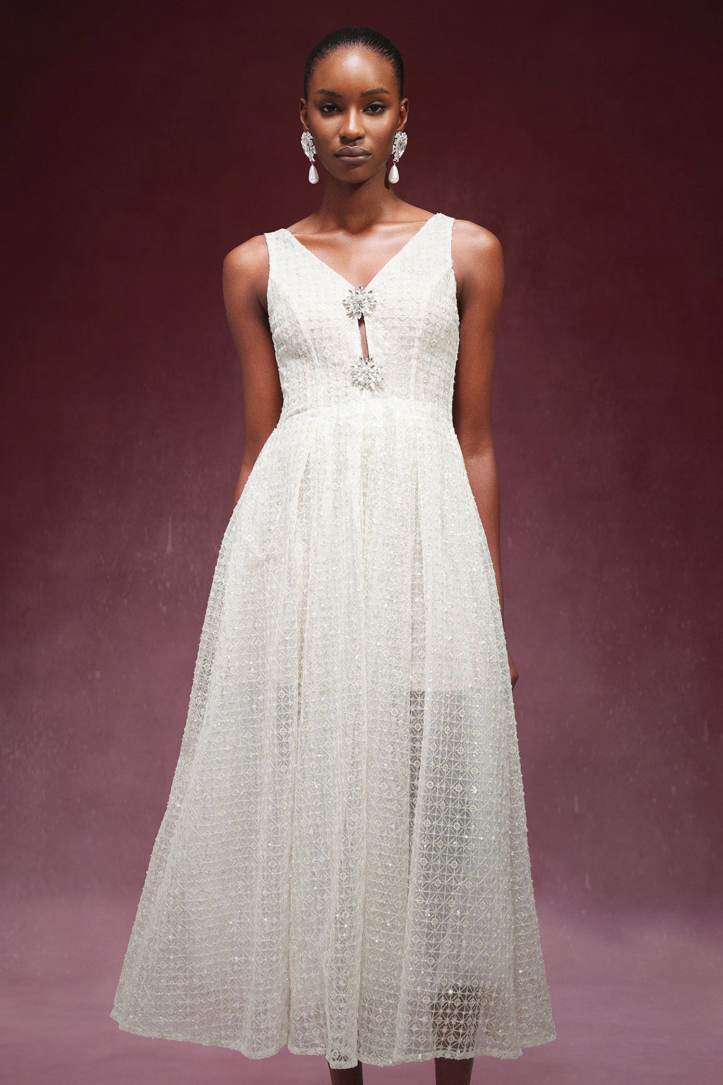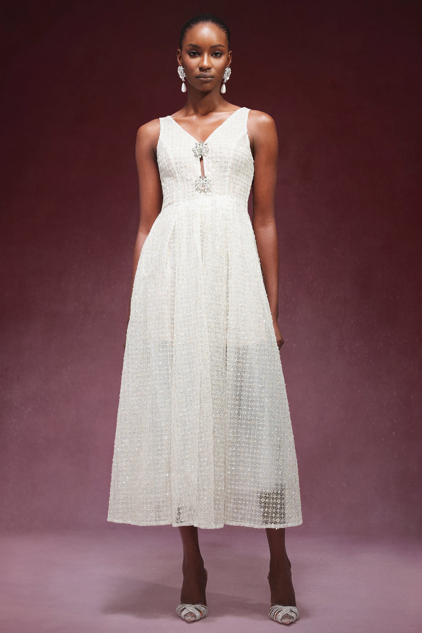 Kaylee Derin V Yaka Taş Detaylı Kolsuz Midi Elbise