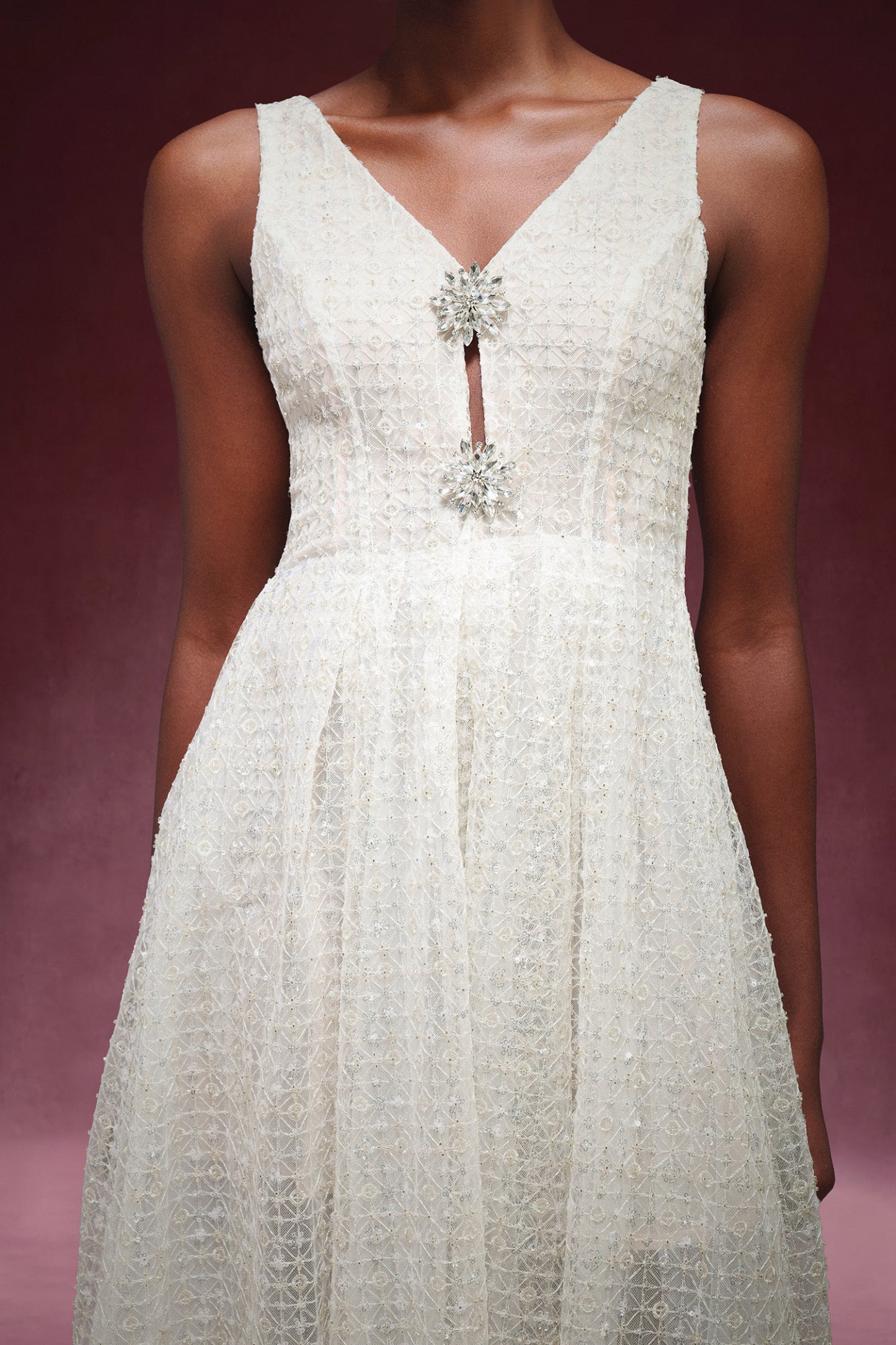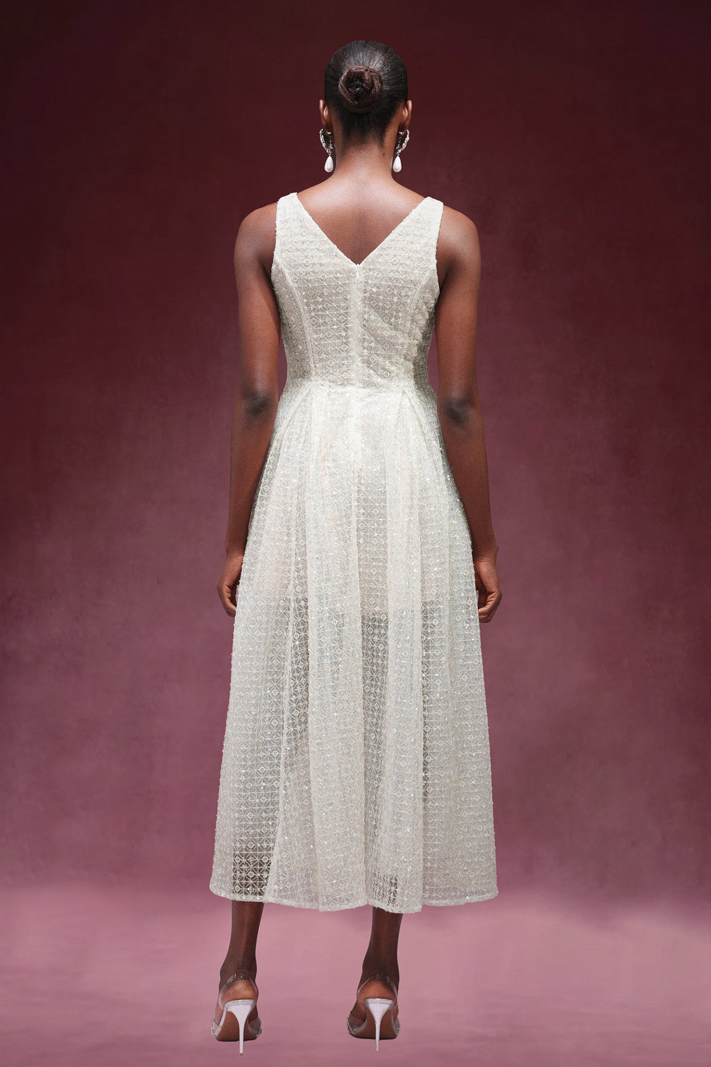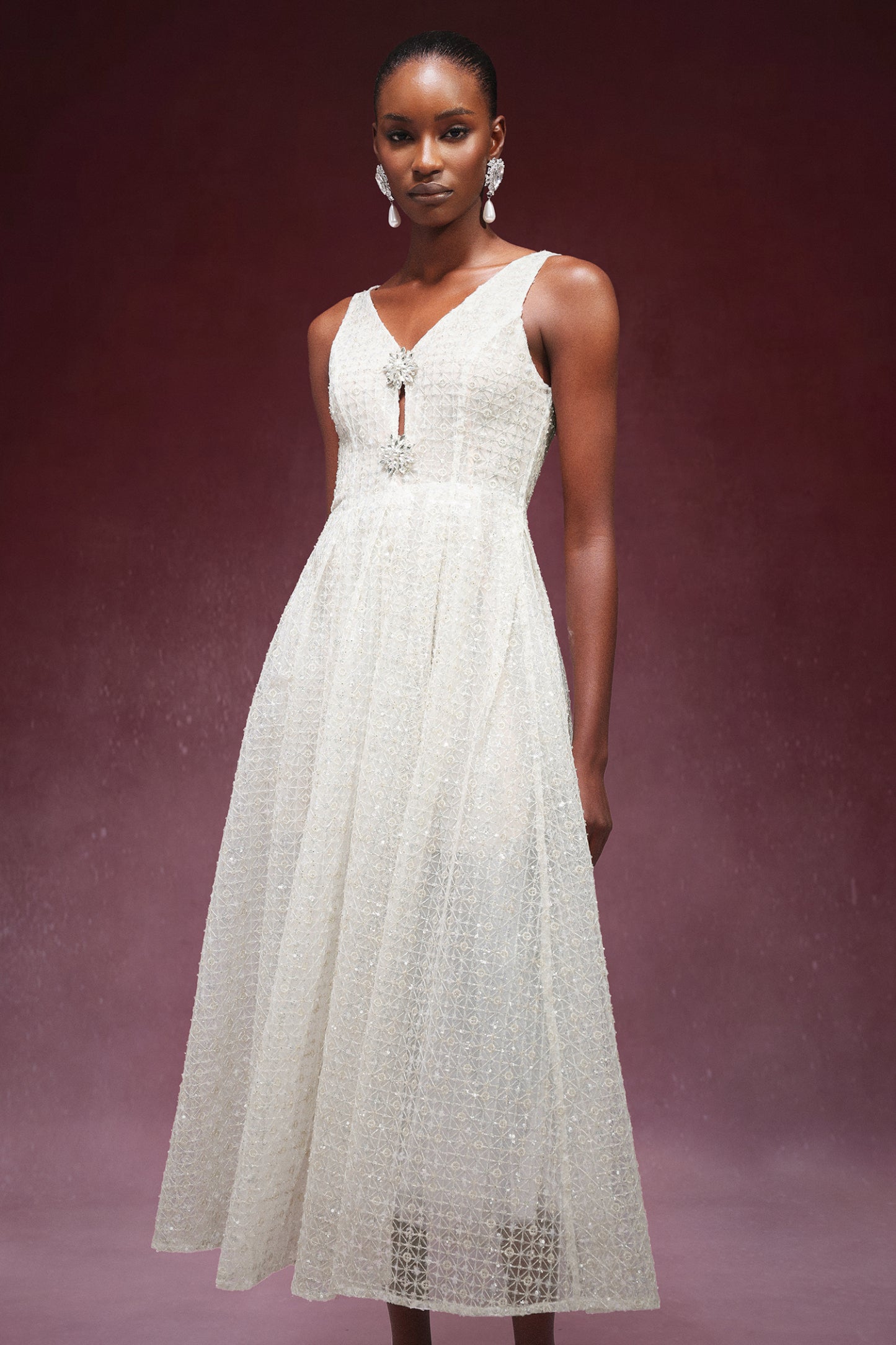 Kaylee Derin V Yaka Taş Detaylı Kolsuz Midi Elbise