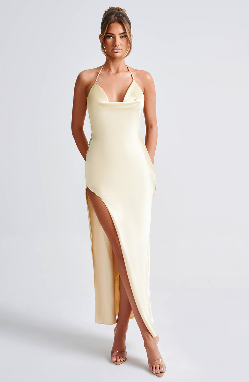 Saten sırt dekolteli yırtmaçlı uzun elbise krem rengi ile şıklığı ve zarafeti bir arada sunar. İnce saten kumaştan üretilmiş, vücuda oturan kesimi ve çapraz bağlama detayı ile modern bir görünüm yakalar. Yüksek yırtmaç sayesinde hareket özgürlüğü sağlar, yaz davetleri ve özel geceler için idealdir. Dökümlü yakası ve açık sırt tasarımı ile feminen hatlarınızı ön plana çıkarır. Konforlu ve şık bu tasarım ile gecenin yıldızı olun, şimdi sipariş verin!