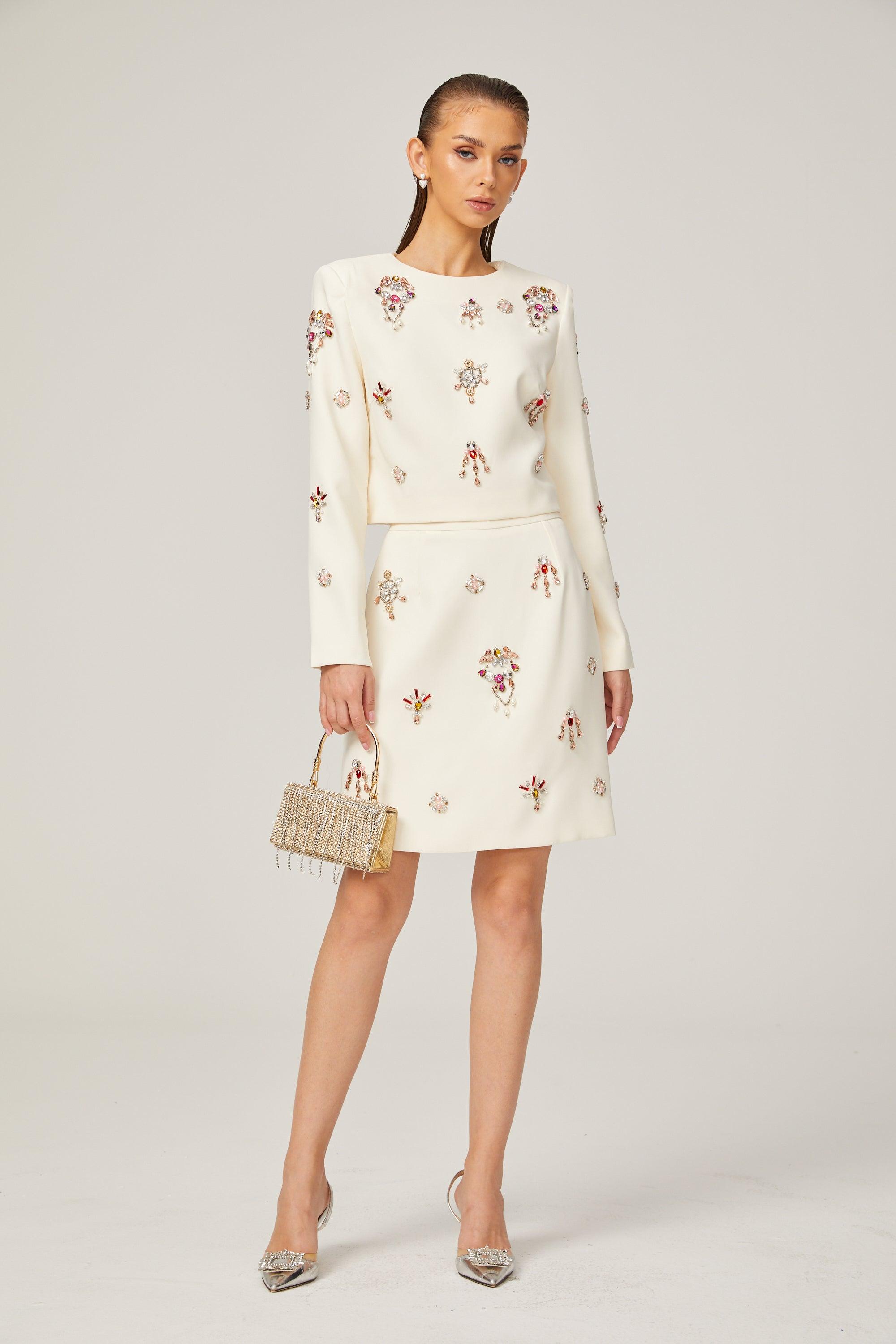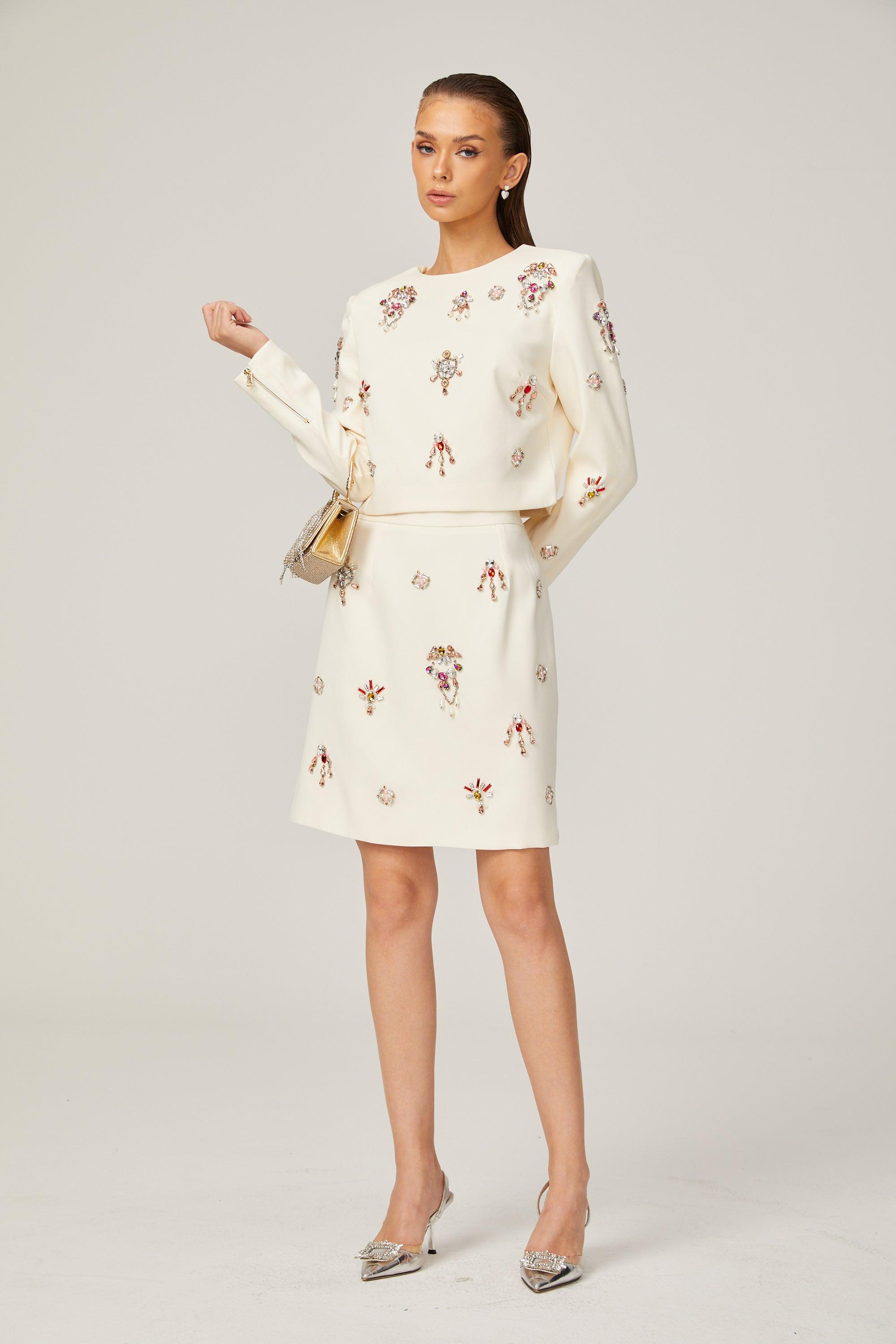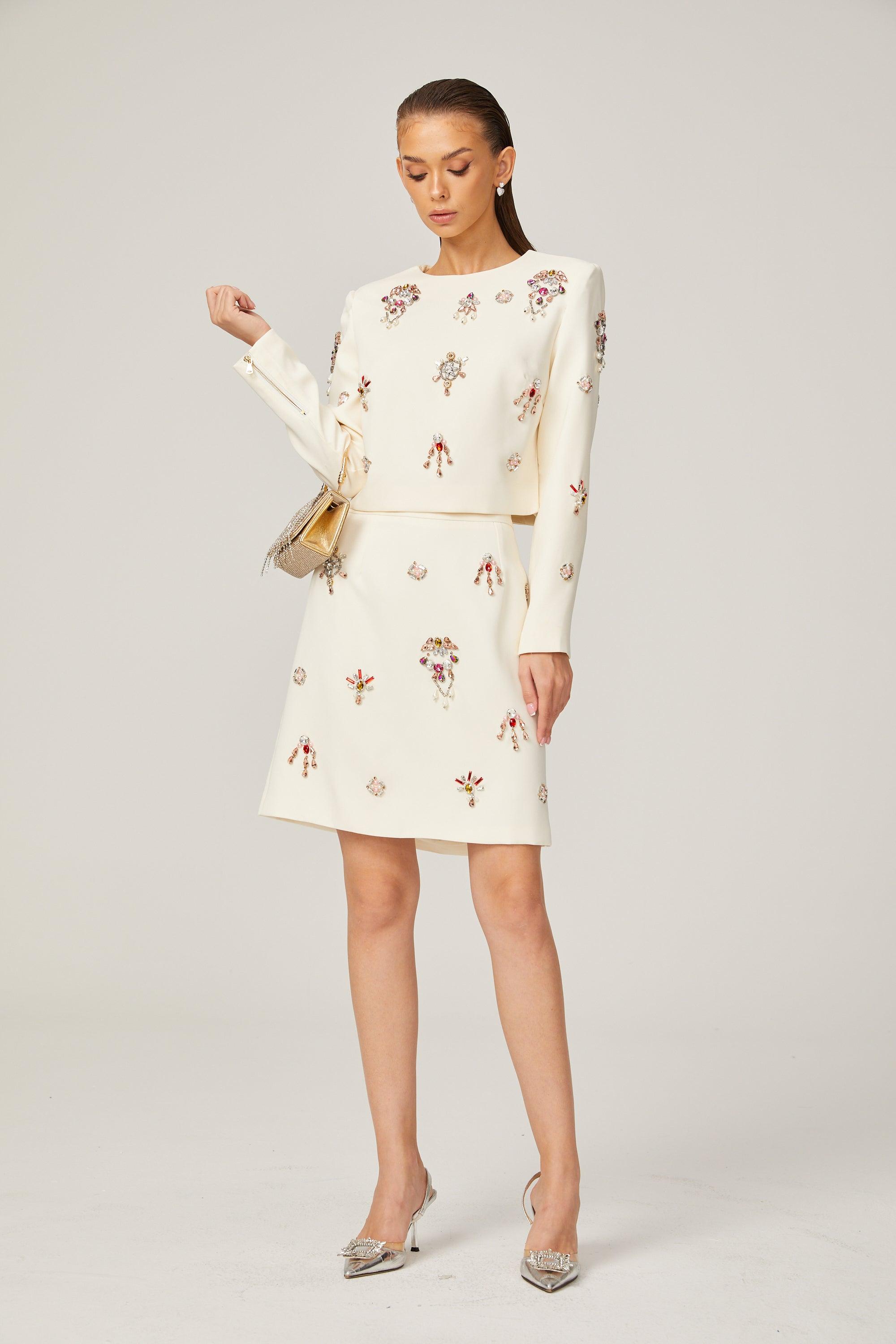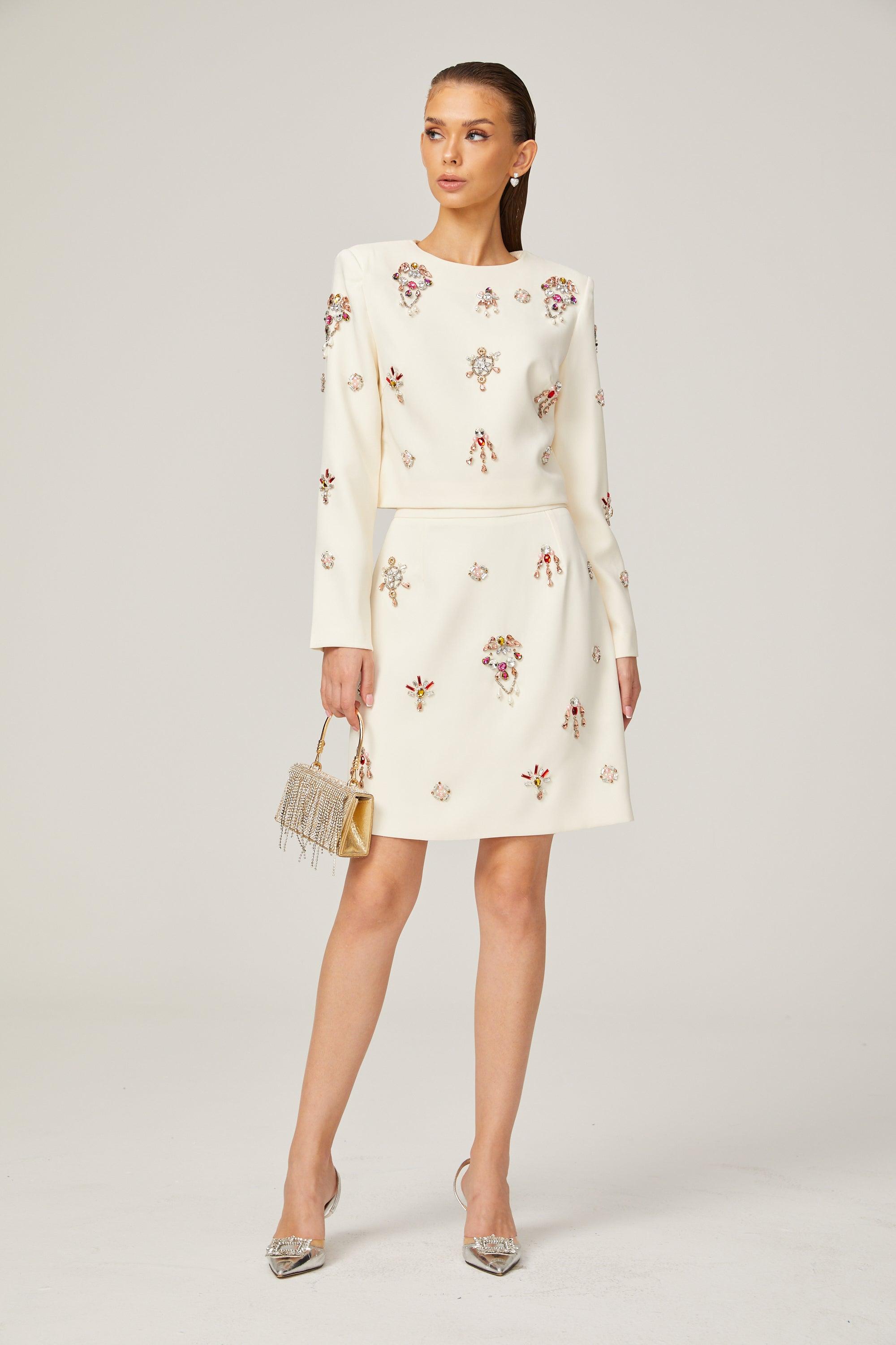 Kraliyet zarafetinden ilham alan bu taş işlemeli krem elbise, zarif detayları ve şık kesimiyle özel davetler için tasarlandı. Parıltısıyla her adımınızda göz kamaştıracaksınız!