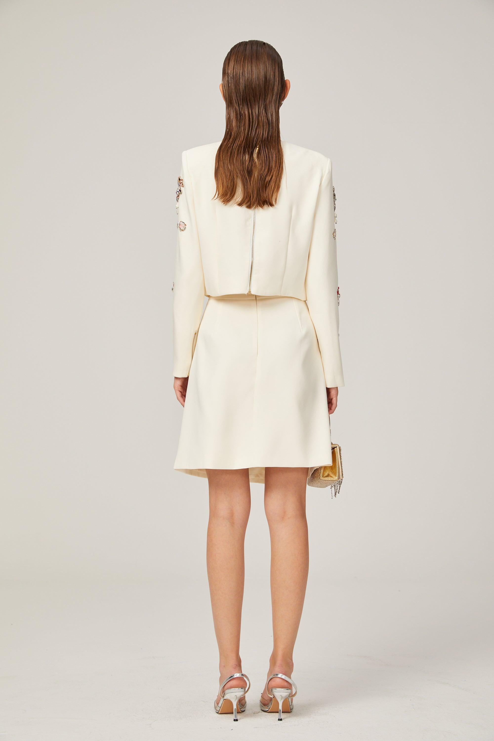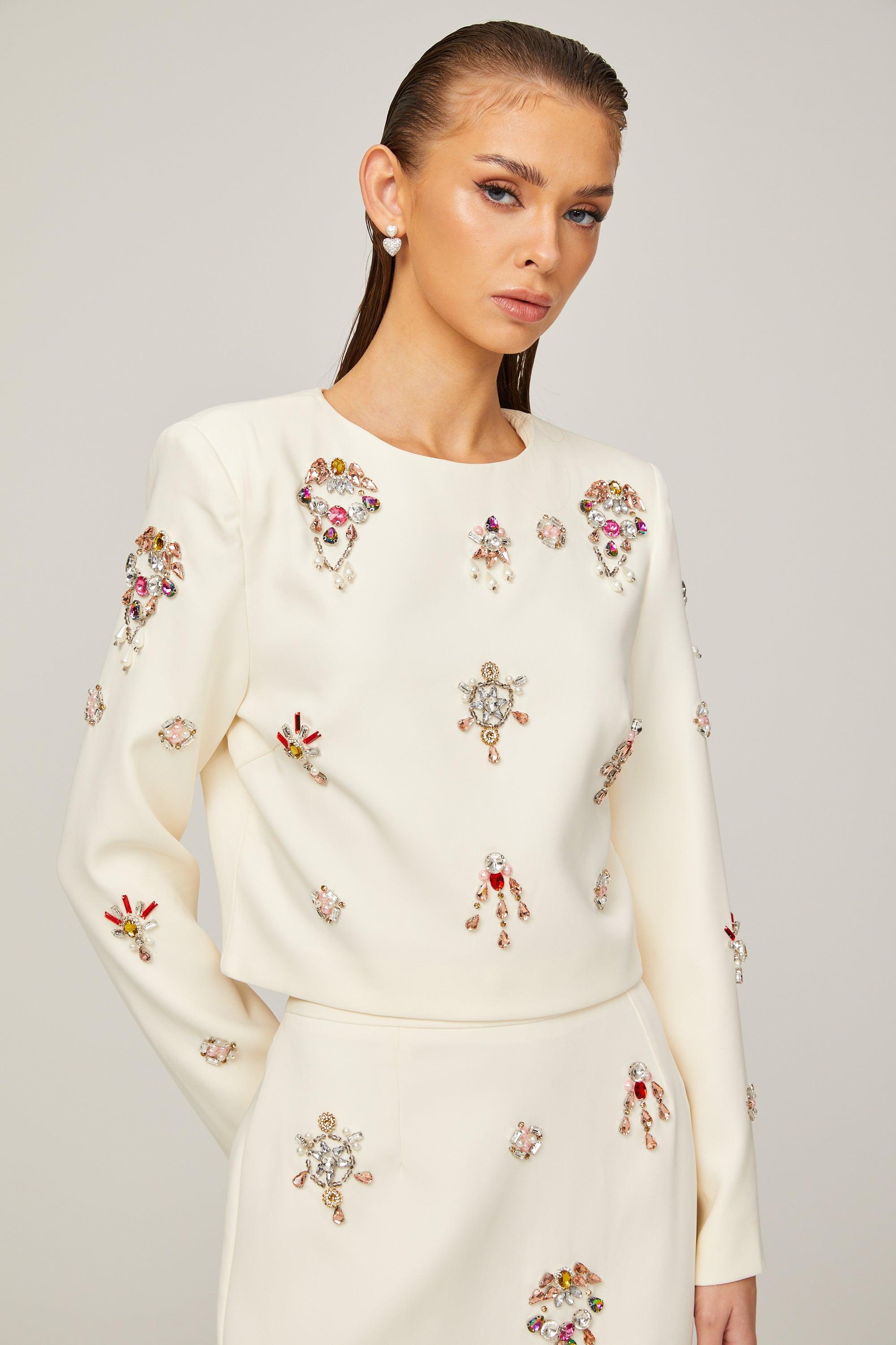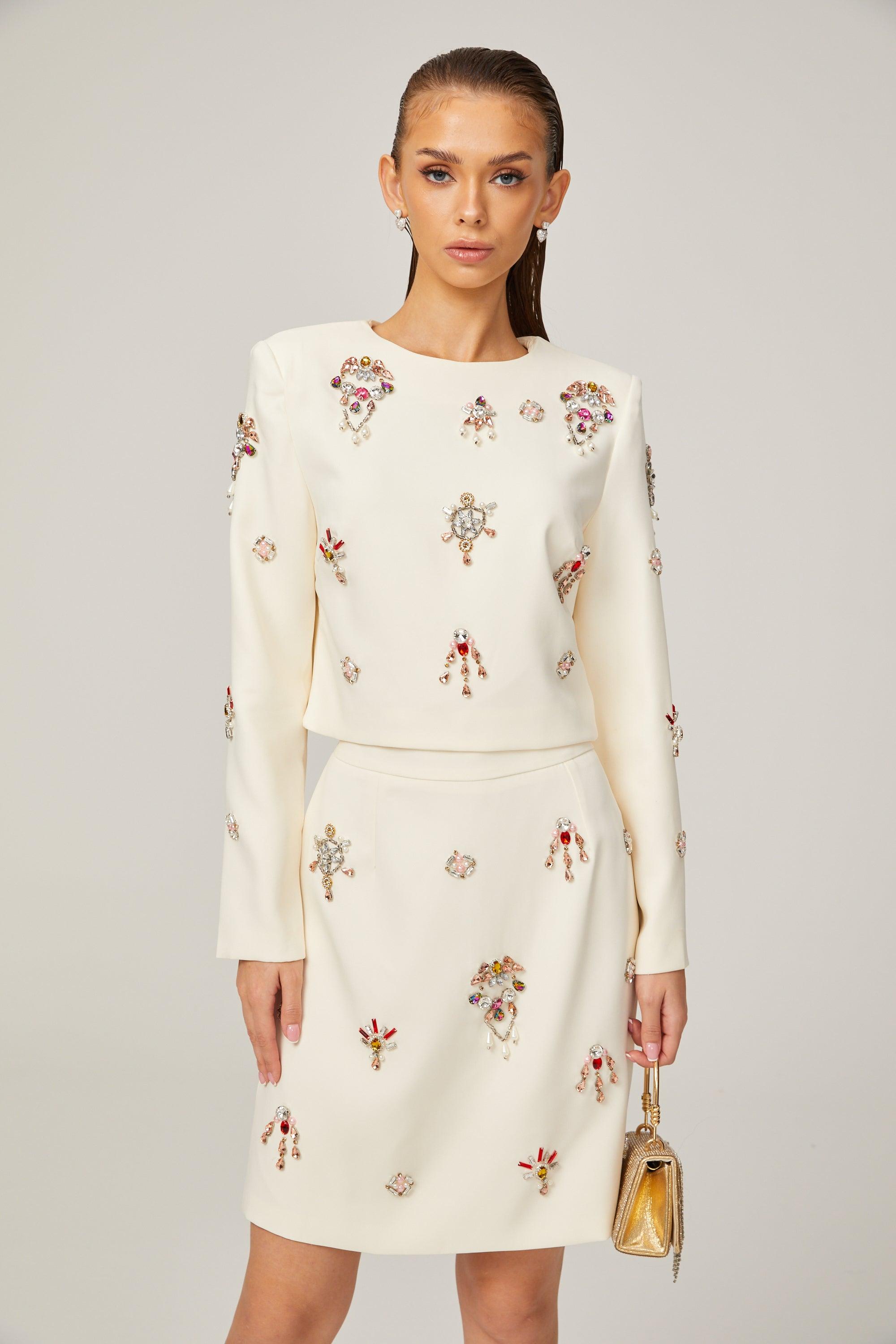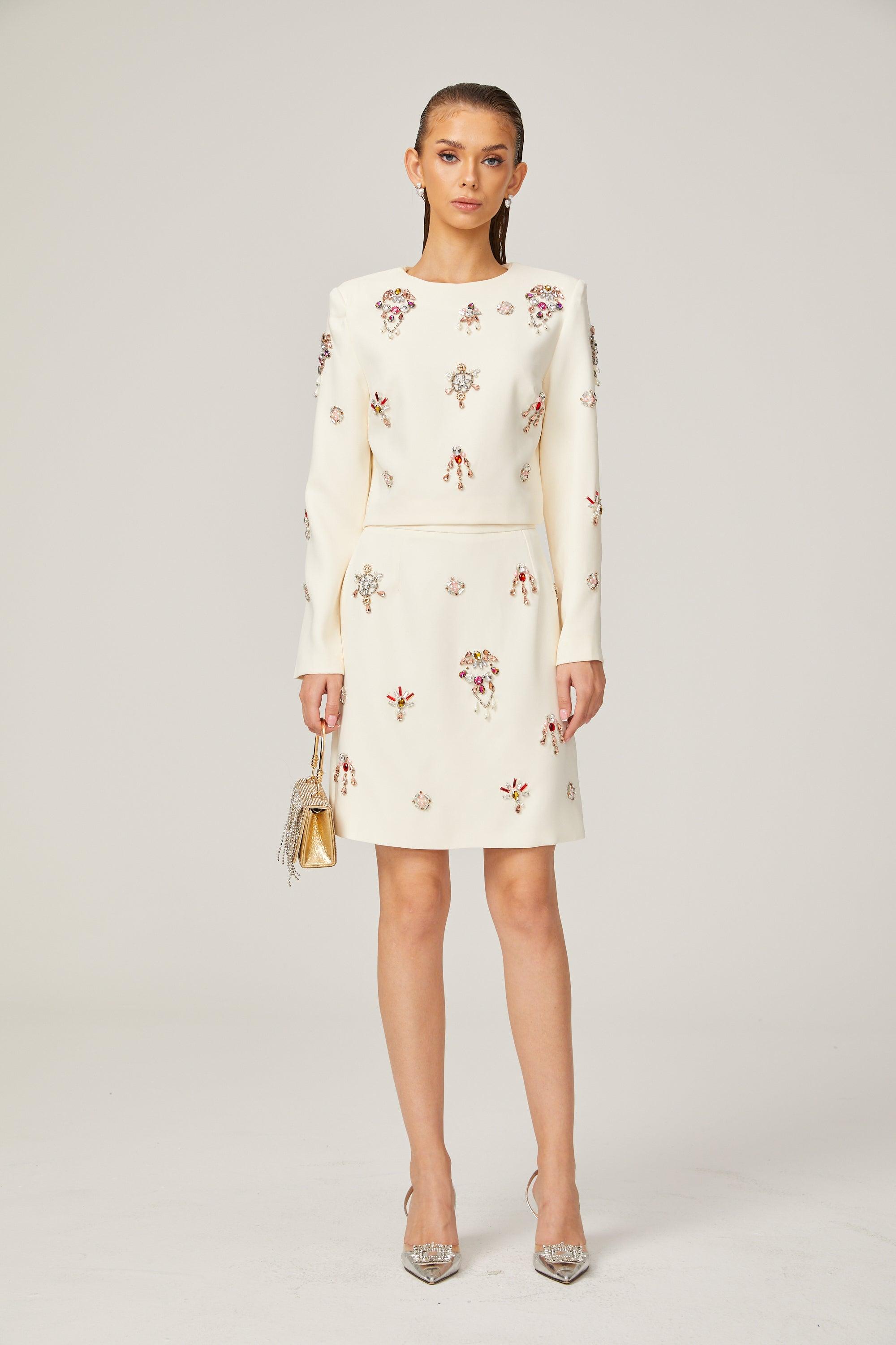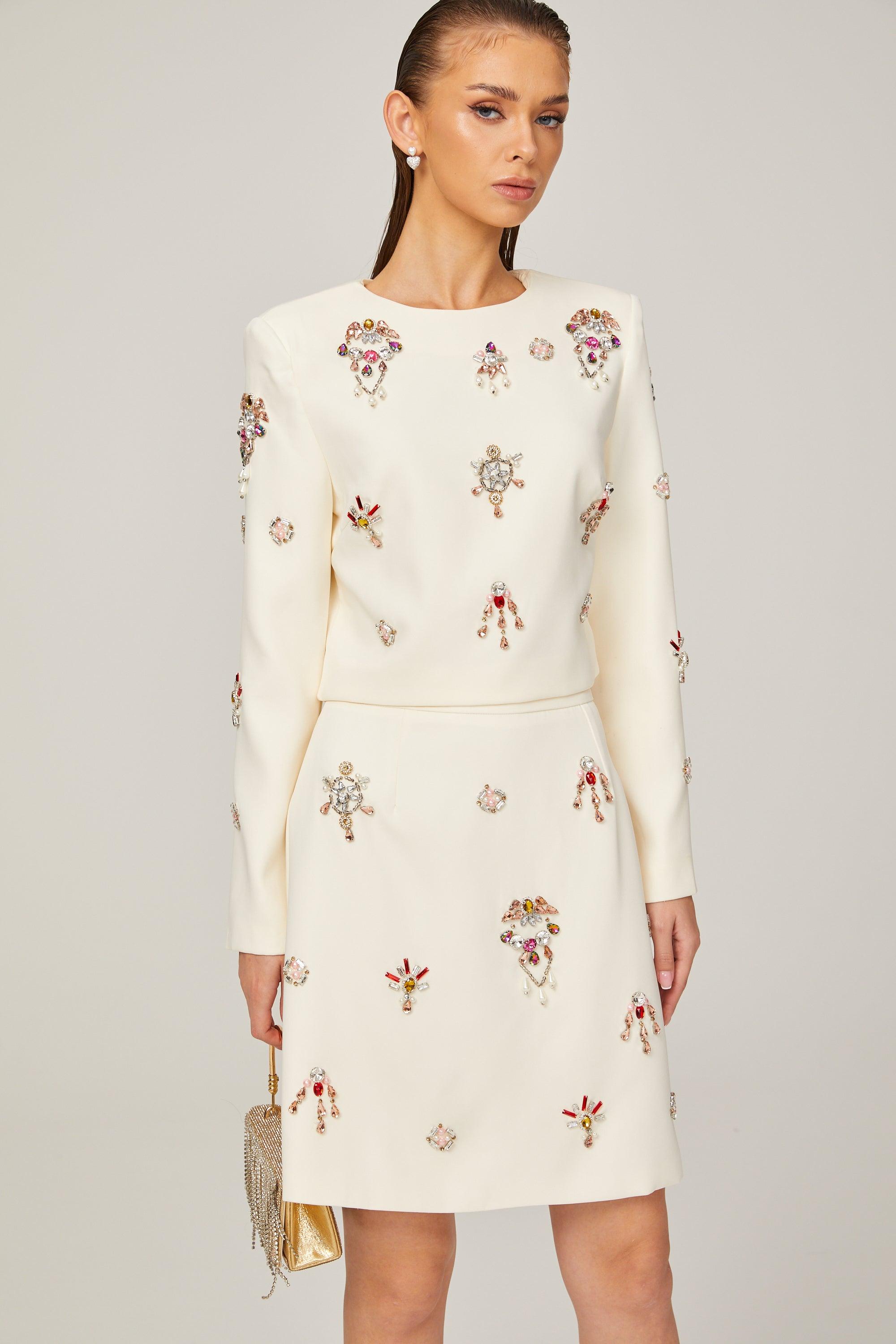Kraliyet zarafetinden ilham alan bu taş işlemeli krem elbise, zarif detayları ve şık kesimiyle özel davetler için tasarlandı. Parıltısıyla her adımınızda göz kamaştıracaksınız!