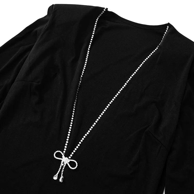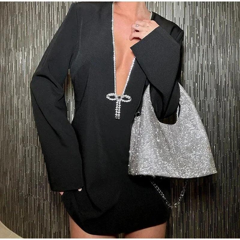 Çarpıcı kristal süslemelerle vurgulanan cüretkar bir dalma yakaya sahip bu şık siyah mini elbise ile cesur bir açıklama yapın. Özel kesim ve uzun kollu olarak tasarlanan bu elbise, zarafet ve şıklığın mükemmel bir karışımıdır. Parıldayan kristal fiyonk detayı lüks bir dokunuş katarak elbiseyi lüks etkinlikler ve göz alıcı akşamlar için ideal hale getirir.