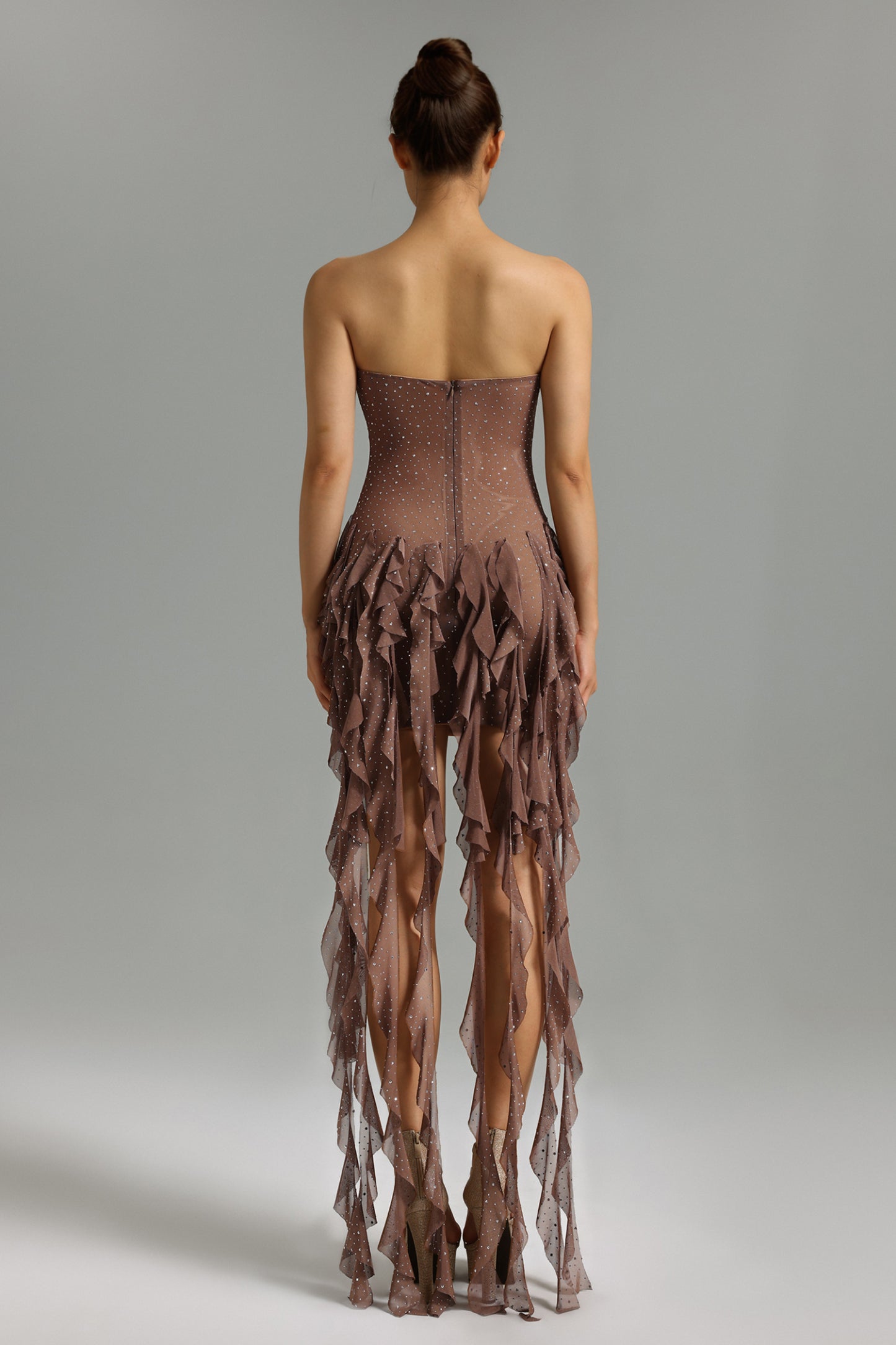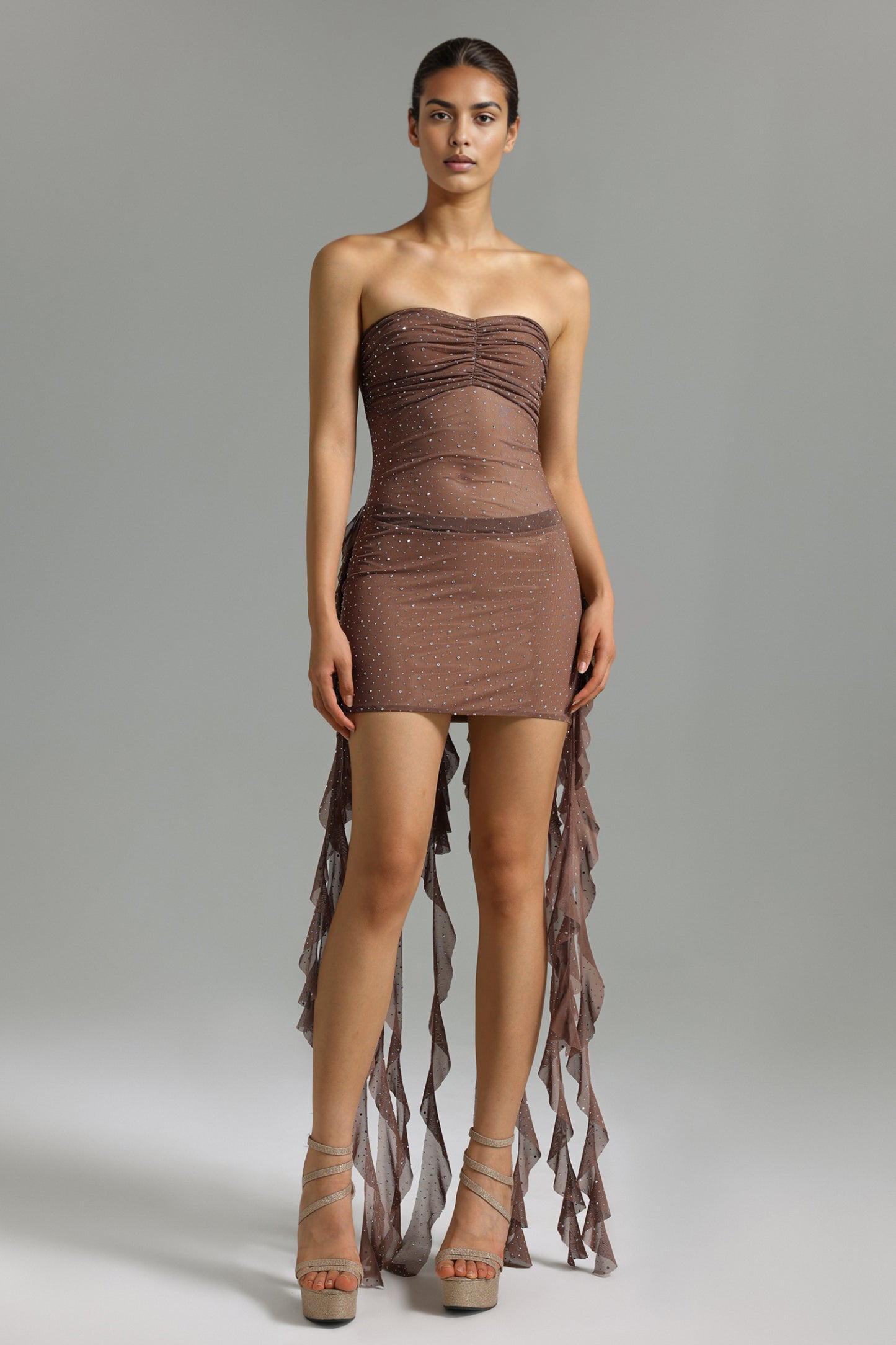 Kylli Taş Detaylı Volanlı Fileli Mini Elbise özgünlüğü ve şıklığı bir arada sunarak her ortamda göz kamaştıracak. Özel üretim bu elbisenin file detayları, taş işlemeleri ve volanları, feminenliği ön plana çıkaran zarif dokunuşlar sunar. Esnek kumaş yapısı sayesinde rahat bir kullanım sağlarken, vücut hatlarınızı şık bir biçimde sarar.