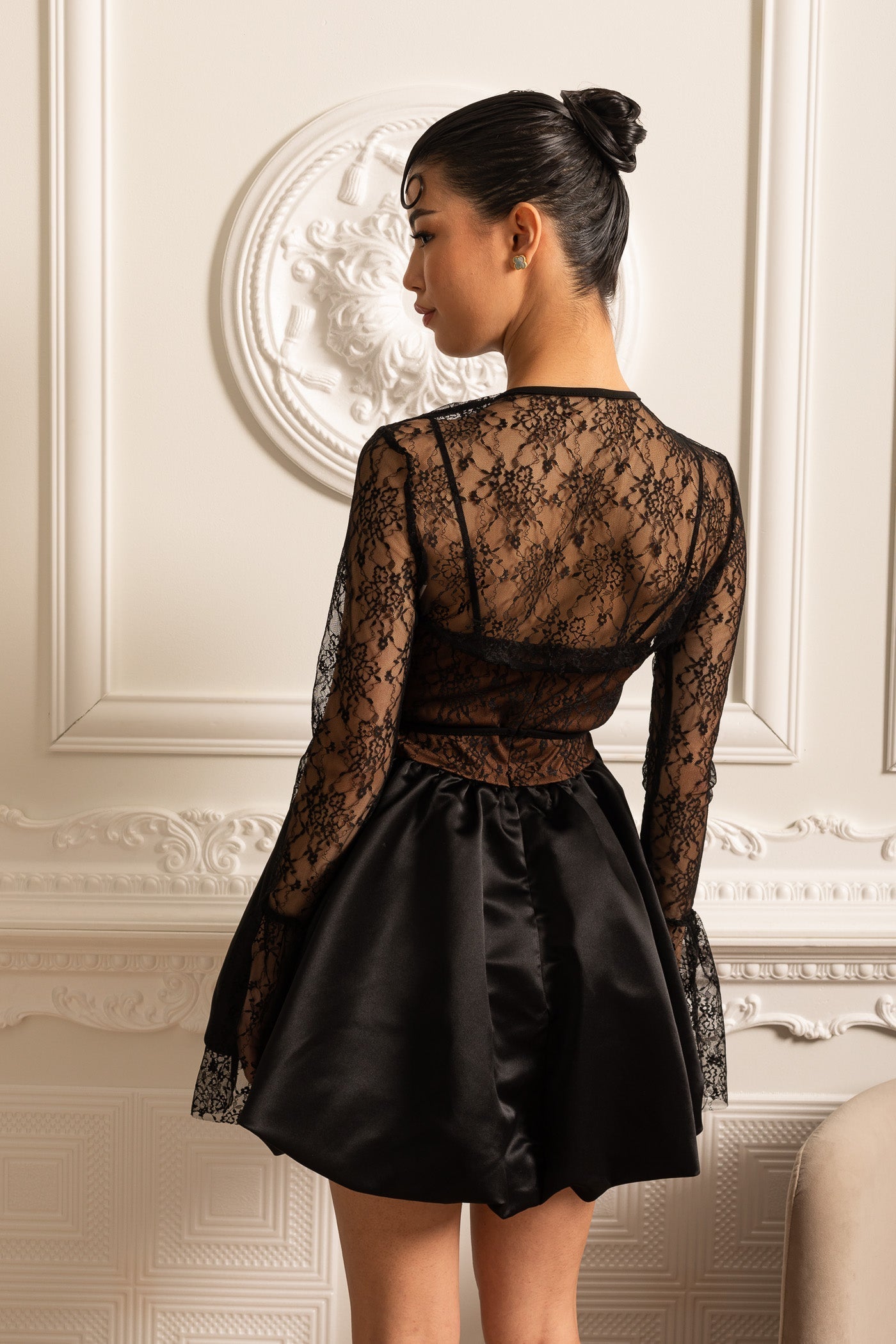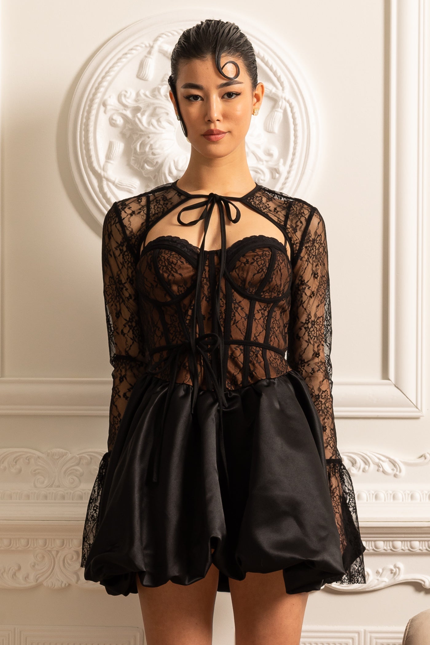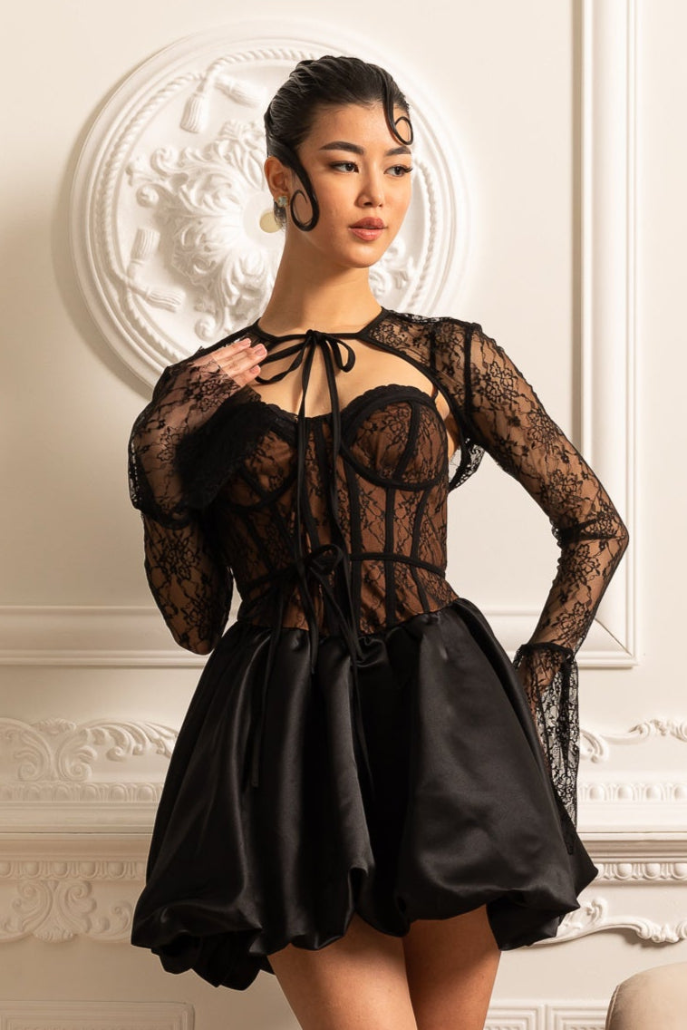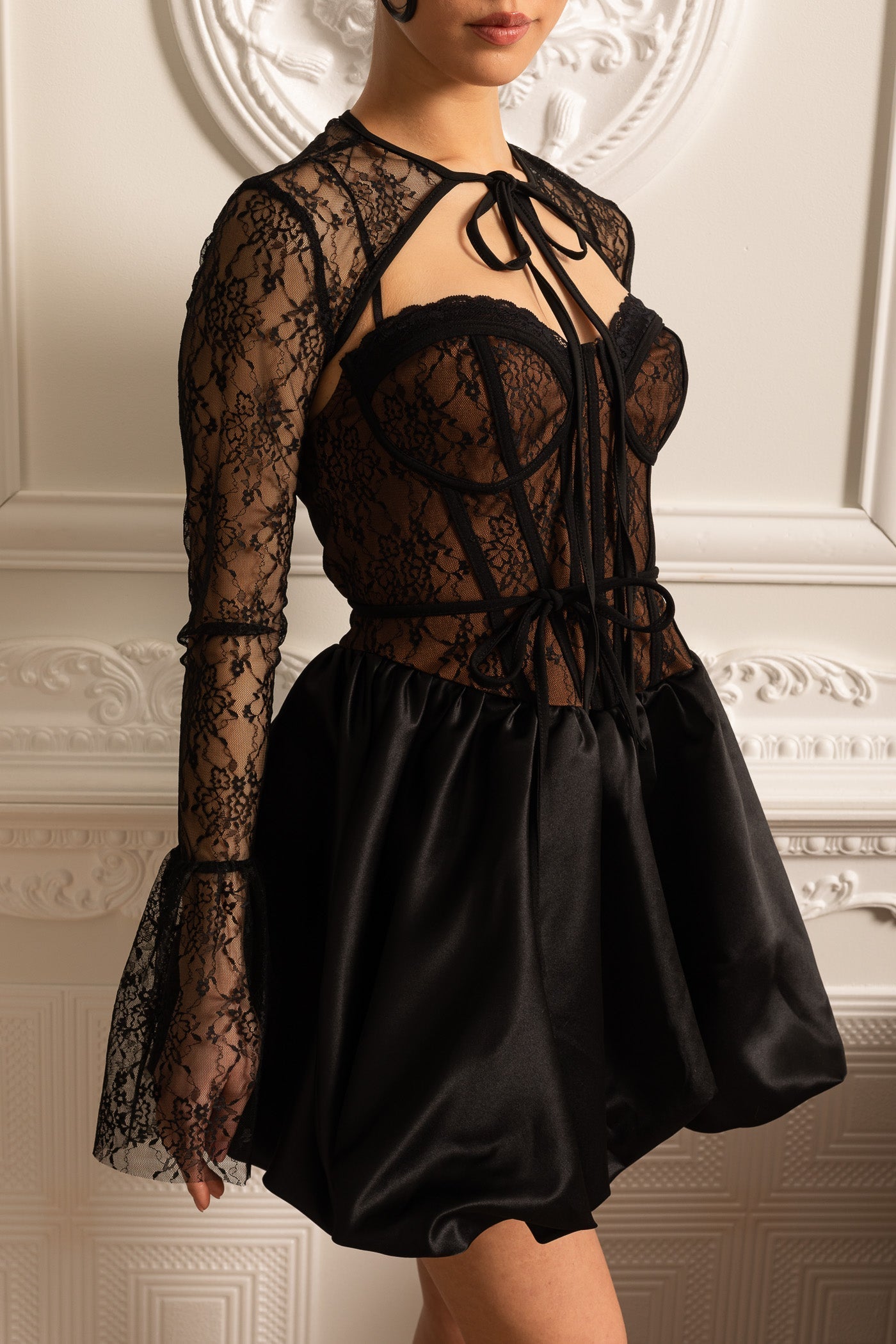 Siyah Kurdele Bağlamalı Yaka Detaylı Dantel Korseli Mini Elbise