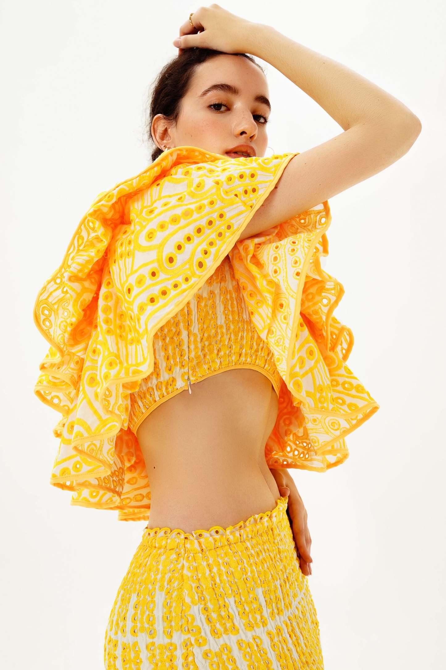 Bu zarif ikili set, özel günlerinizde tüm gözleri üzerinize çekecek. Üst kısmı tek omuzlu ve uzun kollu tasarımıyla modern bir çekicilik sunarken, ince işçiliğiyle dikkat çeken dantel detayları ve kat kat düşen volanlarla feminen bir hava katıyor. Alt kısmı halter kesimli ve esnek fishtail etek, vücut hatlarınızı mükemmel bir şekilde sararak zarif bir siluet oluşturur.