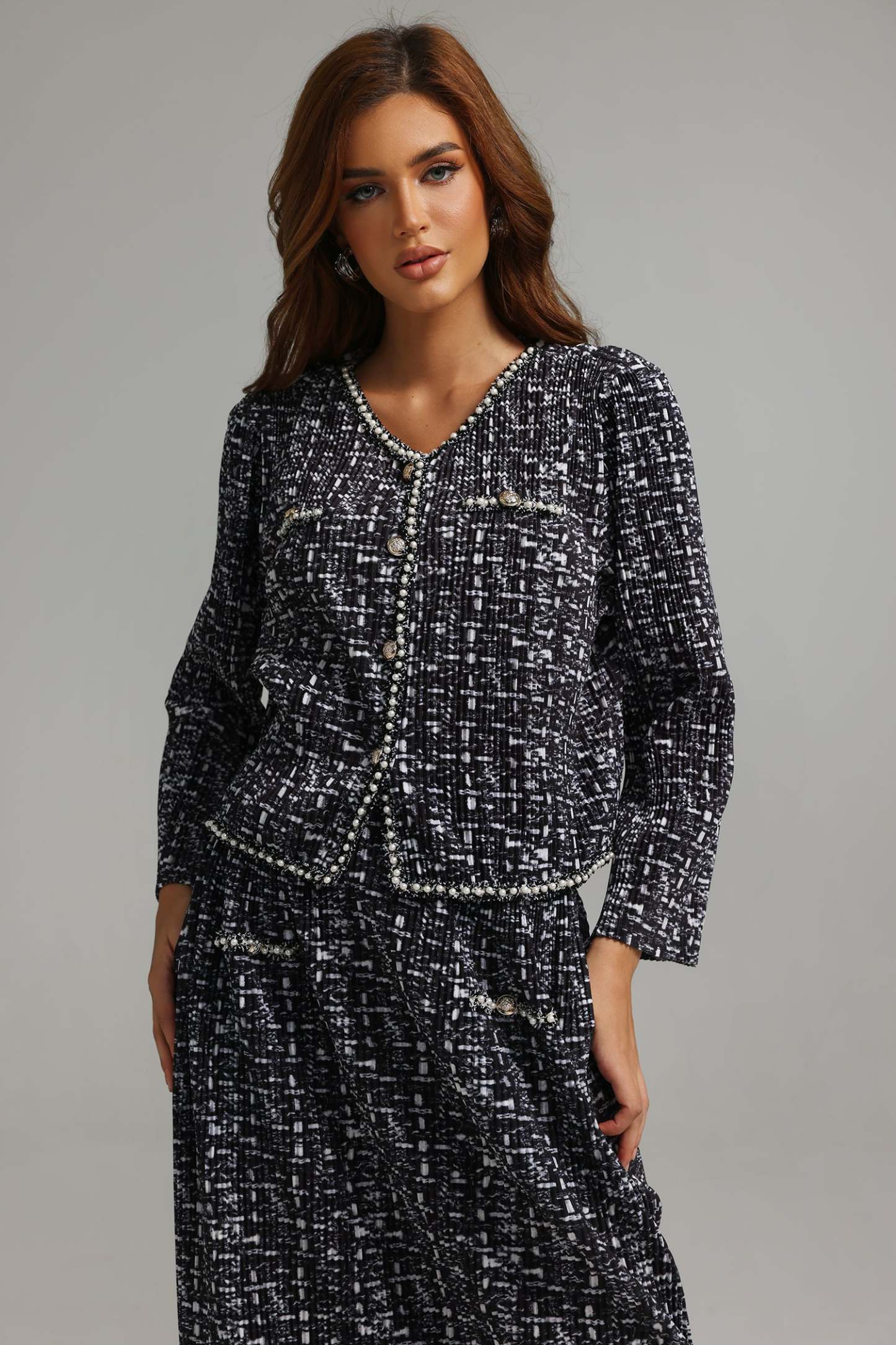 İster gündüz iş yerinizde ister akşam şık bir davette tercih edeceğiniz Lara İncili Desen Takım, rahatlığı ve şıklığı bir arada sunar. Tasarımın minimal detayları, inci işlemeleri ve zarif kesimiyle dikkat çekici bir görünüm kazanın.