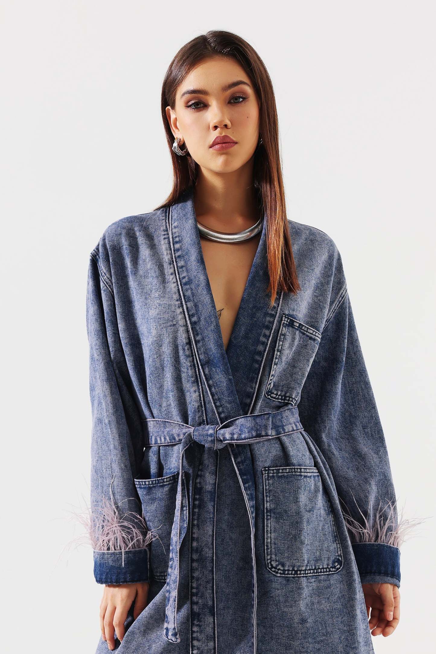 Tasarımı itibarıyla bağcıklı yakası ve tüy detaylarıyla sofistike bir görünüm sunar. Ürünümüz standart beden tablosuna uygun kesimlidir ve en iyi uyumu bulmanız için beden tablomuza göz atmanız önerilir.