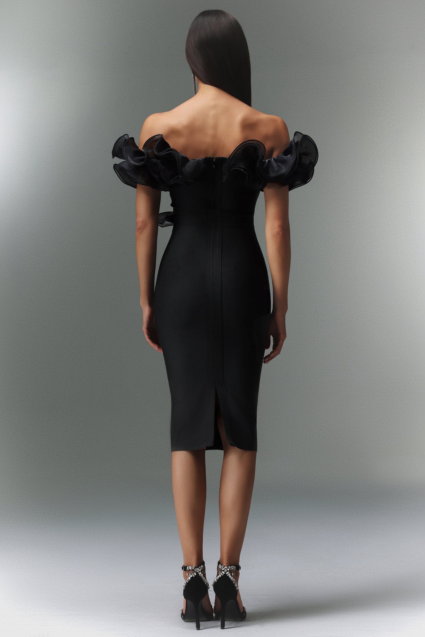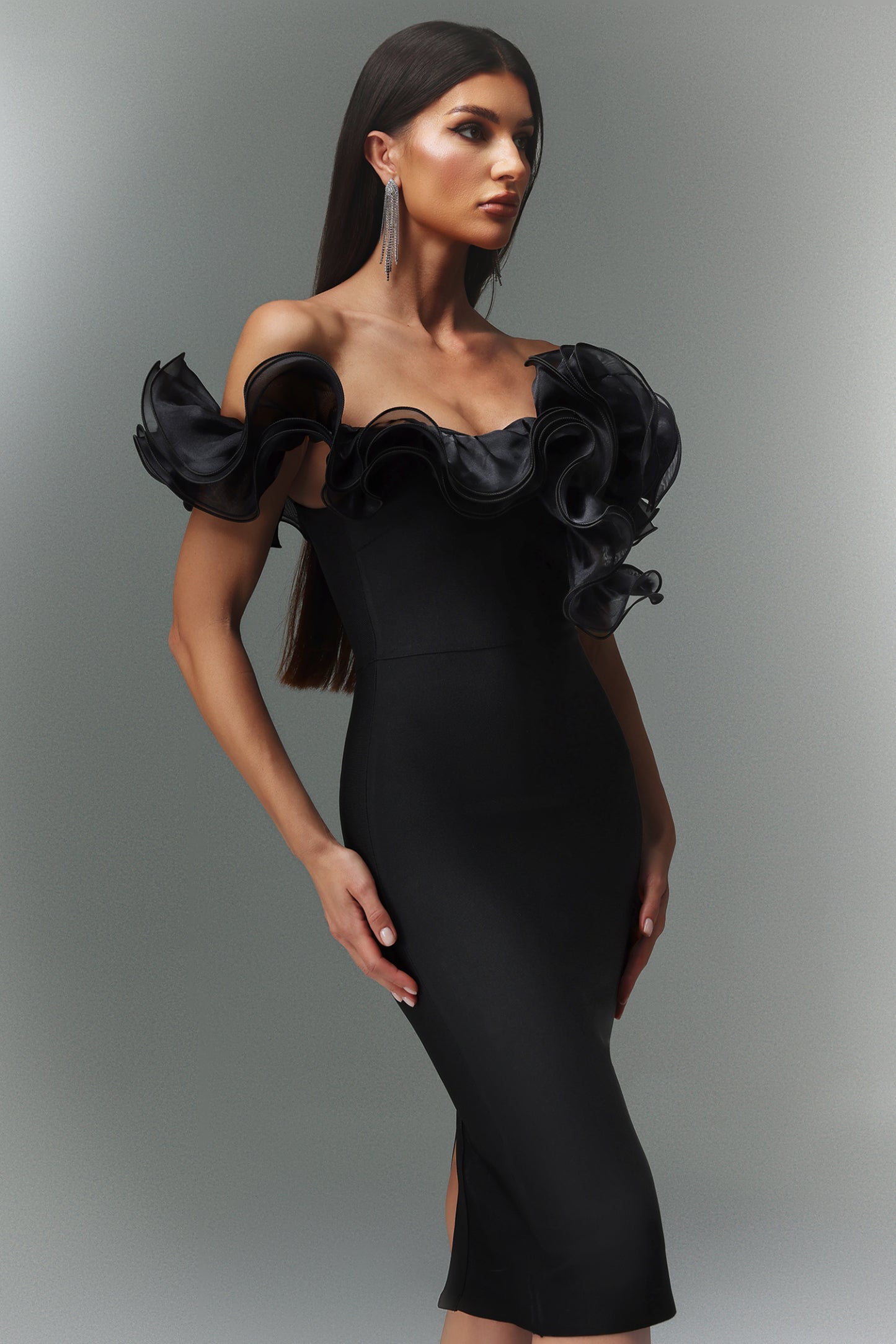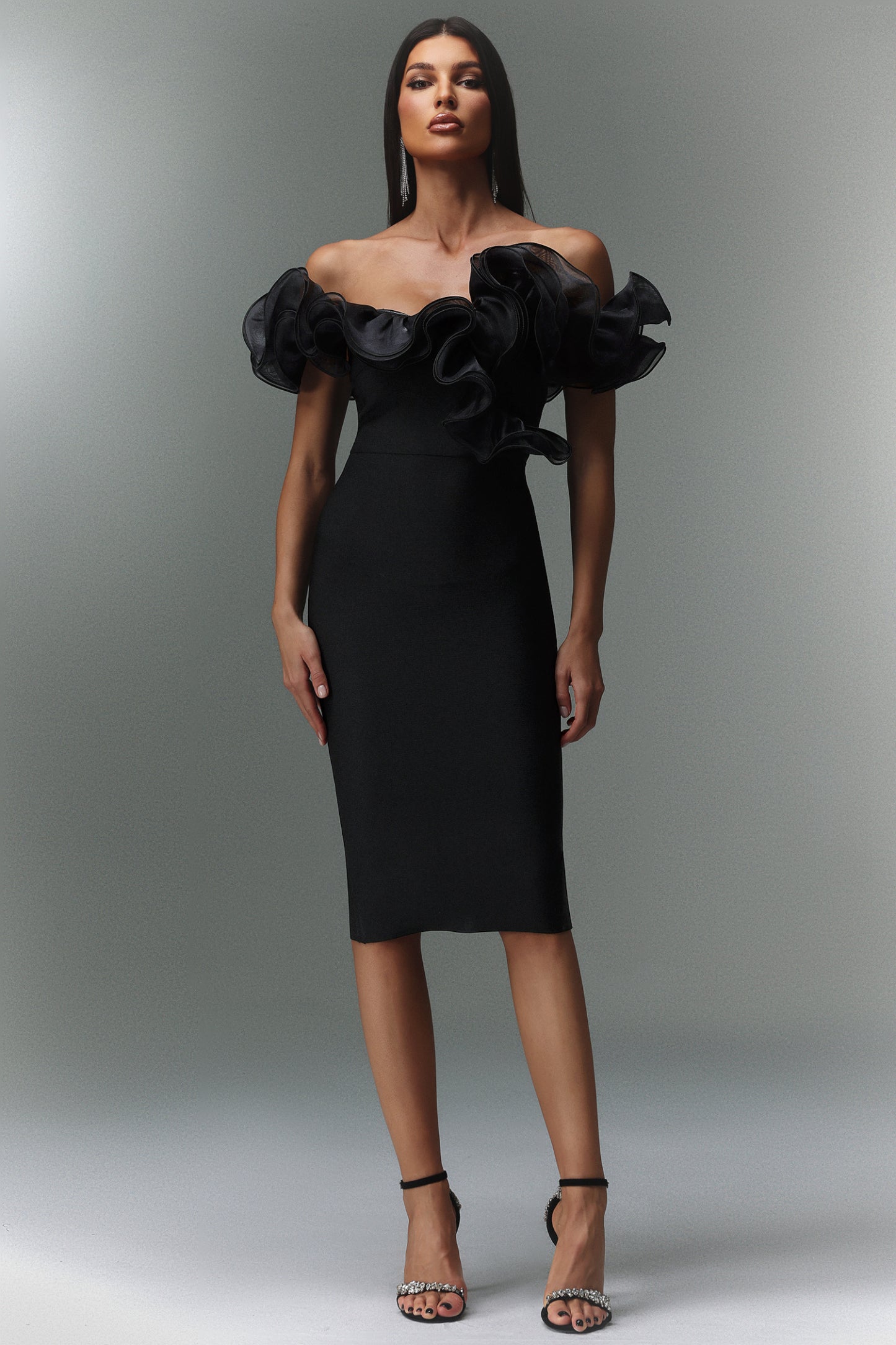 Omuzları açıkta bırakan bu midi boy bandaj elbise, volan detayları ile feminen bir cazibe sunar. S, M, L beden seçenekleri arasından vücut ölçülerinize uygun olanı seçebilirsiniz. Modelimiz S beden giymektedir ve boyu 175 cm, göğüs ölçüsü 93 cm, bel ölçüsü 65 cm, kalça ölçüsü 93 cm'dir.