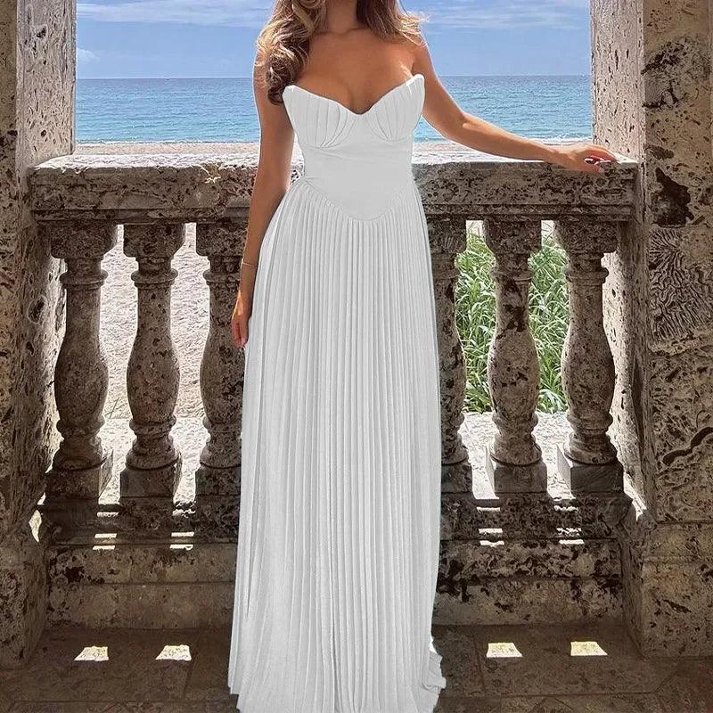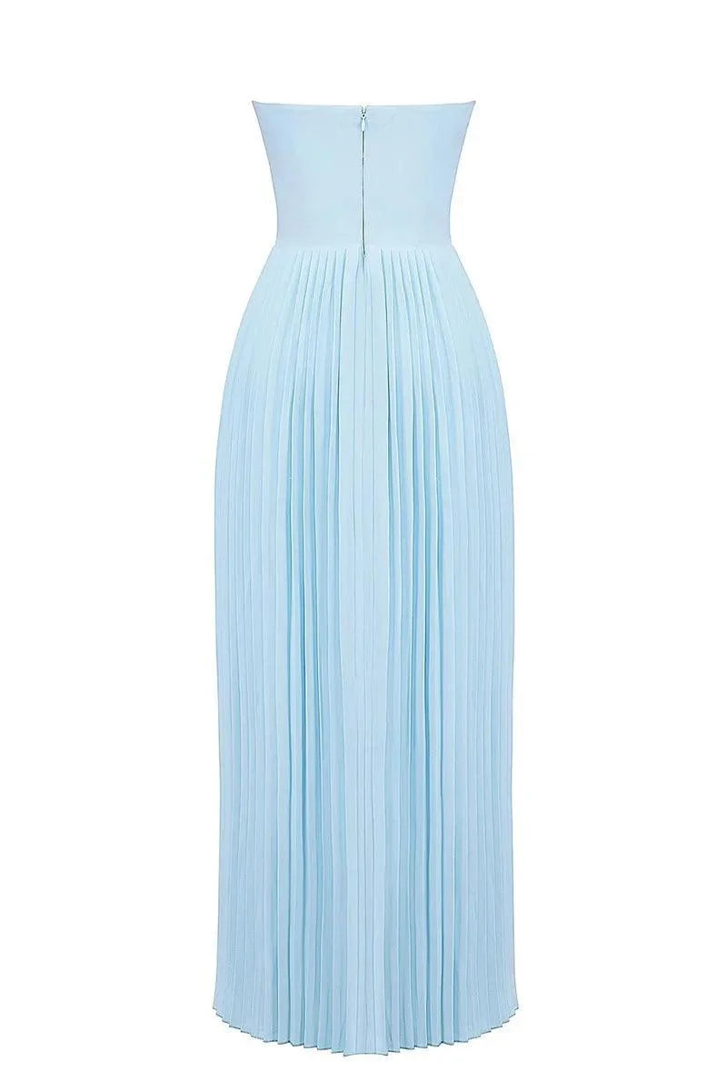 Lina elbise, zarif pilise detayları ve feminen straplez tasarımıyla göz alıcı bir şıklık sunar. Açık mavi tonuyla tazeliği ve zarafeti bir araya getiren bu maxi elbise, özel davetler ve etkinlikler için mükemmel bir seçimdir.