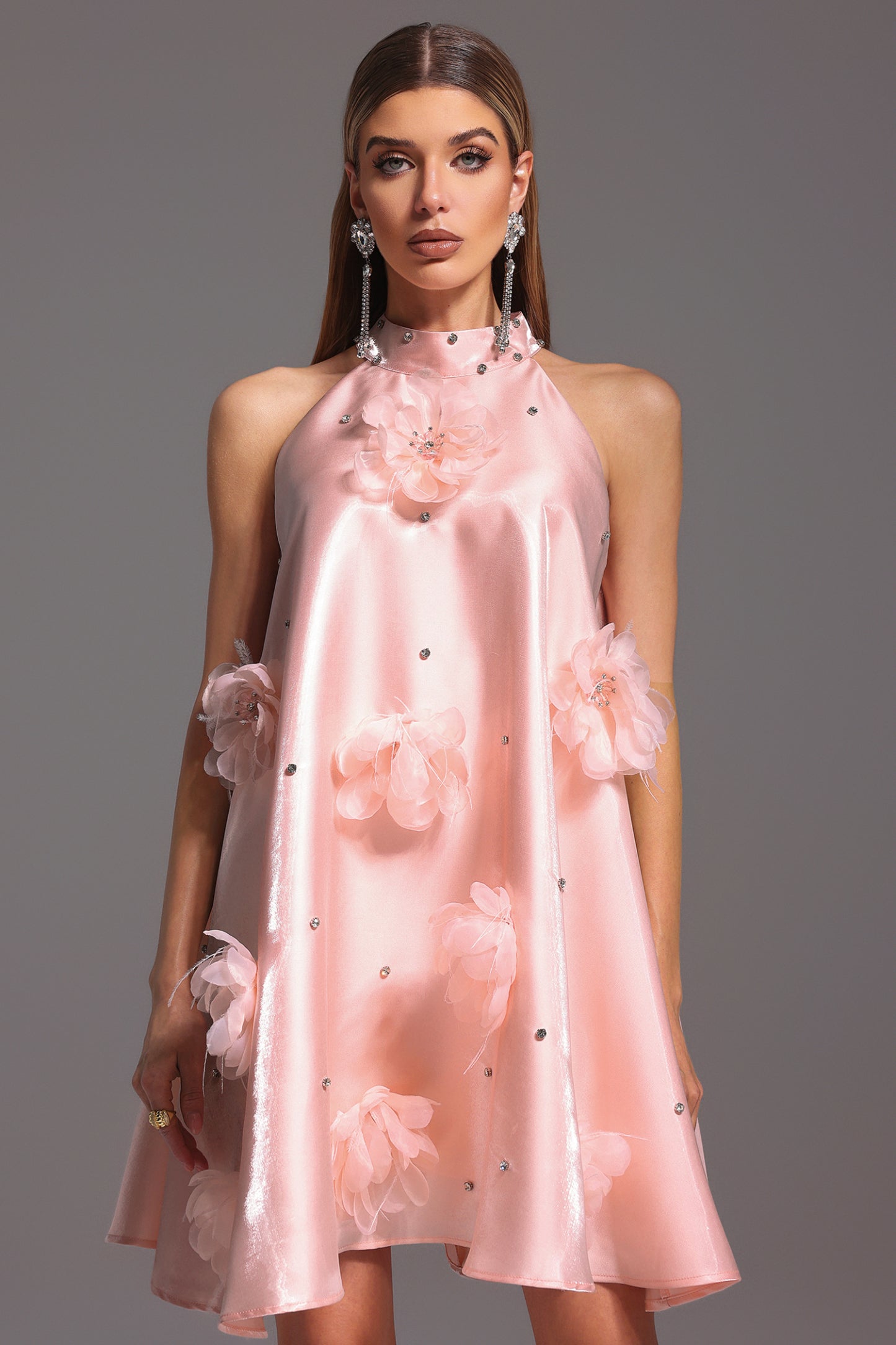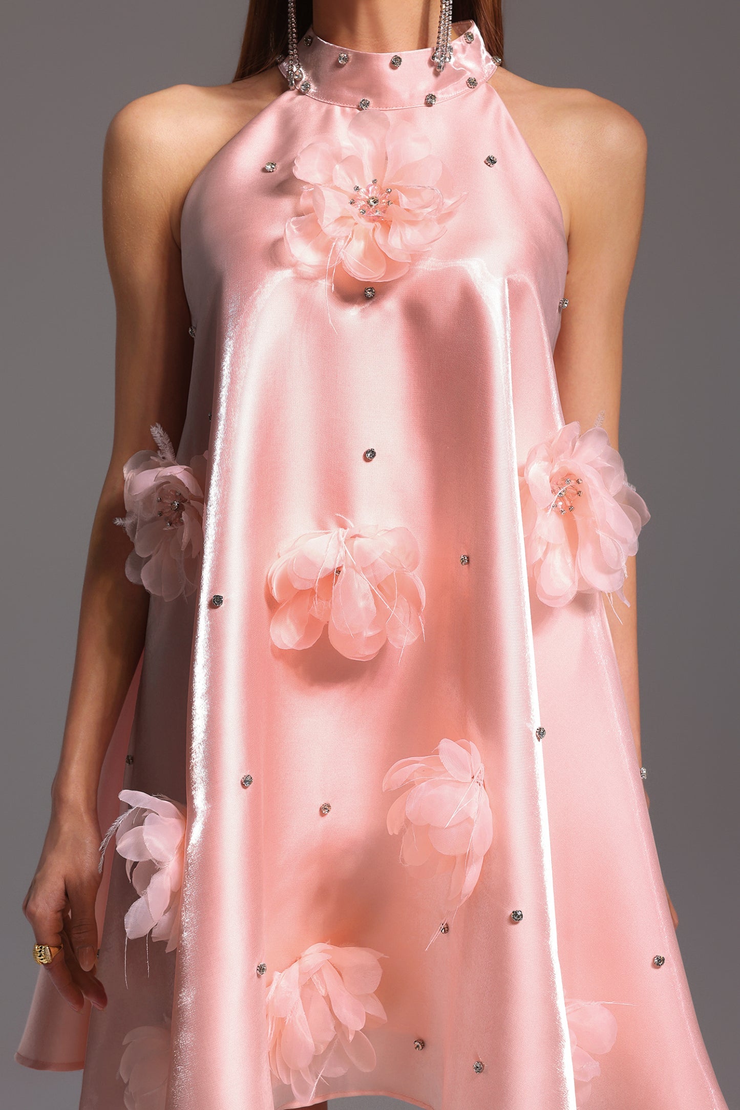 Lolic Halter Çiçek Desenli Taş Detaylı Mini Elbise