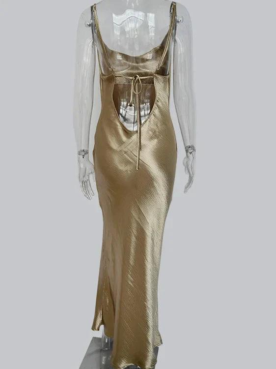 Luna elbise, parlak altın rengi ve saten dokusuyla sofistike bir görünüm sunar. İnce askılı ve zarif kesimi, gece davetlerinden özel etkinliklere kadar her ortamda şıklığınızı ön plana çıkarır. Baştan sona göz alıcı bir stil için Luna'yı tercih edin.
