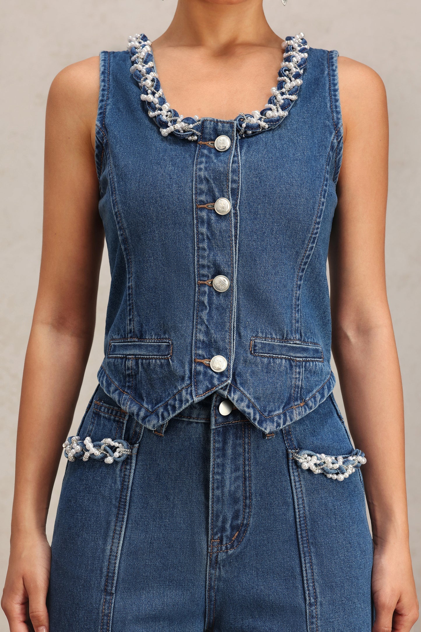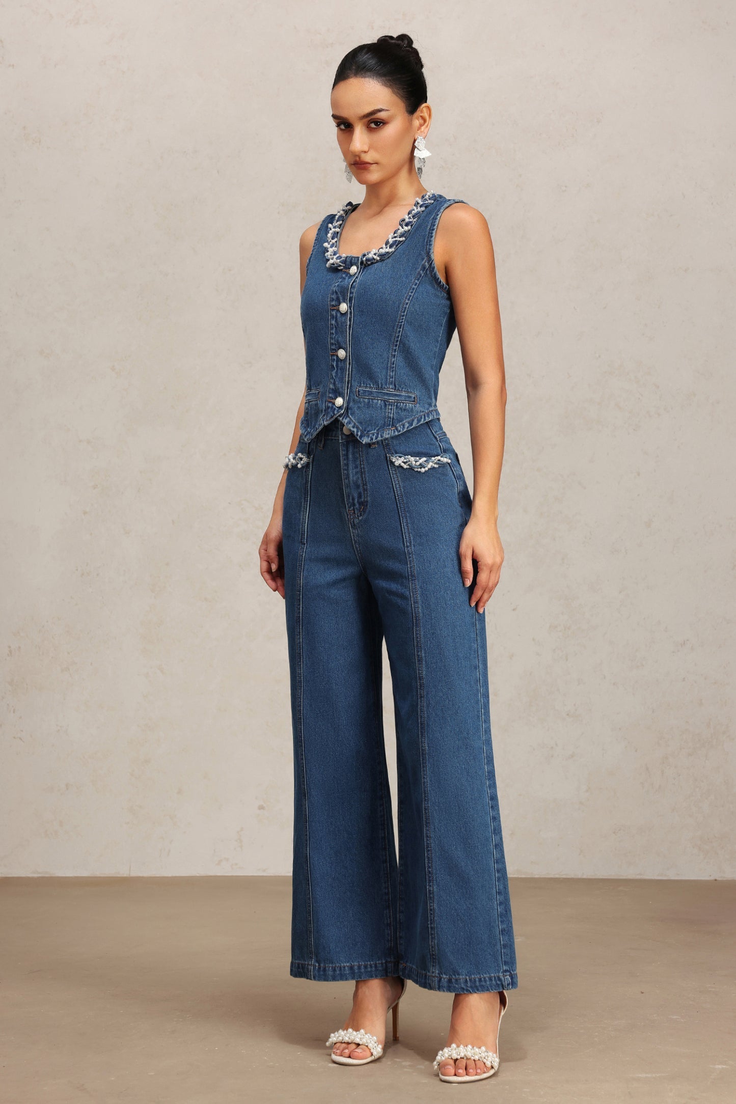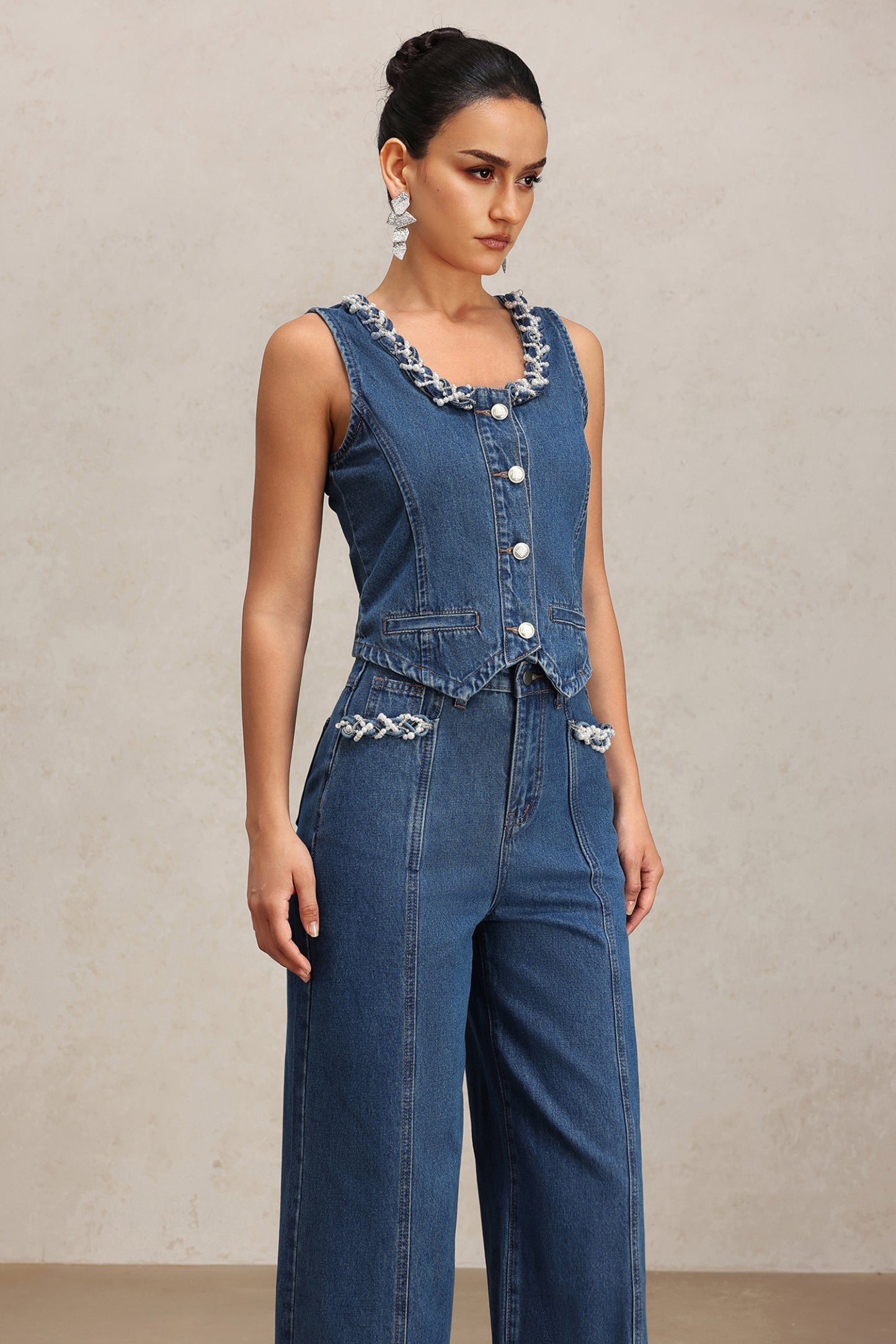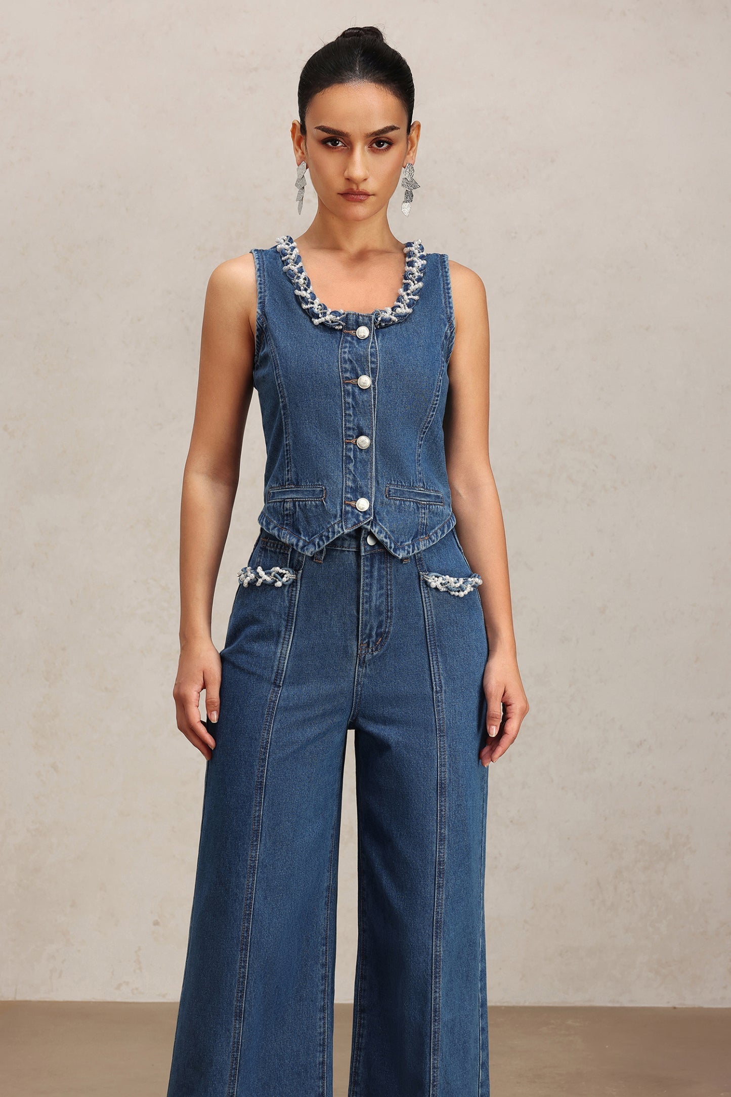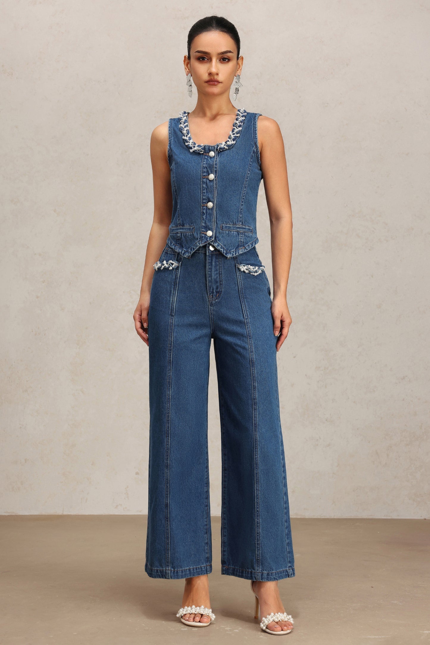 Lureen Kolsuz Denim Yelek ve Pantolon İkili Takımı, modern ve cesur tasarımı ile dolabınızın vazgeçilmezi olacak. Göz alıcı denim kumaşı, esnek yapısı sayesinde gün boyu rahatlık ve şıklık sunar. İster gündüz iş yerinizde ister gece şık bir davette kullanabileceğiniz bu ikili, her ortamda sizi ön plana çıkarır.