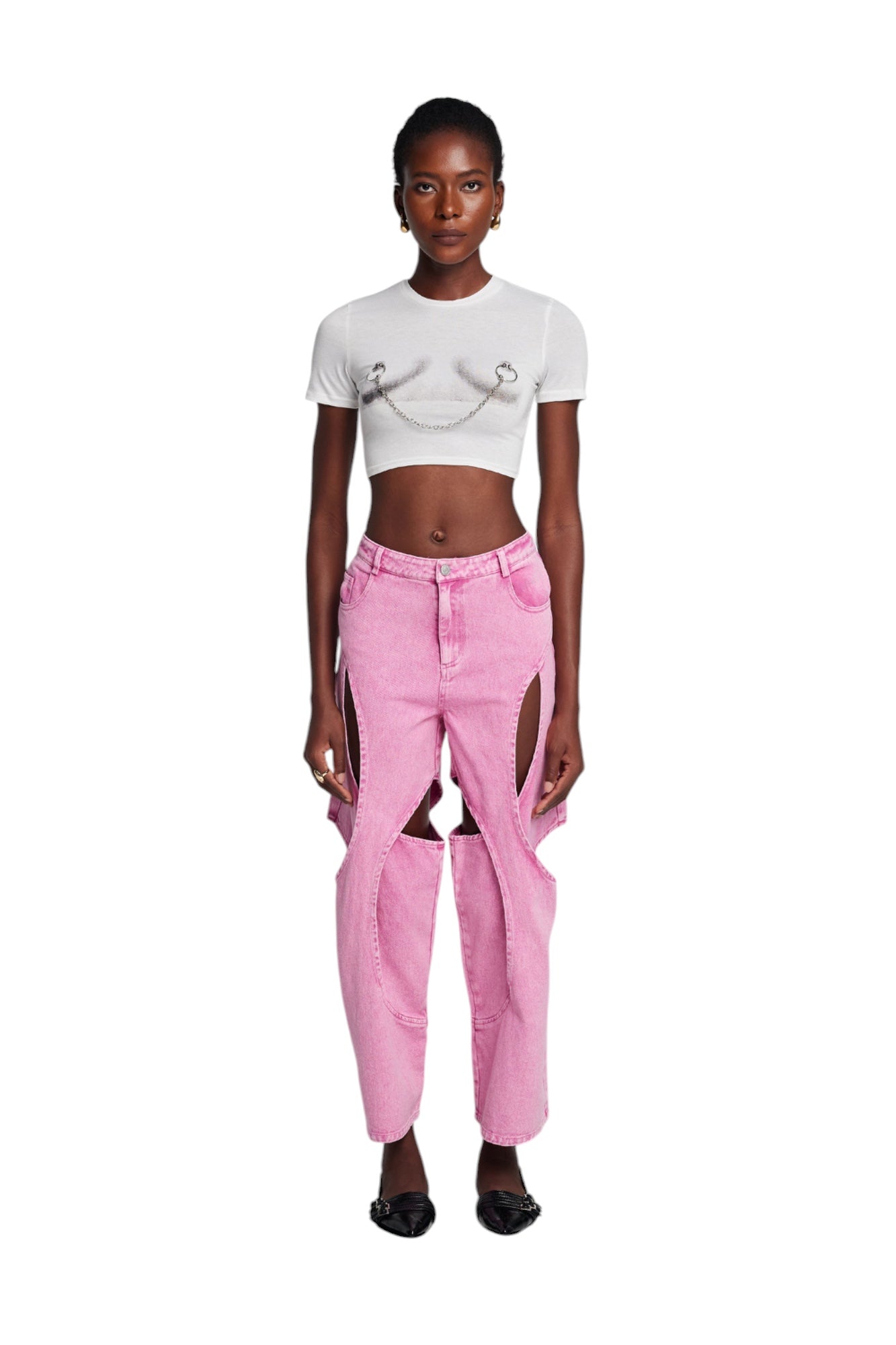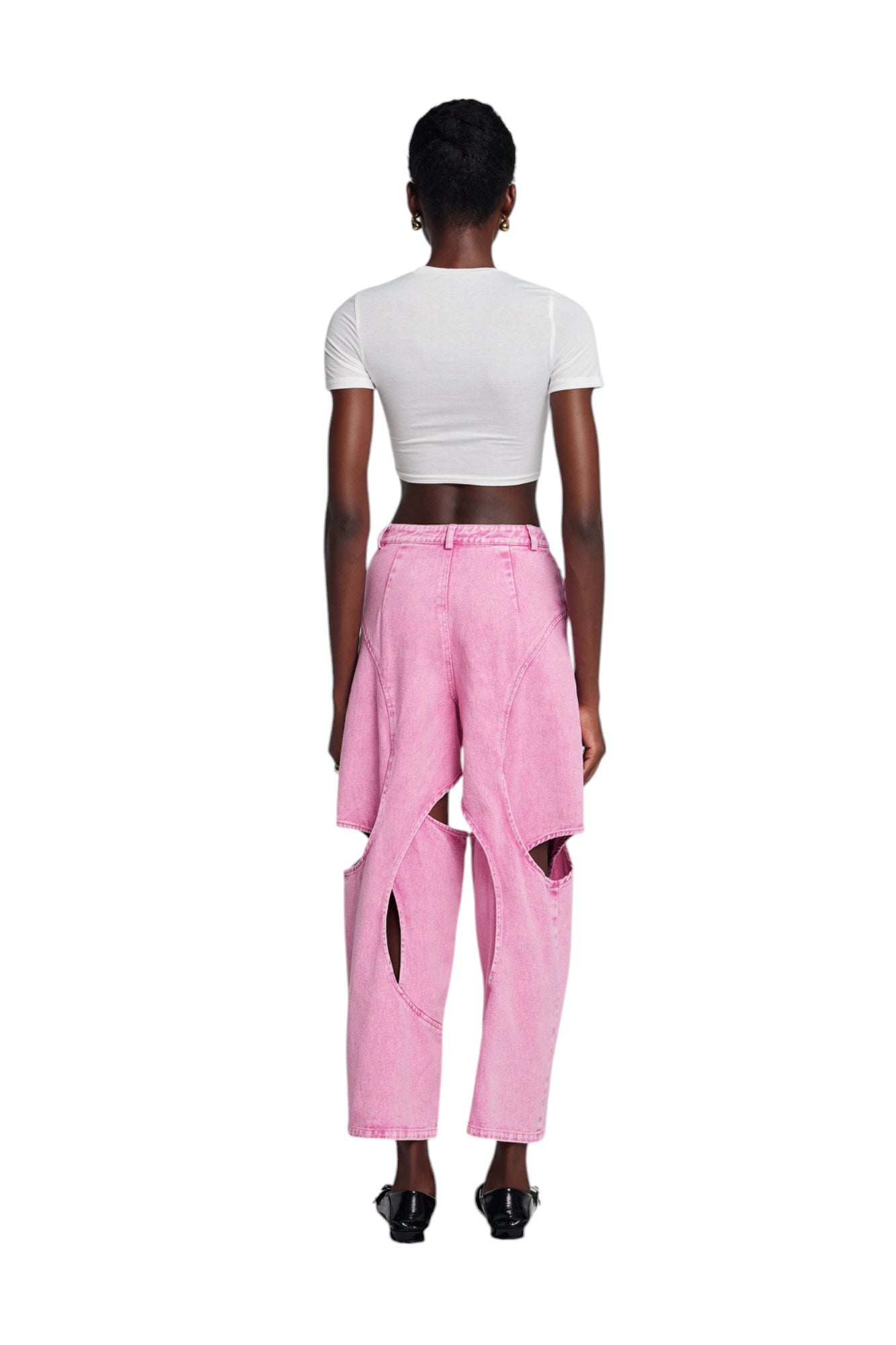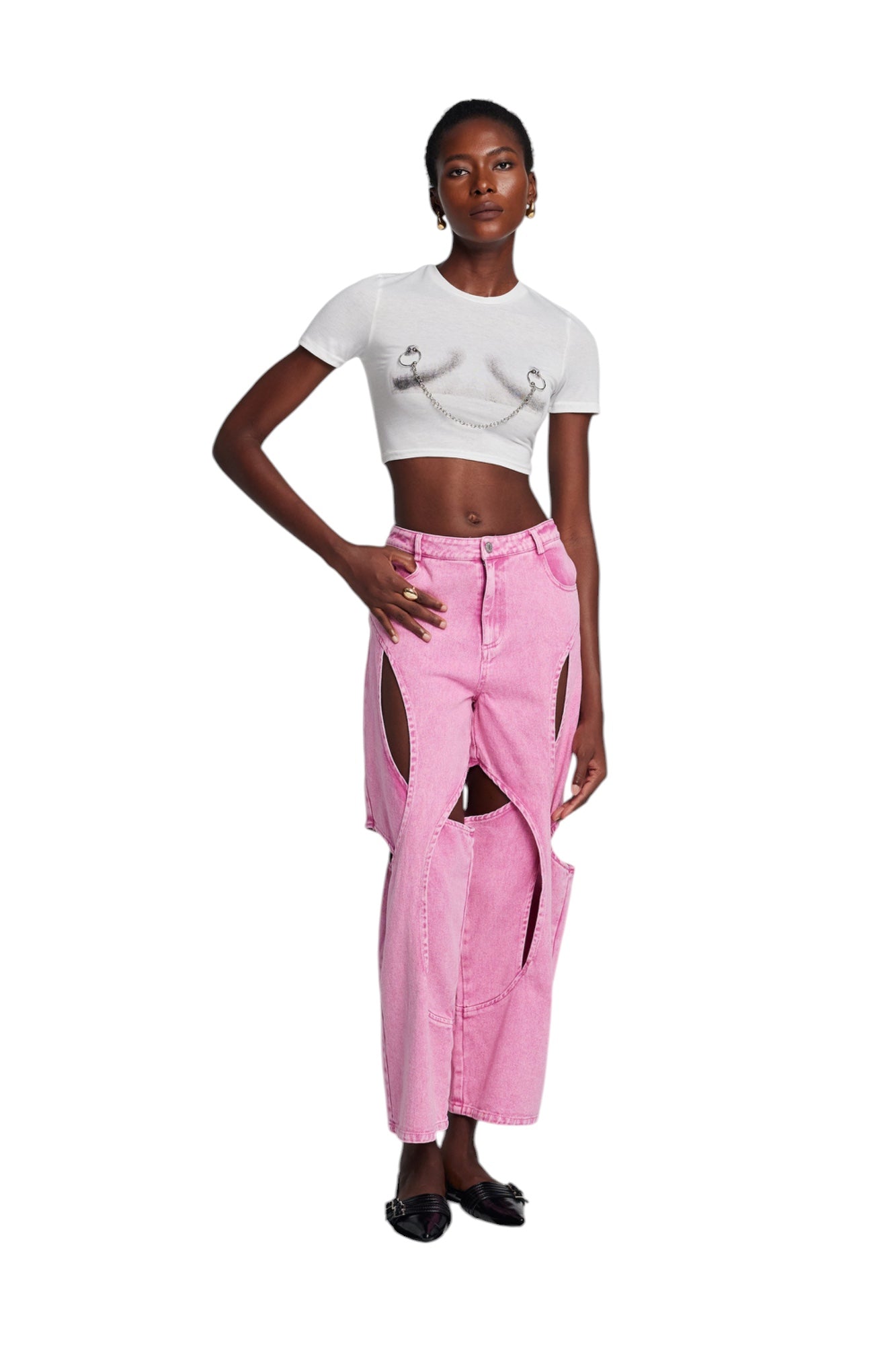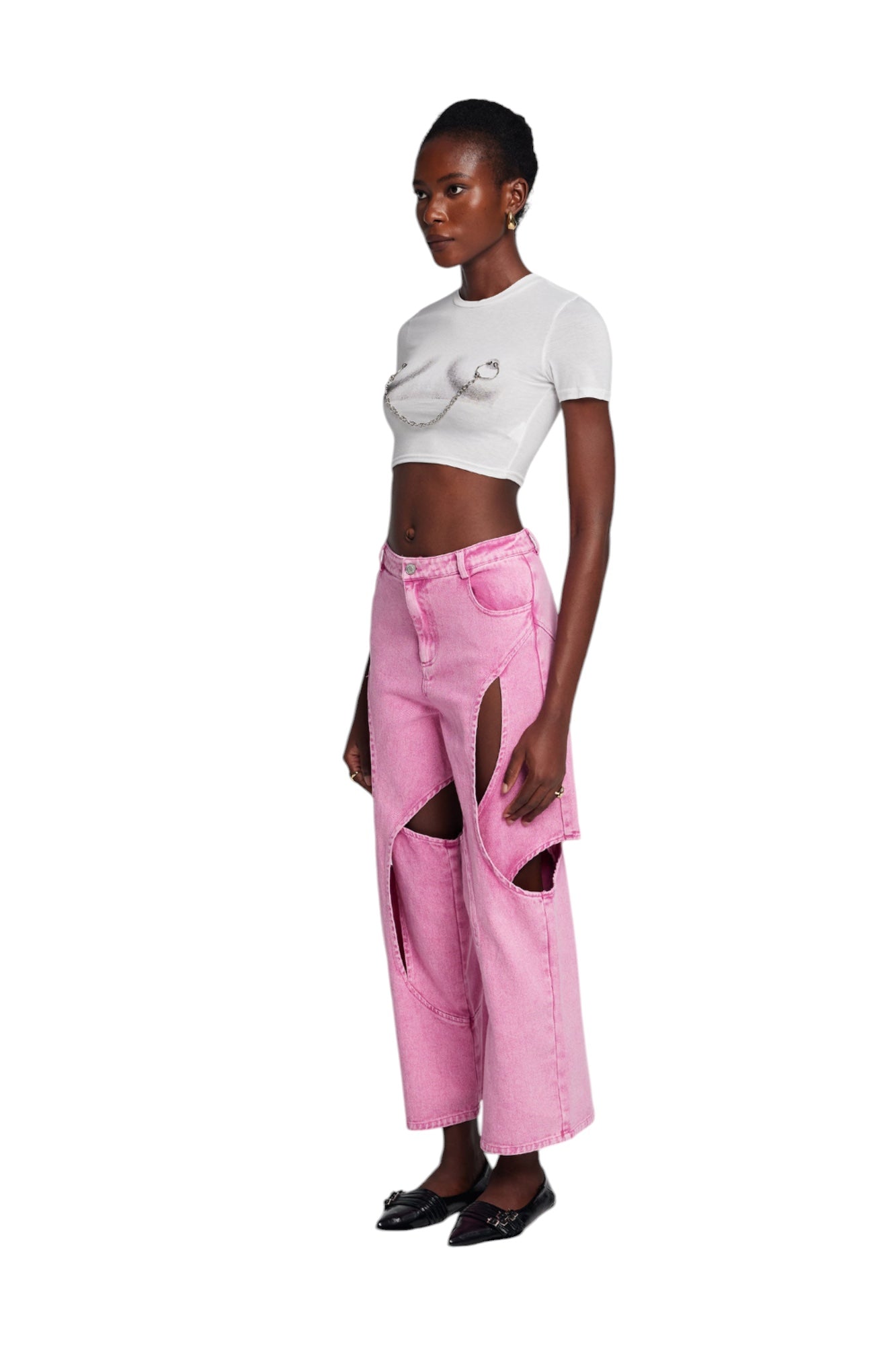 Her gardıroba şıklık ve çok yönlülük katan bir parça. Yüksek kaliteli kumaştan üretilen bu pantolonlar, cesur ve farklı bir tarz sunan özel boşluklu haç tasarımına sahiptir. Rahat kesimi ve vücuda oturan siluetiyle her ortam için mükemmel bir seçimdir. Gardırobunuza şık bir dokunuş getirecek.